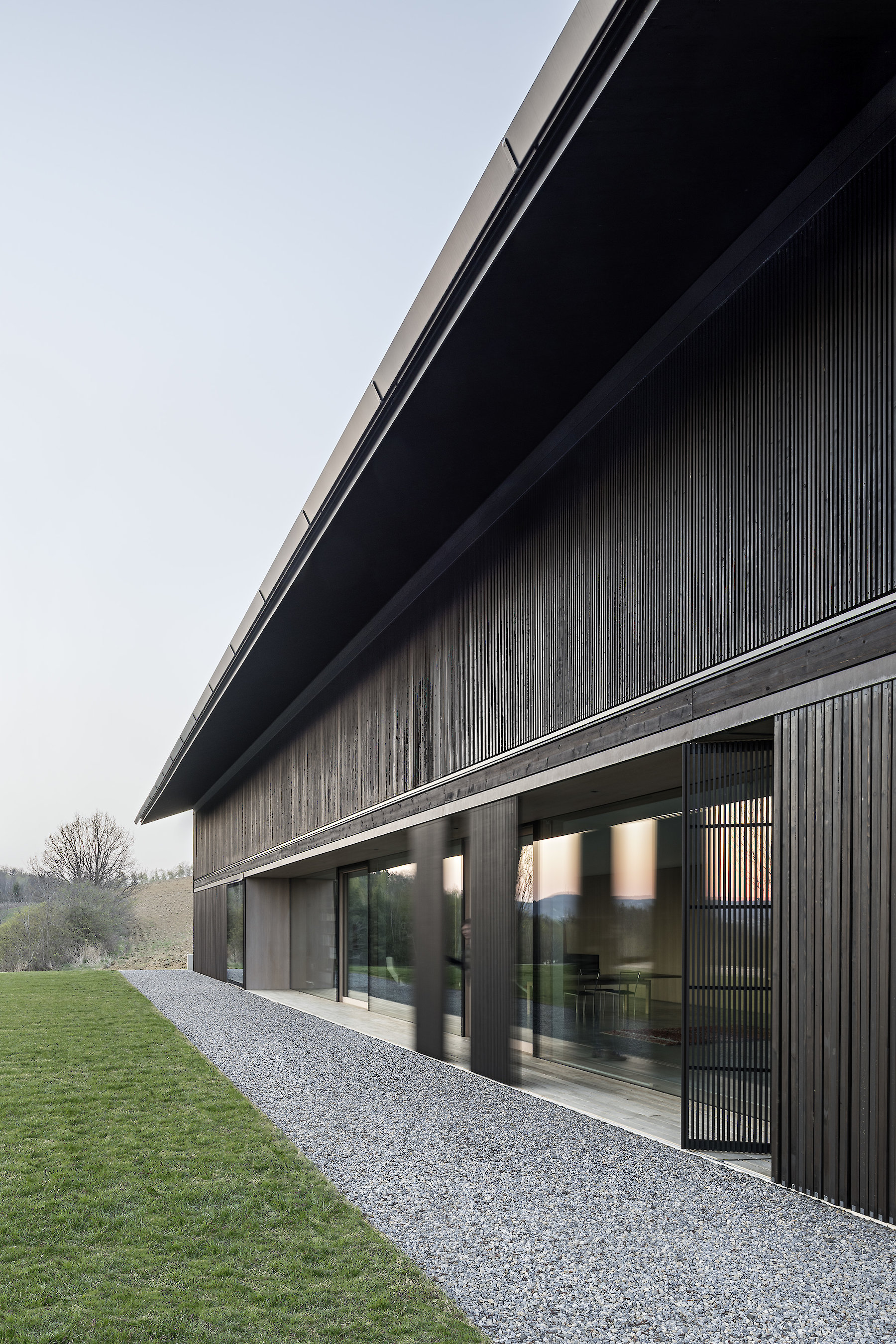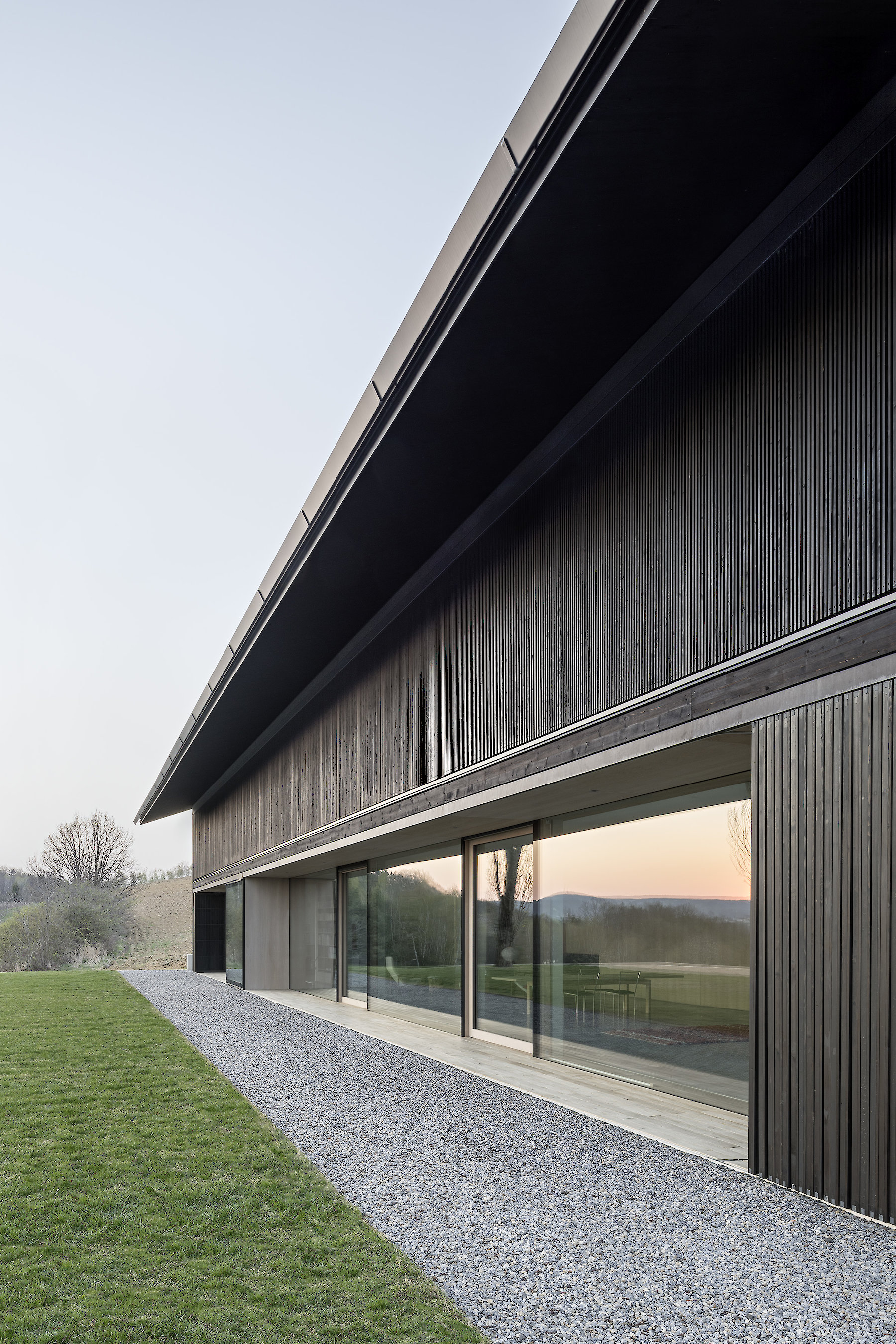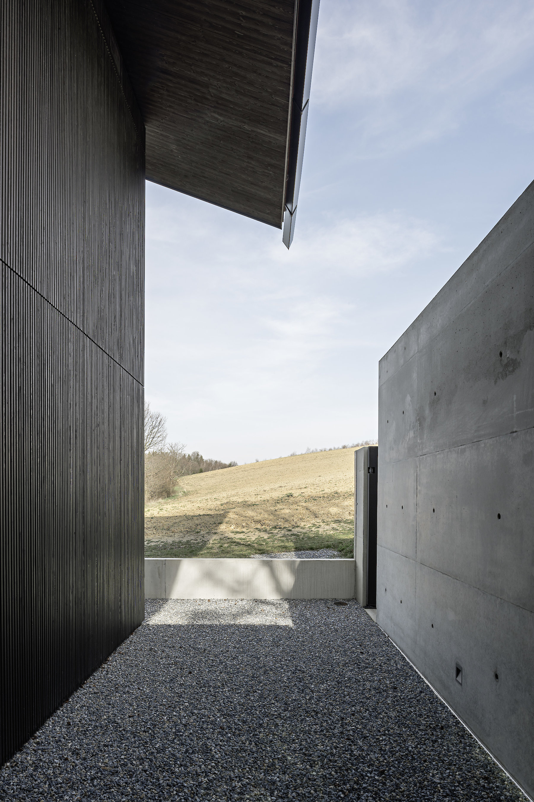 In the hilly landscape of the Prekmurje in the north of Slovenia, the House v.d.K is oriented lengthwise in a south-westerly direction along the terrain. The building that formerly occupied this location has left a trace forming a topographical incision in the slope; this has been taken up in the new project, and in this form helps to determine the arrangement of the building within the boundaries of the plot. The building is integrated directly in the surrounding natural space, opening up to its expanse. Individual utility structures spatially demarcate it from the neighbourhood, which in turn demarcates itself from the surroundings using the same architectural means. In this way we see the traditional attempt to establish a degree of openness within a framework of loosely connected buildings, while at the same time maintaining privacy vis-à-vis the surroundings.