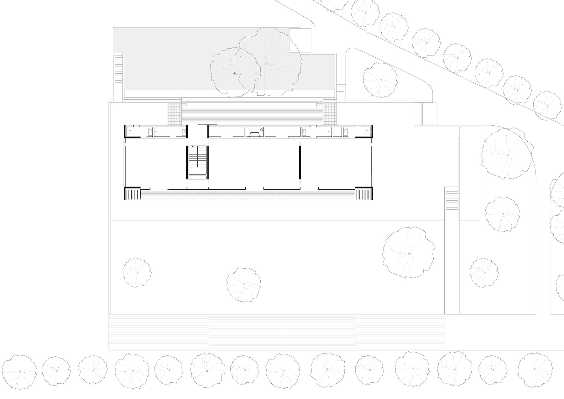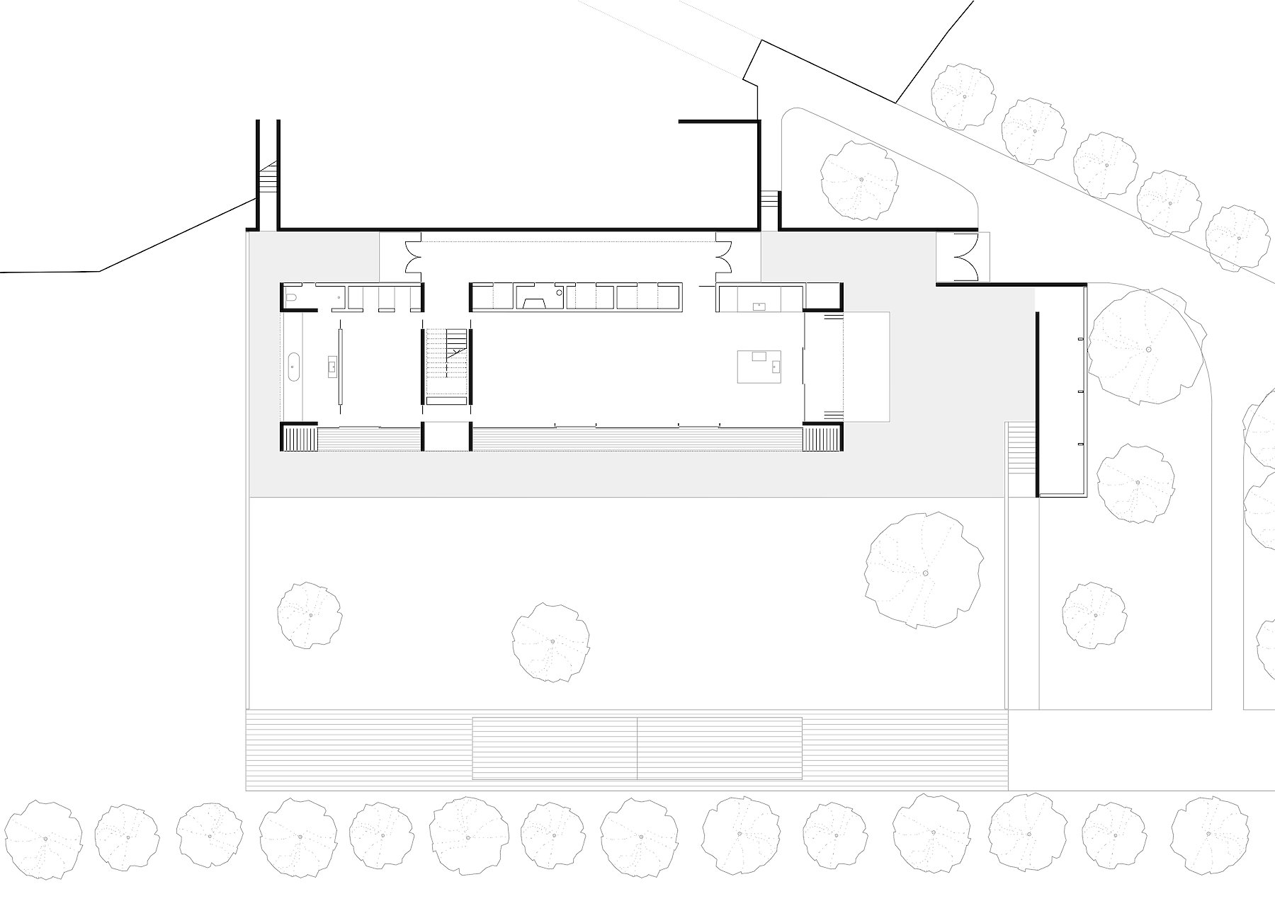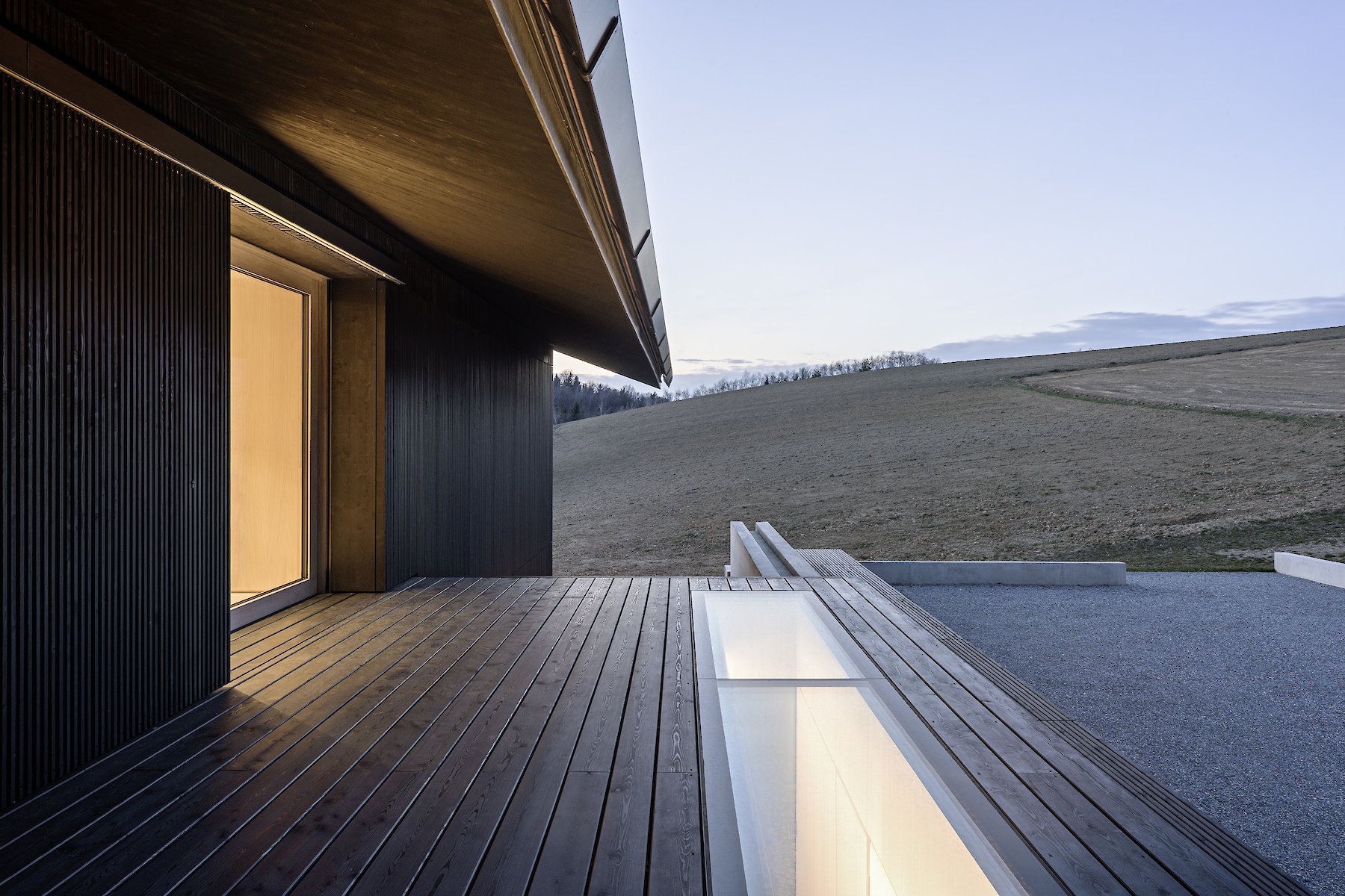 In the hilly landscape of the Prekmurje in the north of Slovenia, the House v.d.K is oriented lengthwise in a south-westerly direction along the terrain. The building that formerly occupied this location has left a trace forming a topographical incision in the slope; this has been taken up in the new project, and in this form helps to determine the arrangement of the building within the boundaries of the plot. The building is integrated directly in the surrounding natural space, opening up to its expanse. Individual utility structures spatially demarcate it from the neighbourhood, which in turn demarcates itself from the surroundings using the same architectural means. In this way we see the traditional attempt to establish a degree of openness within a framework of loosely connected buildings, while at the same time maintaining privacy vis-à-vis the surroundings.