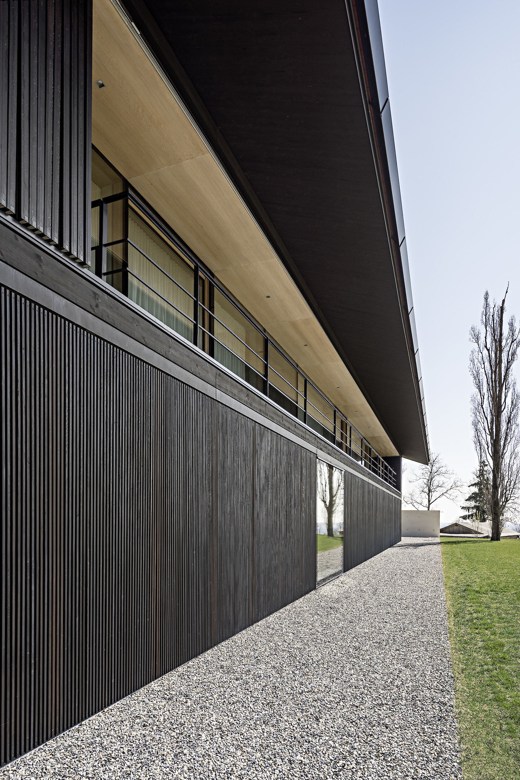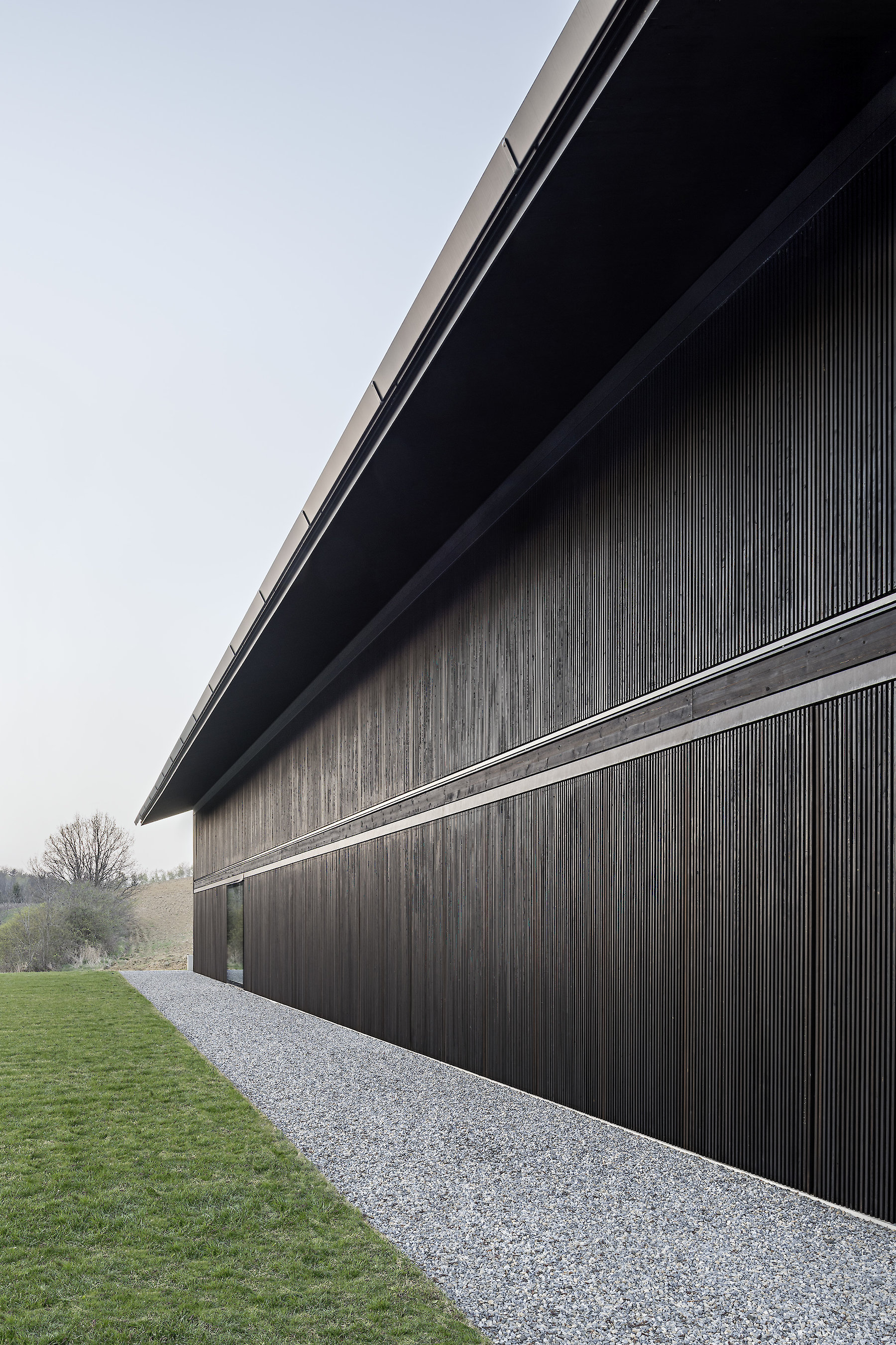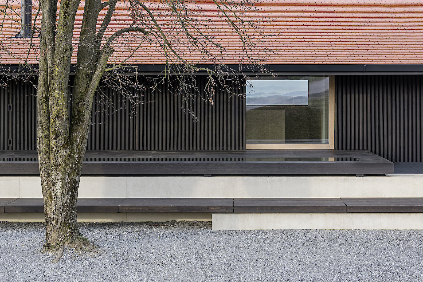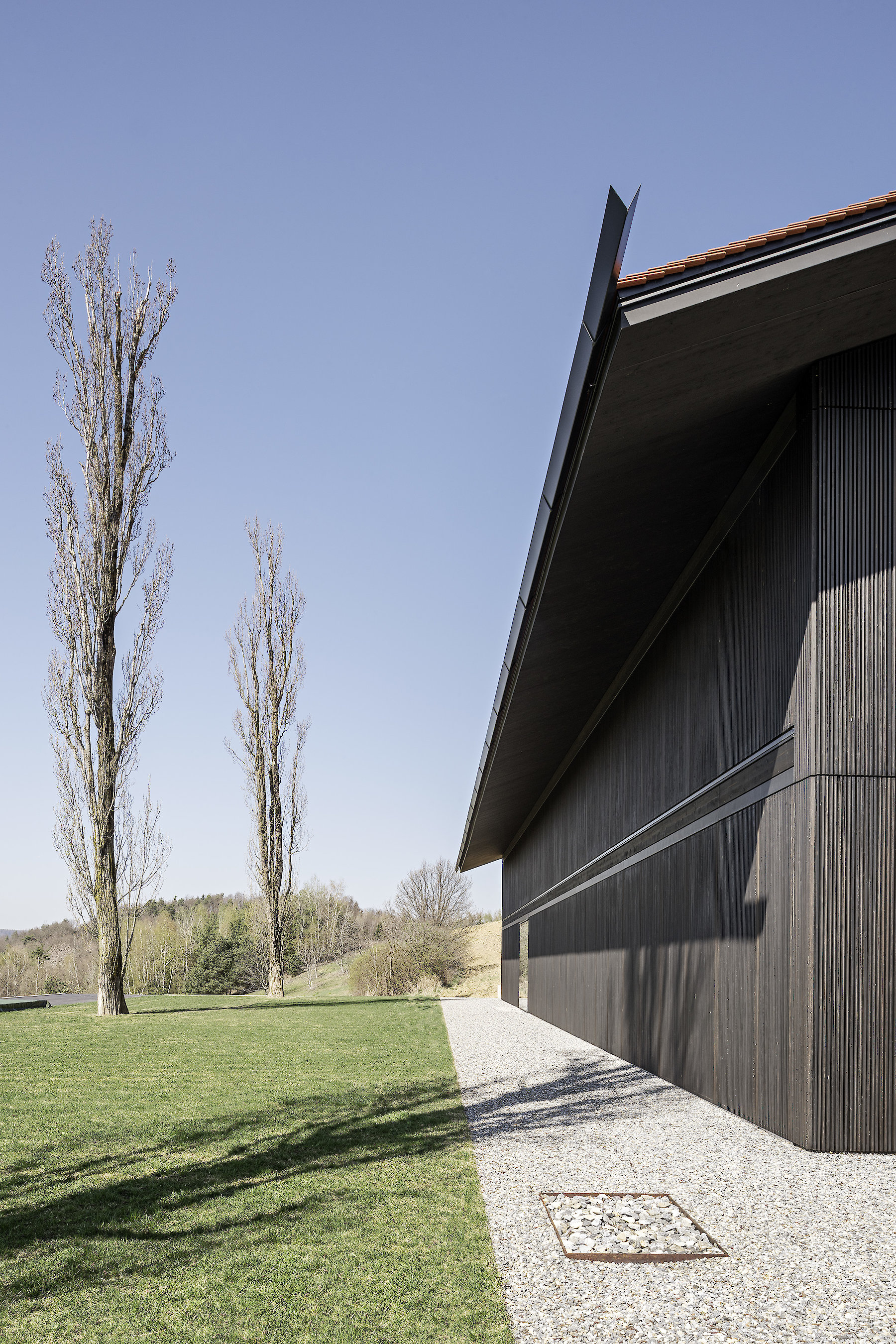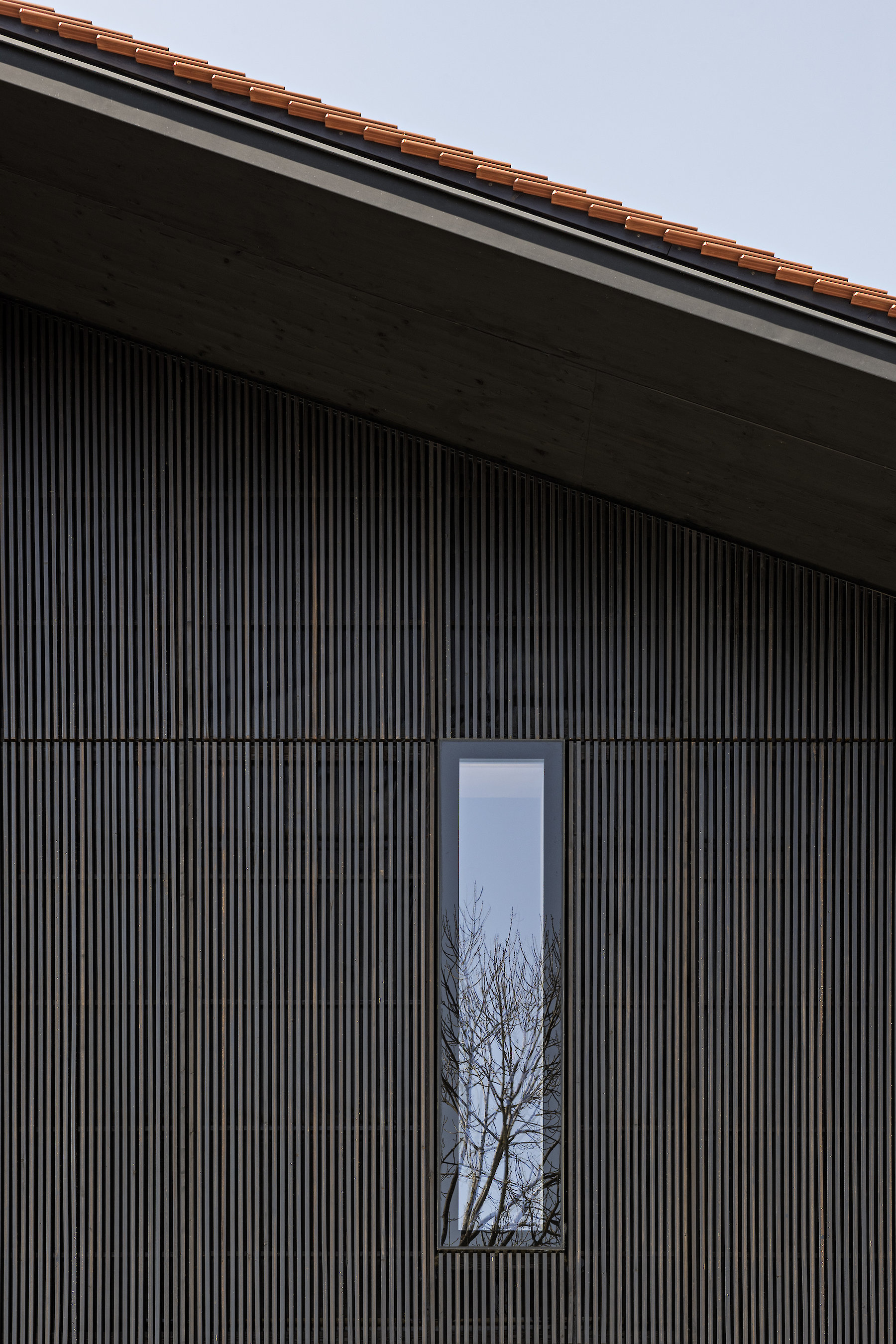 The projecting eaves can be understood as suitable protection for the timber construction and facade structure against the weather. The pitched roof is covered in tiles made of clay, a characteristic material all over the hilly region, and one whose colour and visible texture is present in the landscape far and wide.