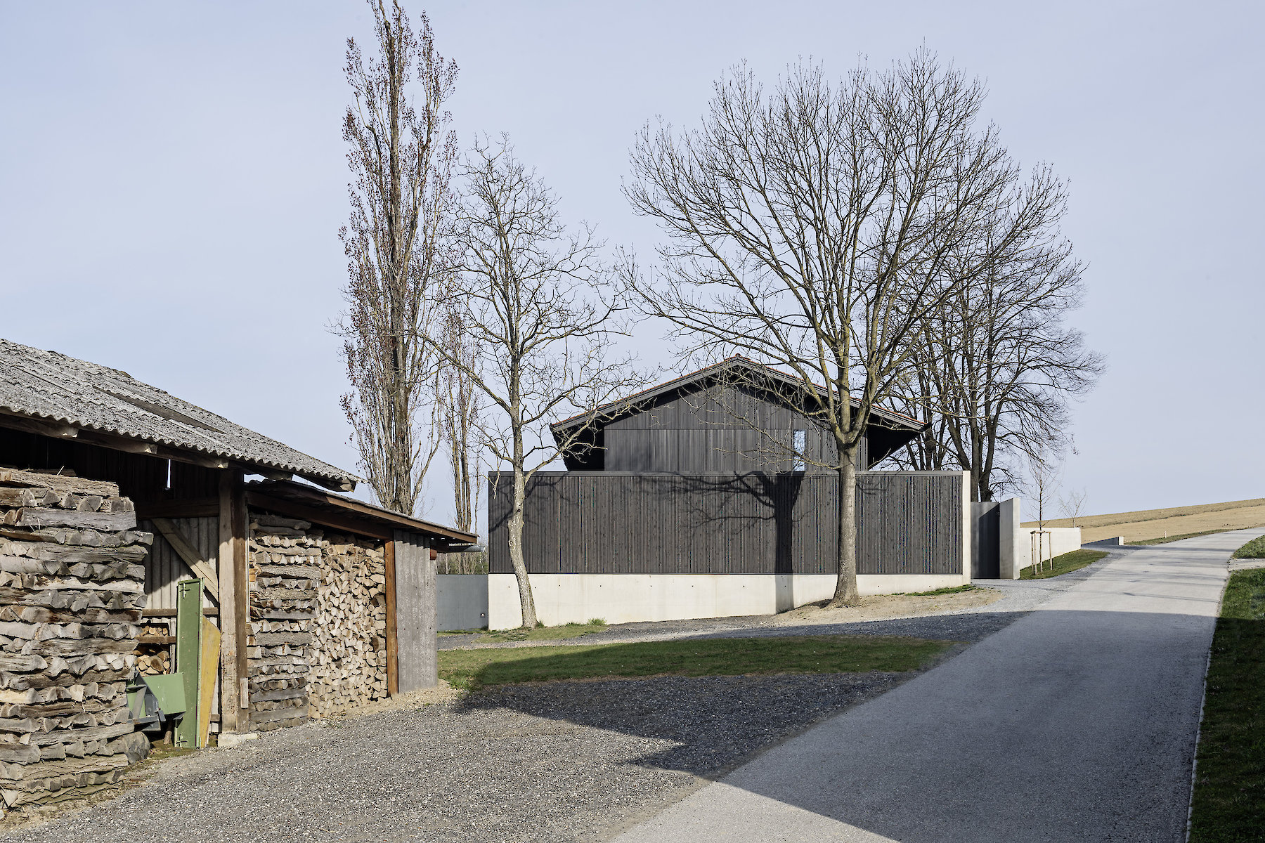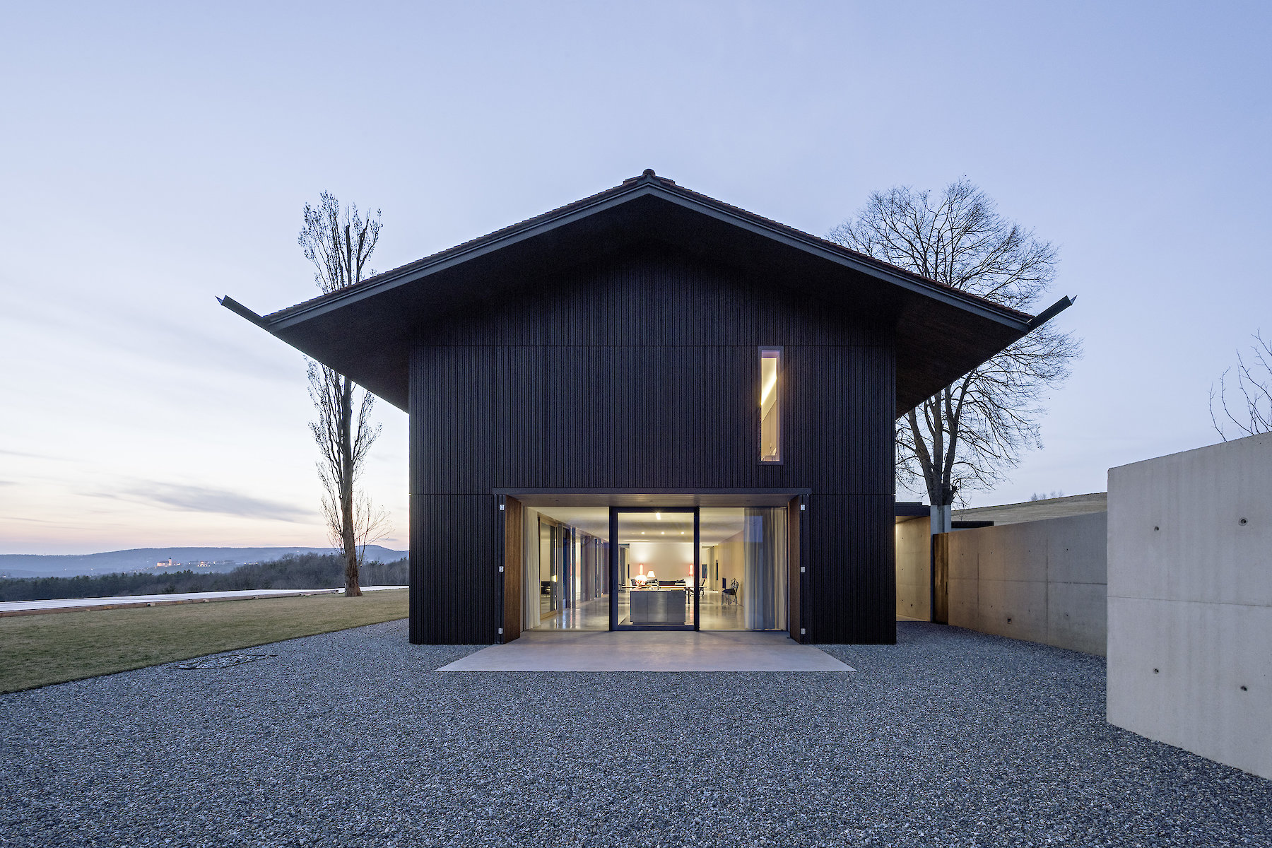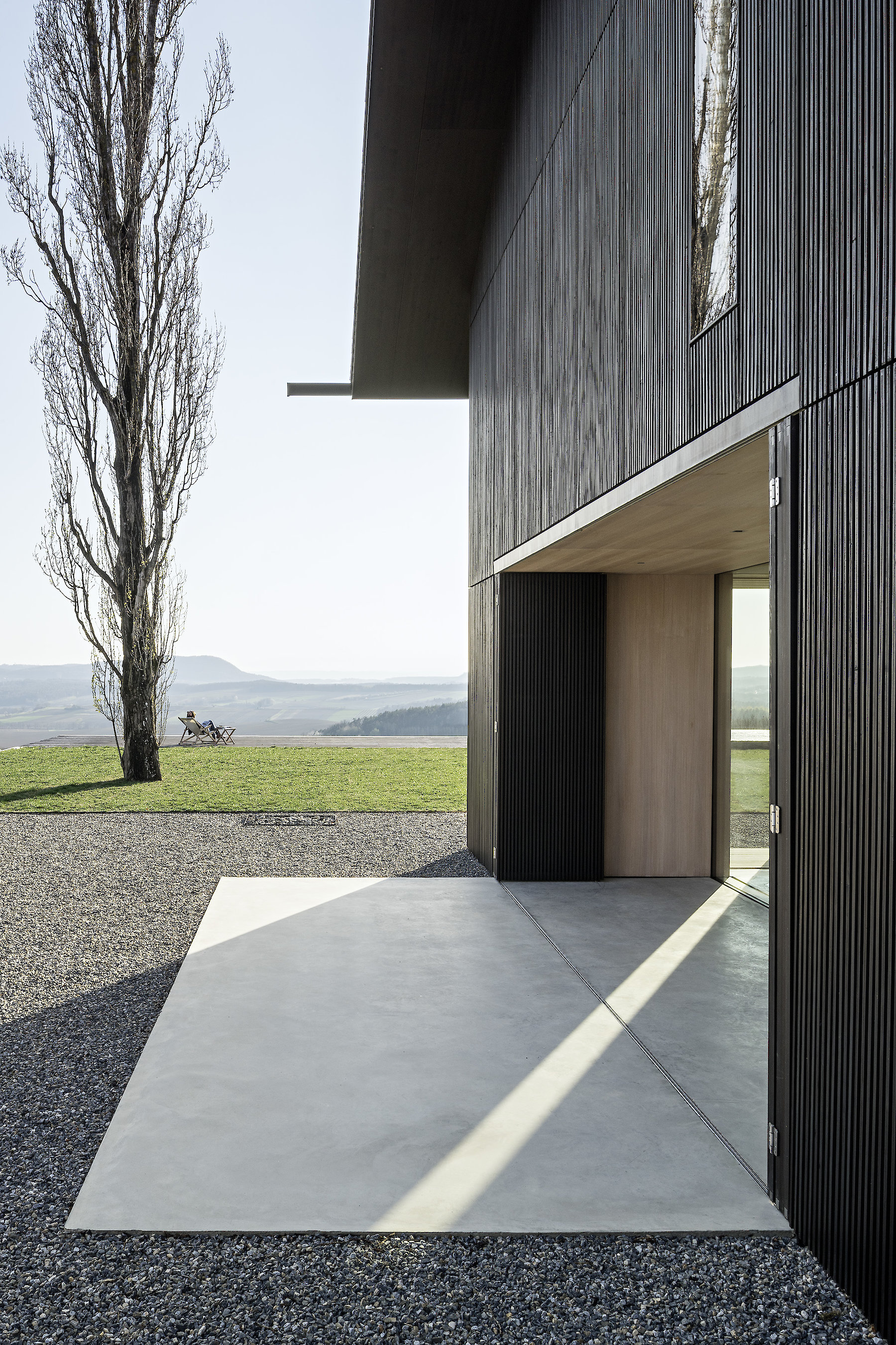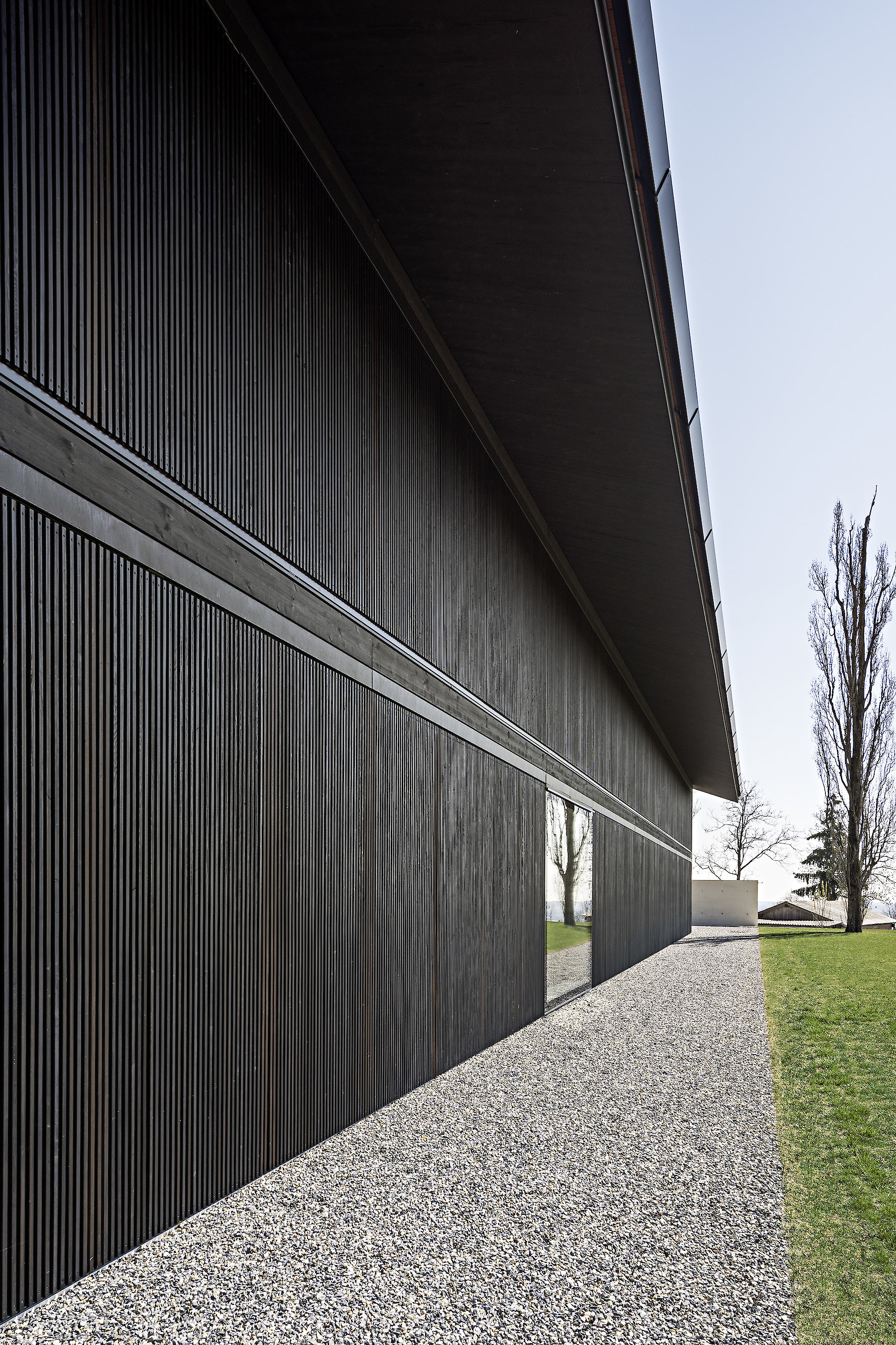 The projecting eaves can be understood as suitable protection for the timber construction and facade structure against the weather. The pitched roof is covered in tiles made of clay, a characteristic material all over the hilly region, and one whose colour and visible texture is present in the landscape far and wide.