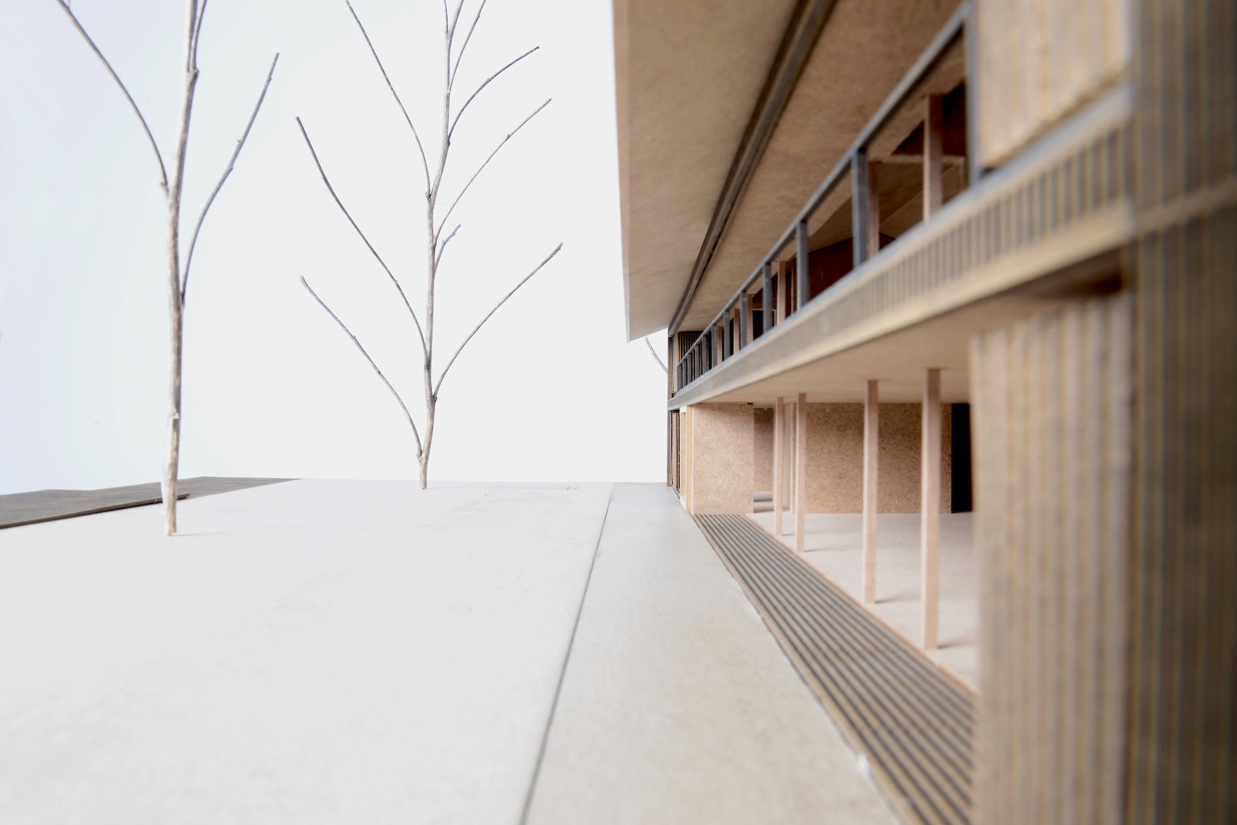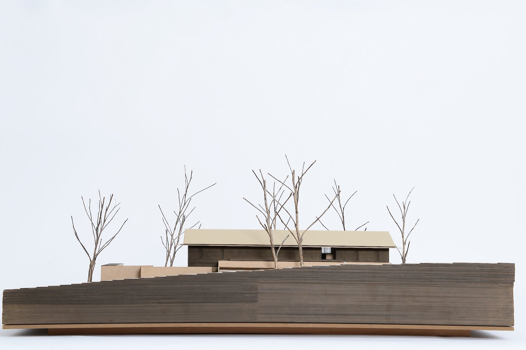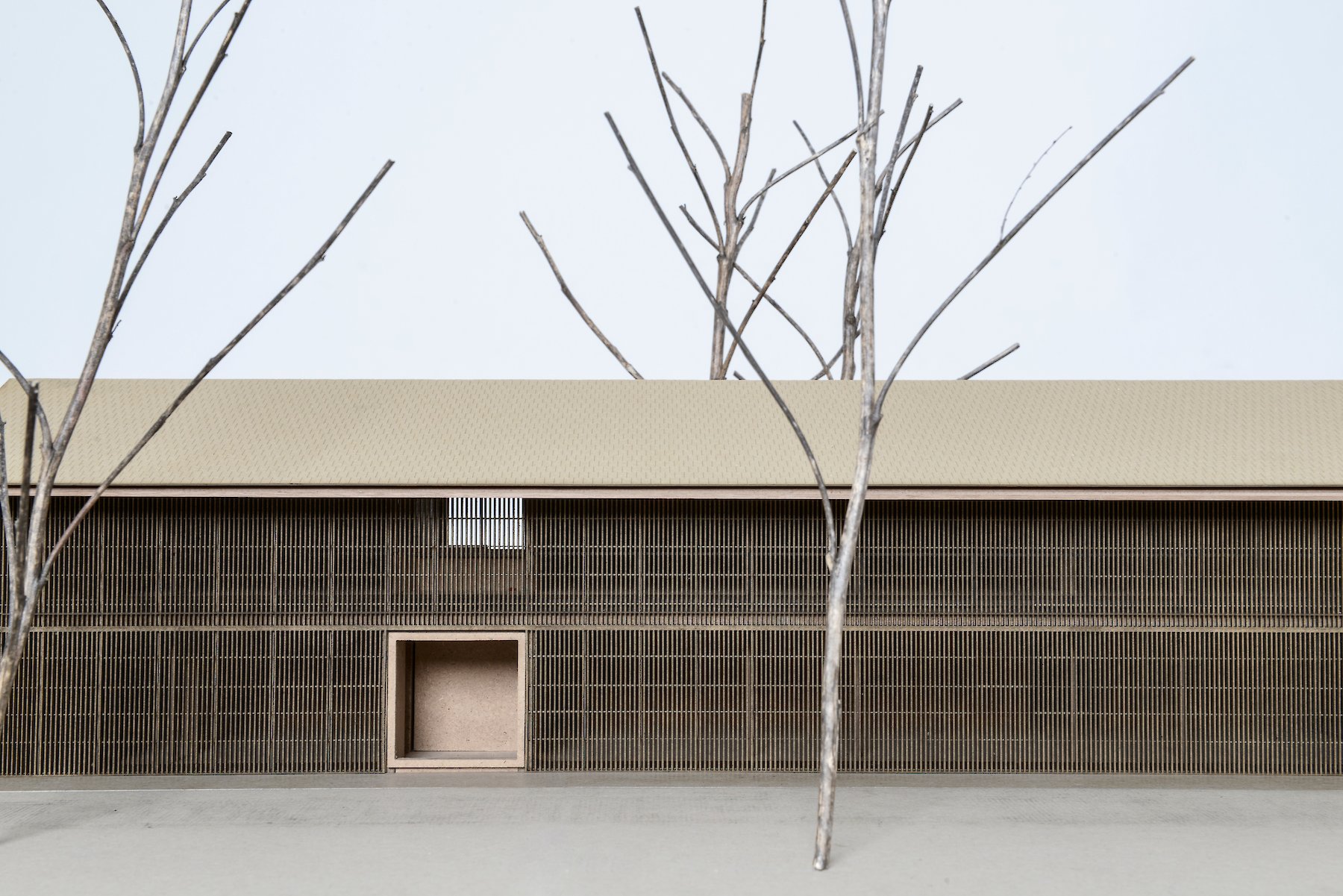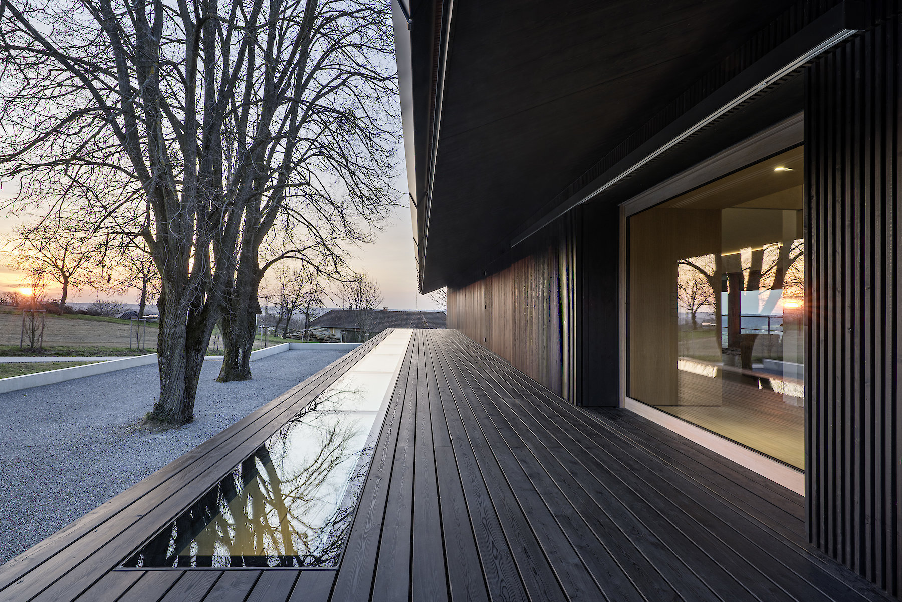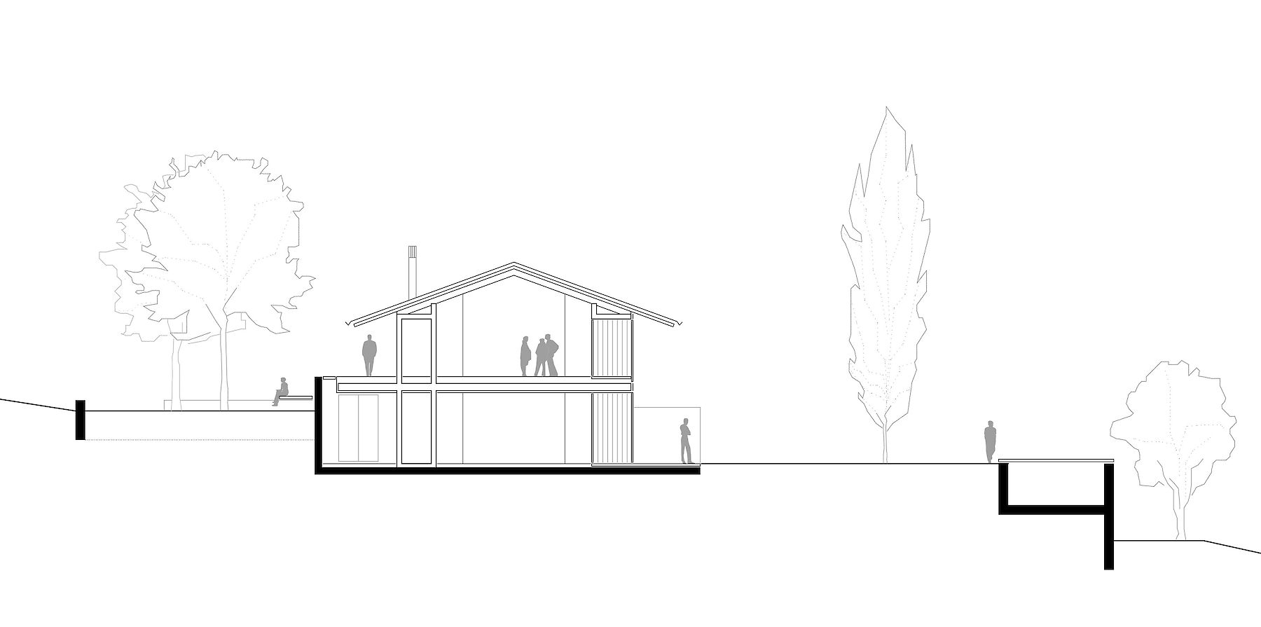 The projecting eaves can be understood as suitable protection for the timber construction and facade structure against the weather. The pitched roof is covered in tiles made of clay, a characteristic material all over the hilly region, and one whose colour and visible texture is present in the landscape far and wide.