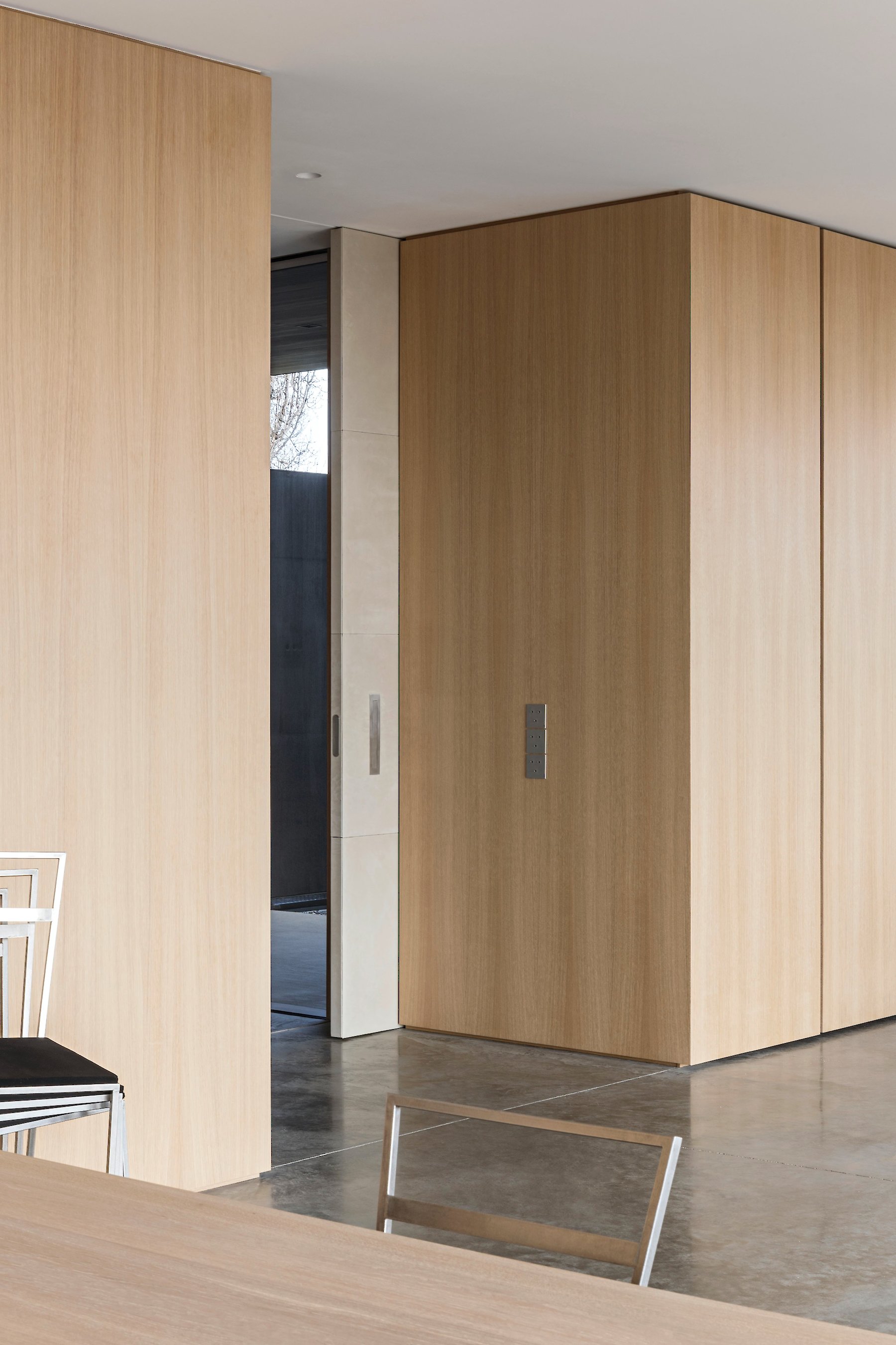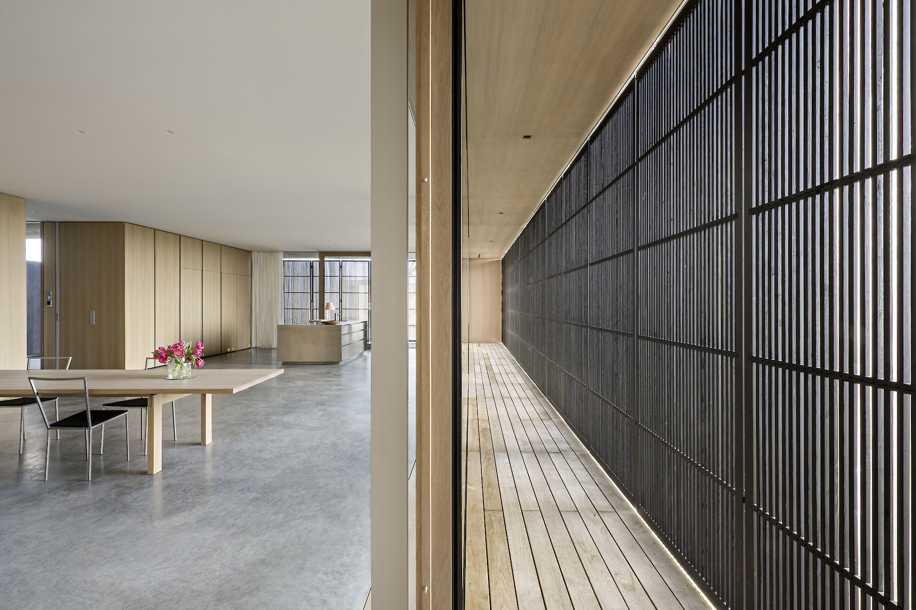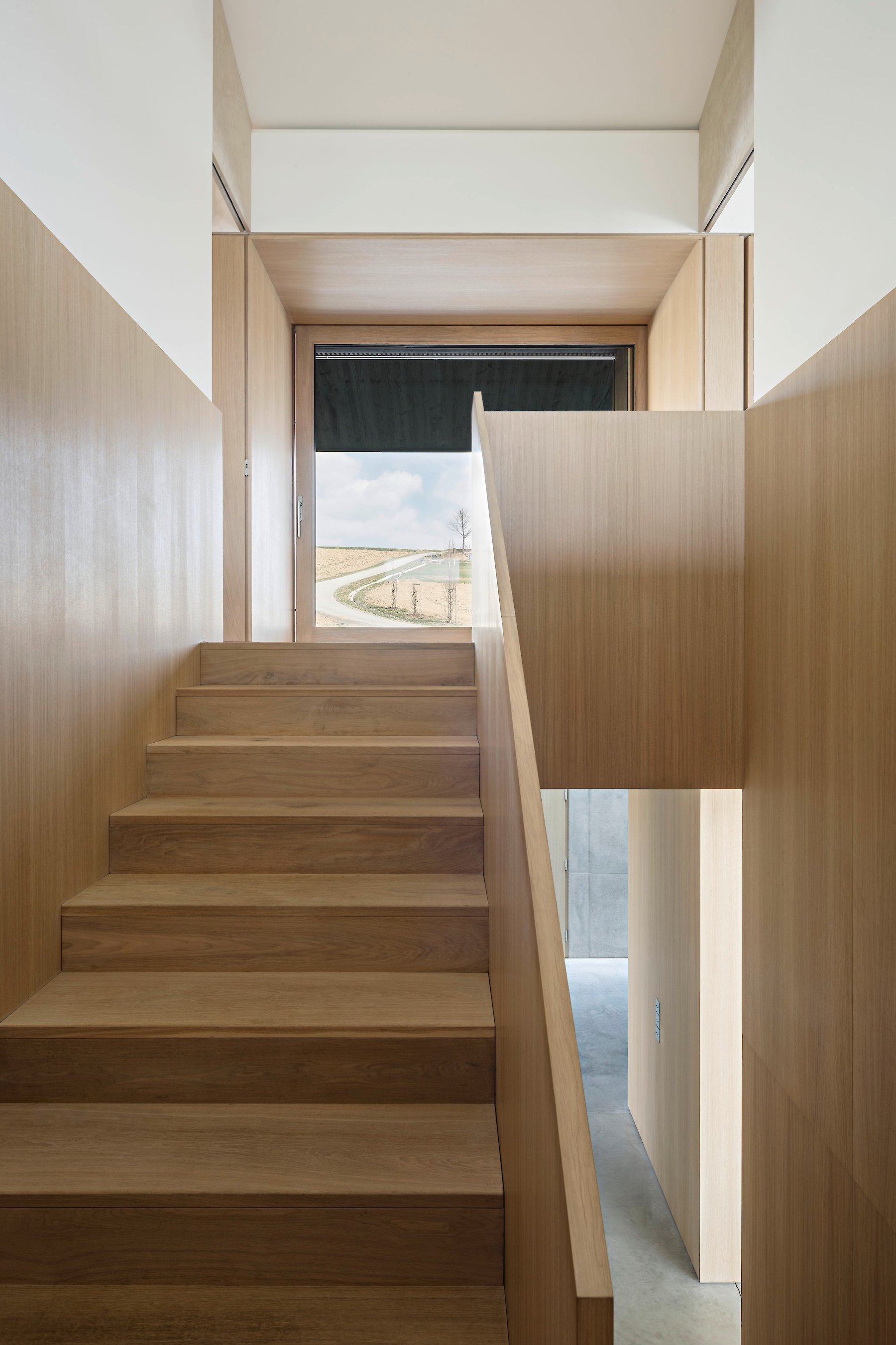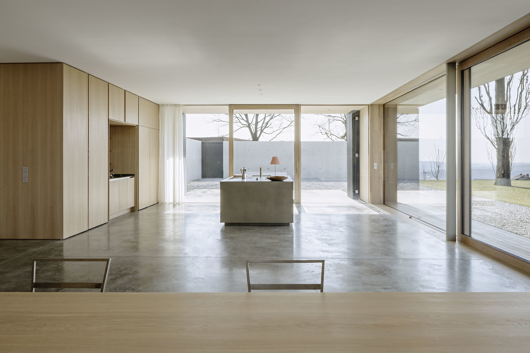 The structure of the building fulfils the aspiration for a high degree of flexibility, and creates spaces whose function is largely not predetermined, thus enabling variable possibilities of use between the living and working areas, and allowing the occupants to use different areas within the building as they see fit. The resulting need to relieve the burden on the ground plan is met by a vertical structure, extending to both storeys, that accommodates all the subsidiary functions, and together with the stairway largely determines the internal sub-division in respect of openness and availability of space. Between the rooms where people congregate, only sliding doors are used. When open, they are completely invisible, thus conveying the impression of a generous, open, and freely variable room structure.