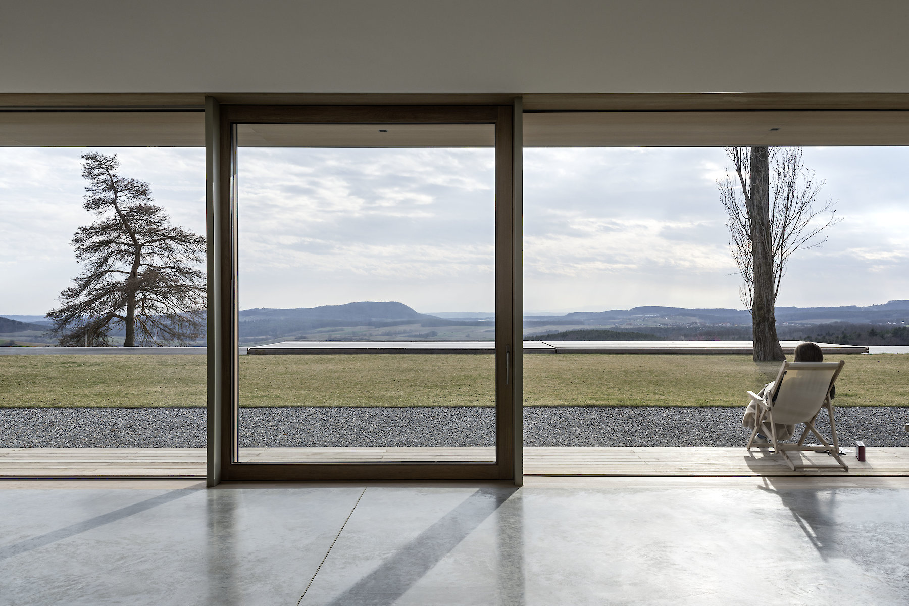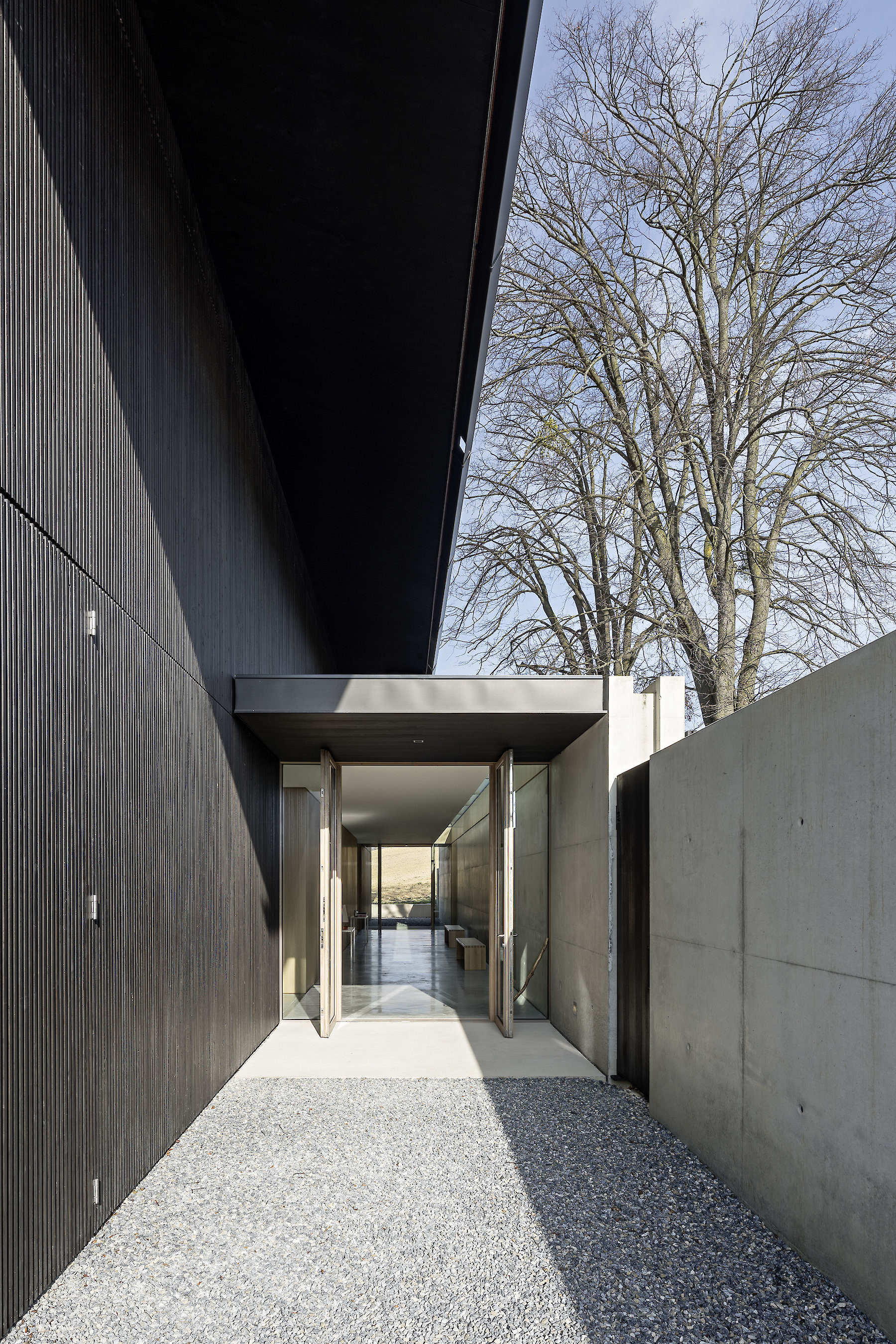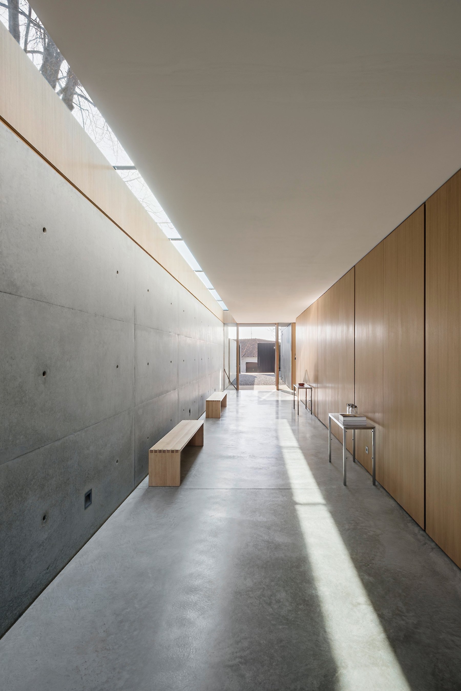 The topographically determined arrangement of the building within the plot gives rise to an entrance hall between the main body and the retaining wall. This hall can be understood as a climate-controlled buffer zone. The concrete wall, with its storage capacity, passively codetermines the climate in the actual building: the linear top lighting enables additional daylight to enter in an east-west direction, making its contribution to the temporary warming of the wall surface. In addition, the opening provides for a measured dose of incident daylight in the transition zone.