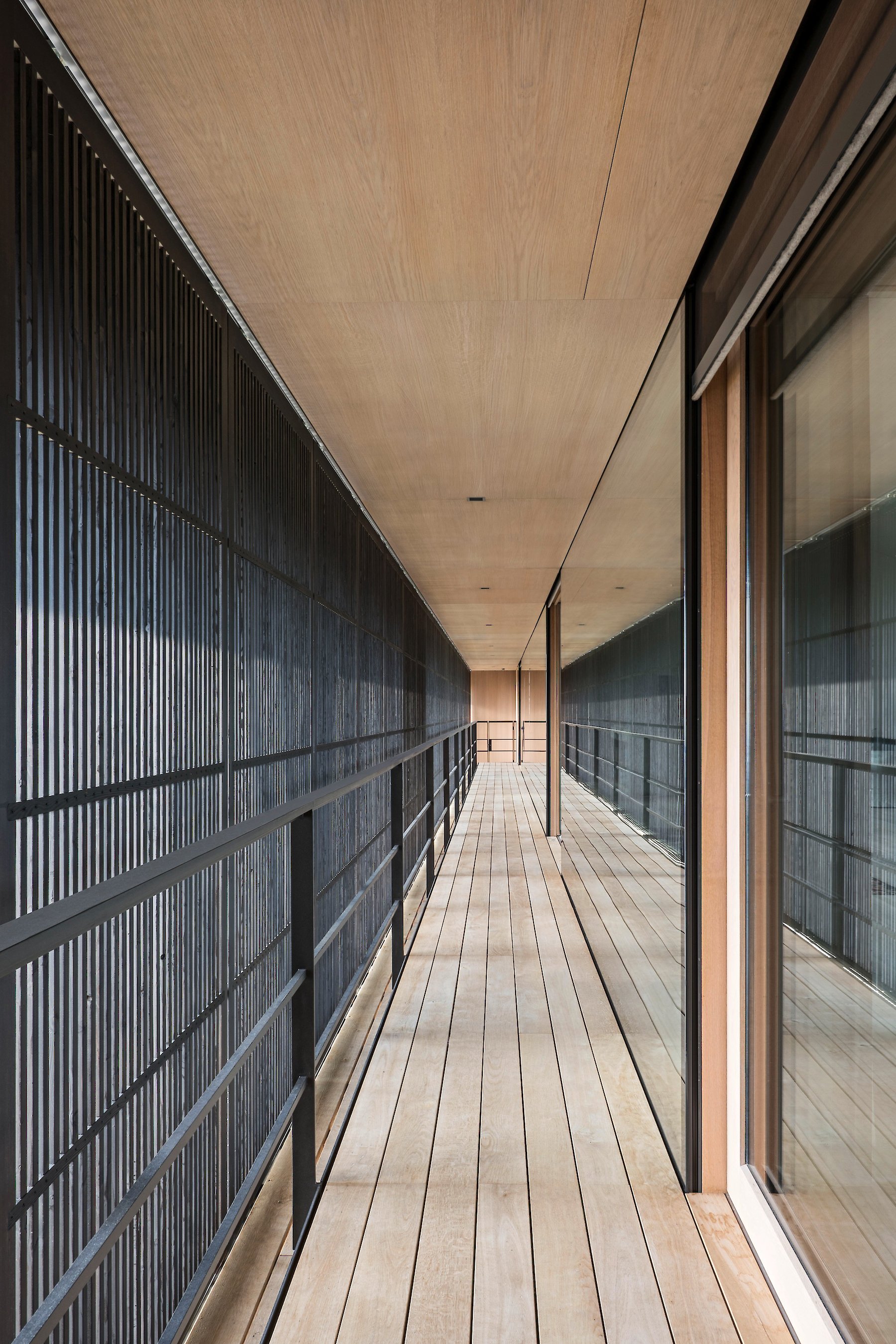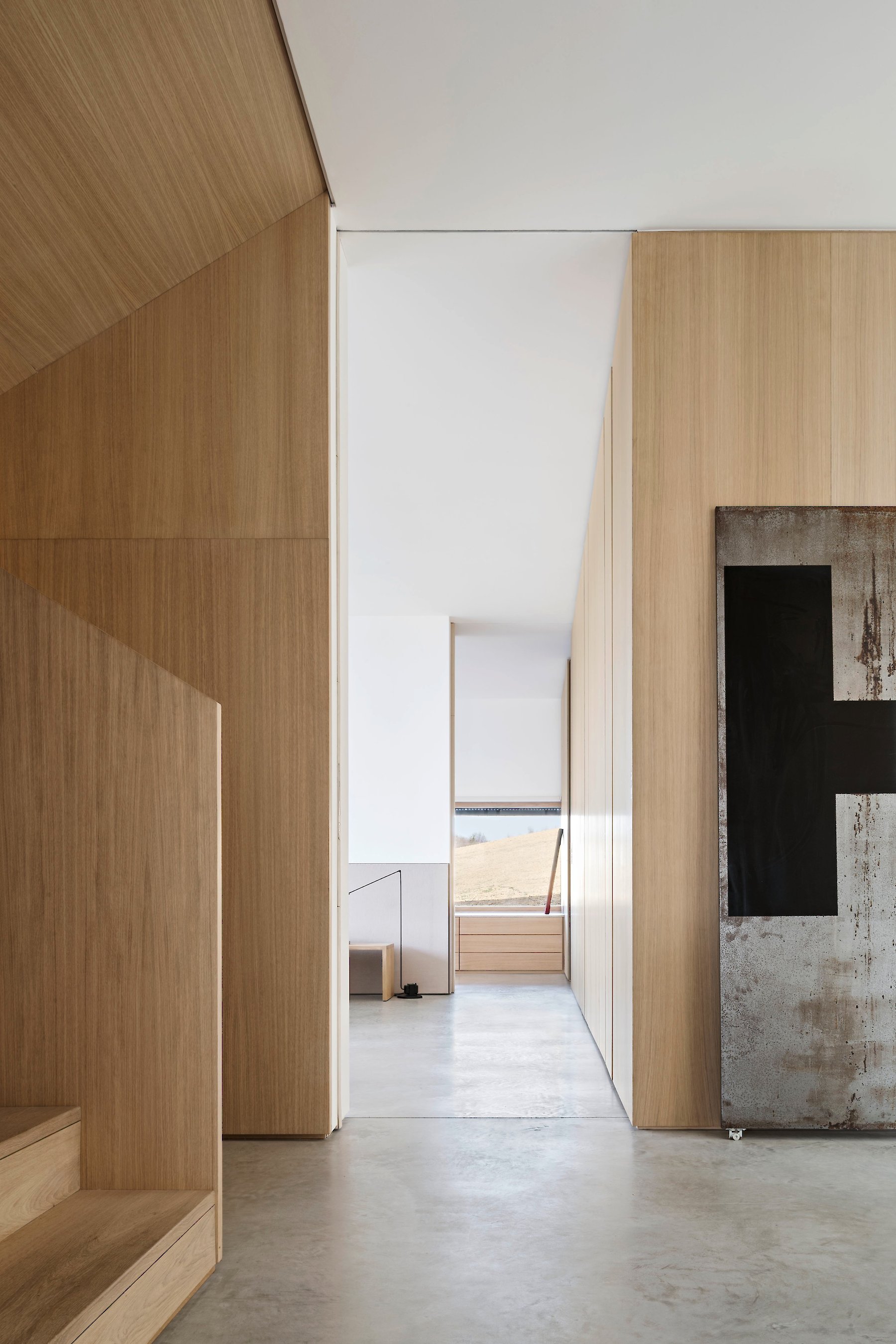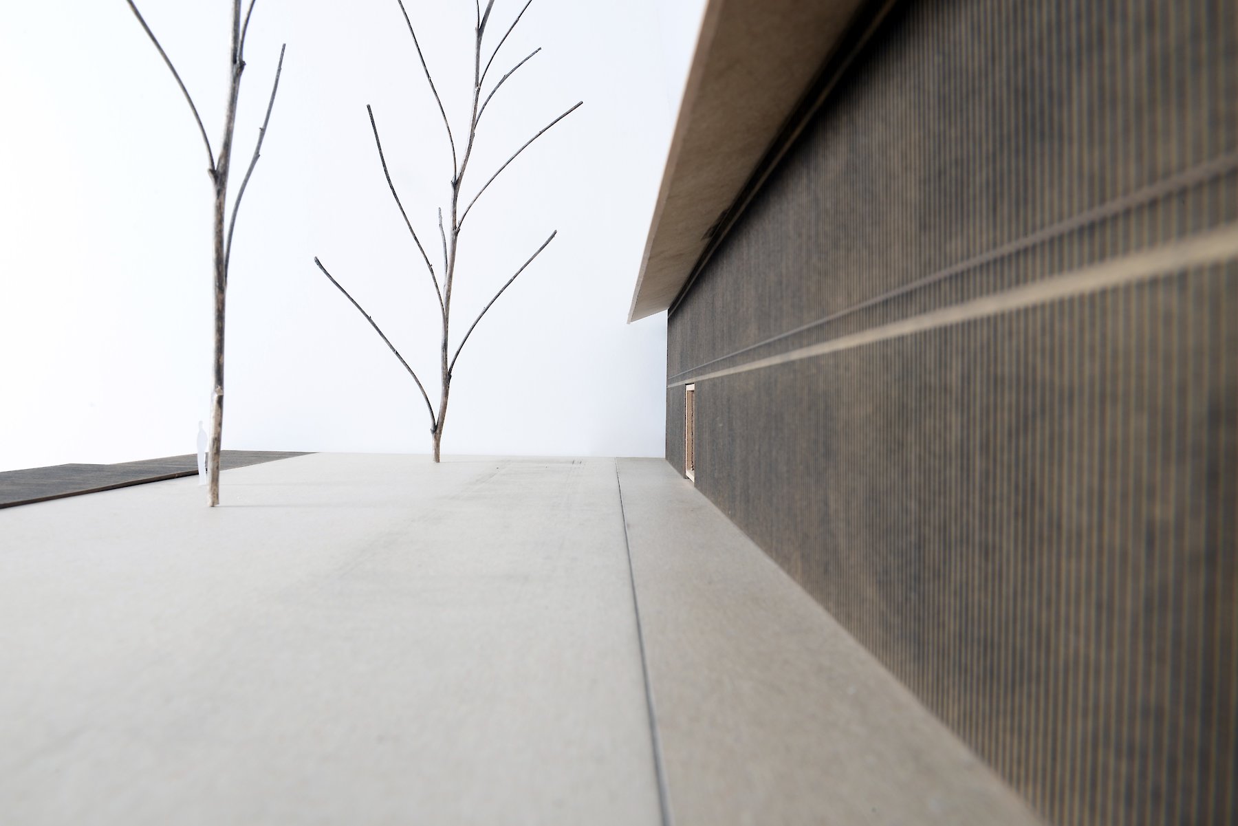 The topographically determined arrangement of the building within the plot gives rise to an entrance hall between the main body and the retaining wall. This hall can be understood as a climate-controlled buffer zone. The concrete wall, with its storage capacity, passively codetermines the climate in the actual building: the linear top lighting enables additional daylight to enter in an east-west direction, making its contribution to the temporary warming of the wall surface. In addition, the opening provides for a measured dose of incident daylight in the transition zone.