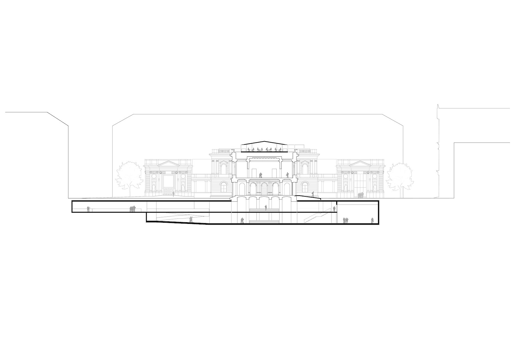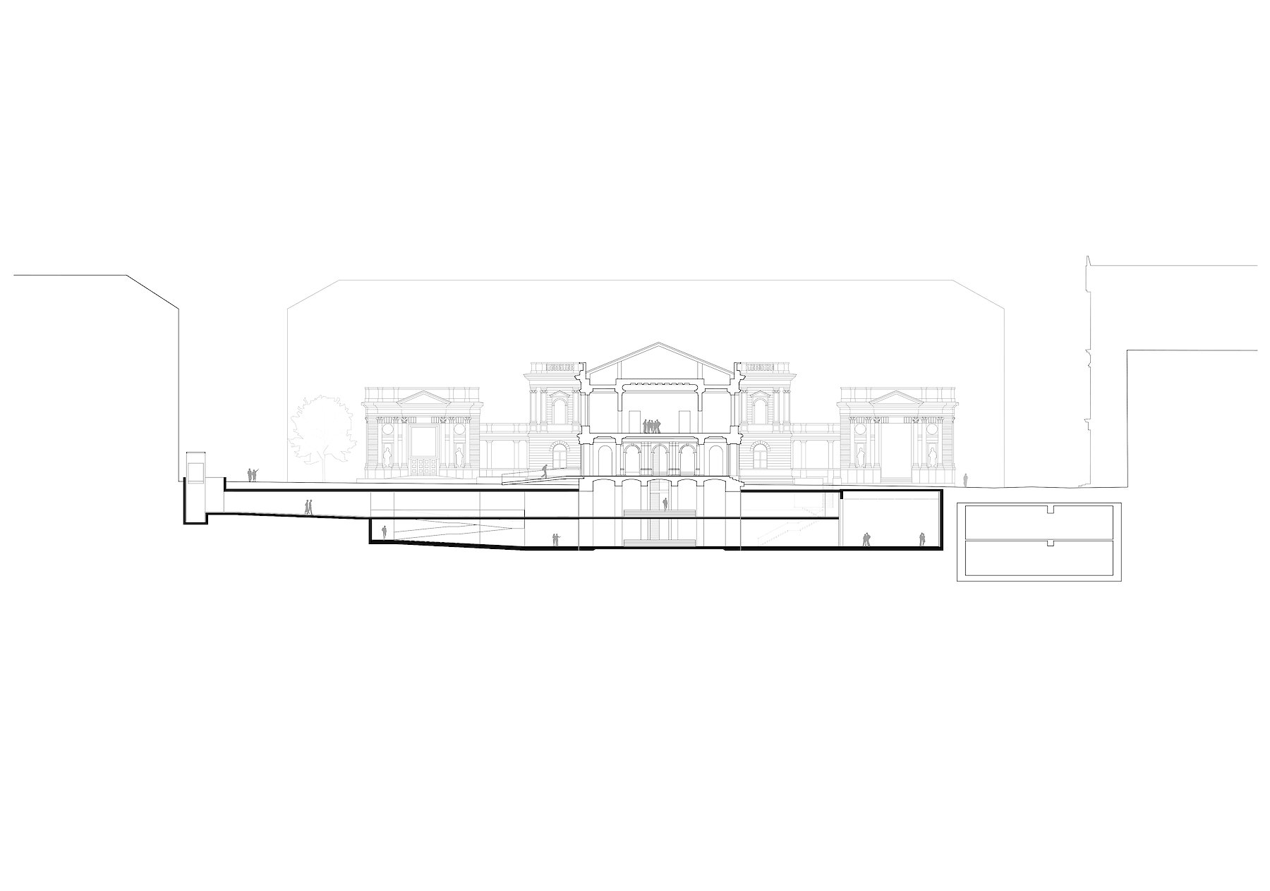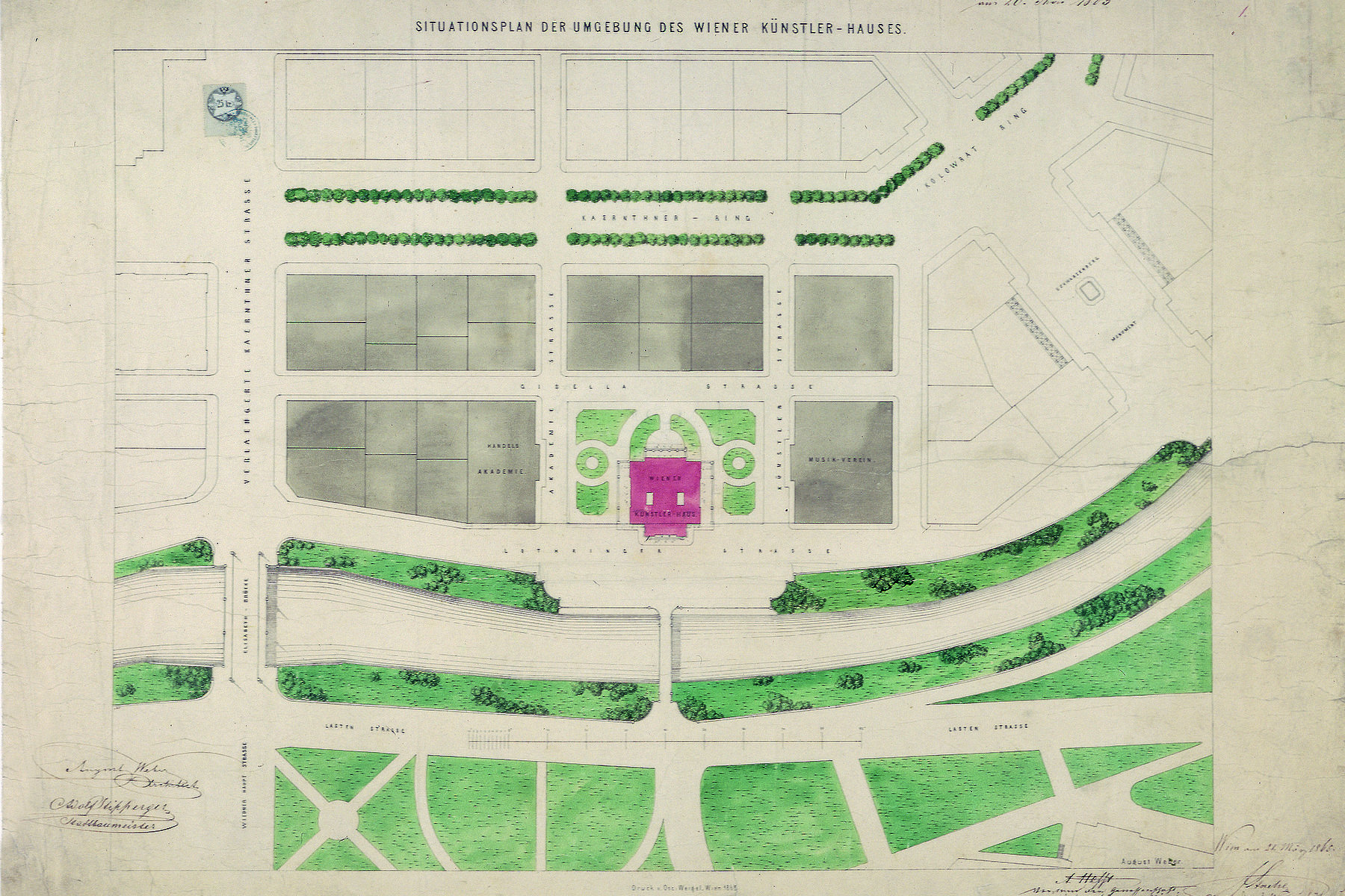 The construction of a subway reversing system at Karlsplatz creates a hollow space above the railway tracks that is suitable for further uses and is directly adjacent to the Künstlerhaus. This empty space, now available for the Künstlerhaus, was also the reason for its expansion with additional exhibition rooms.