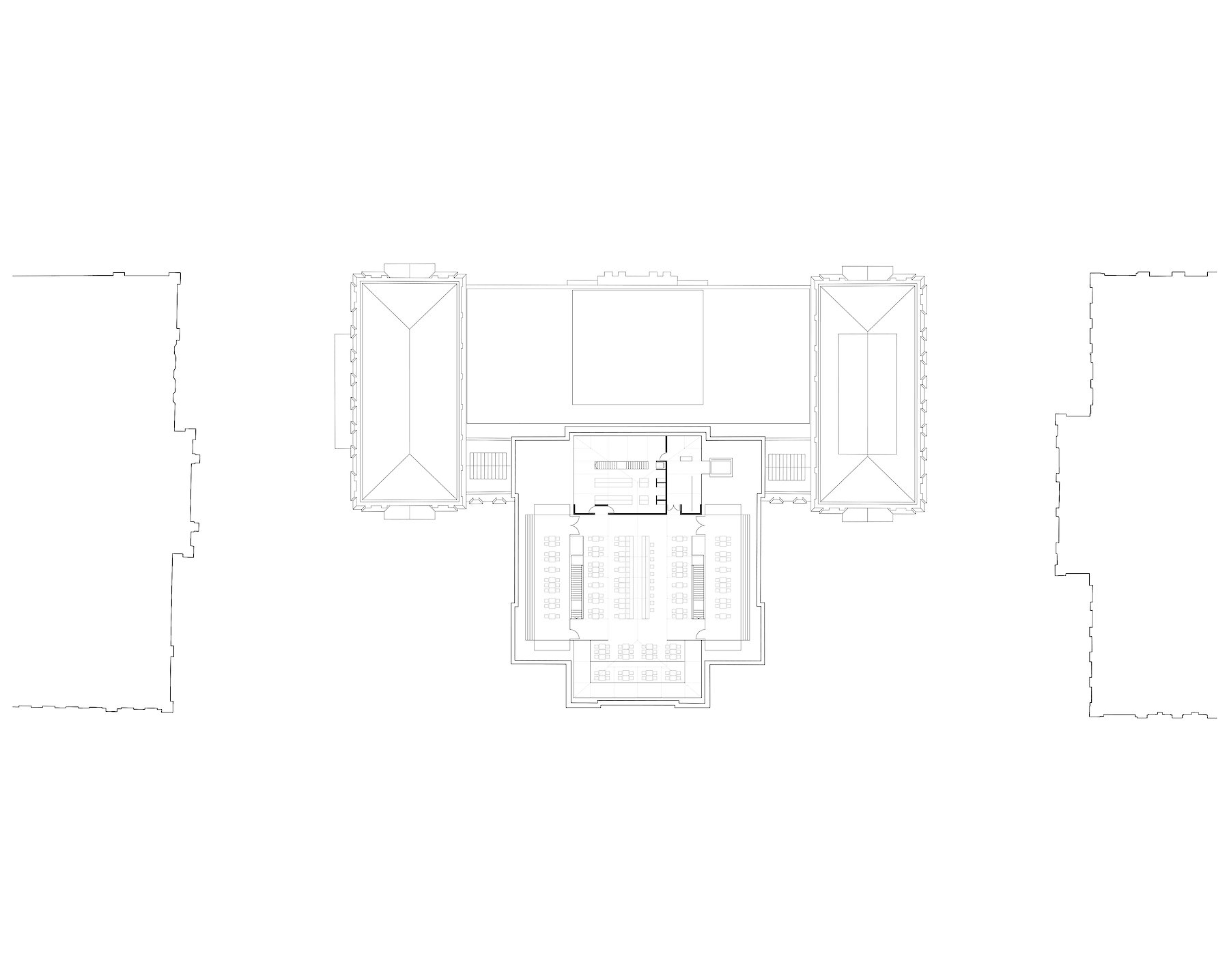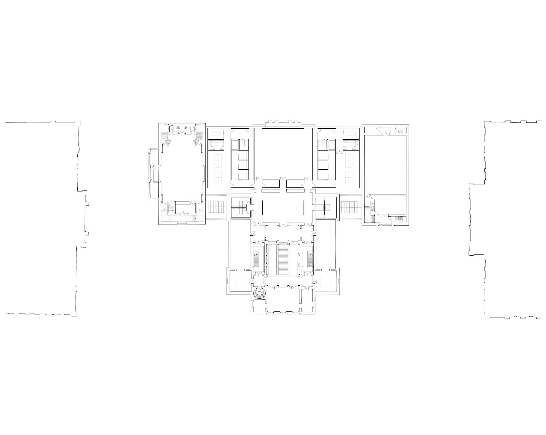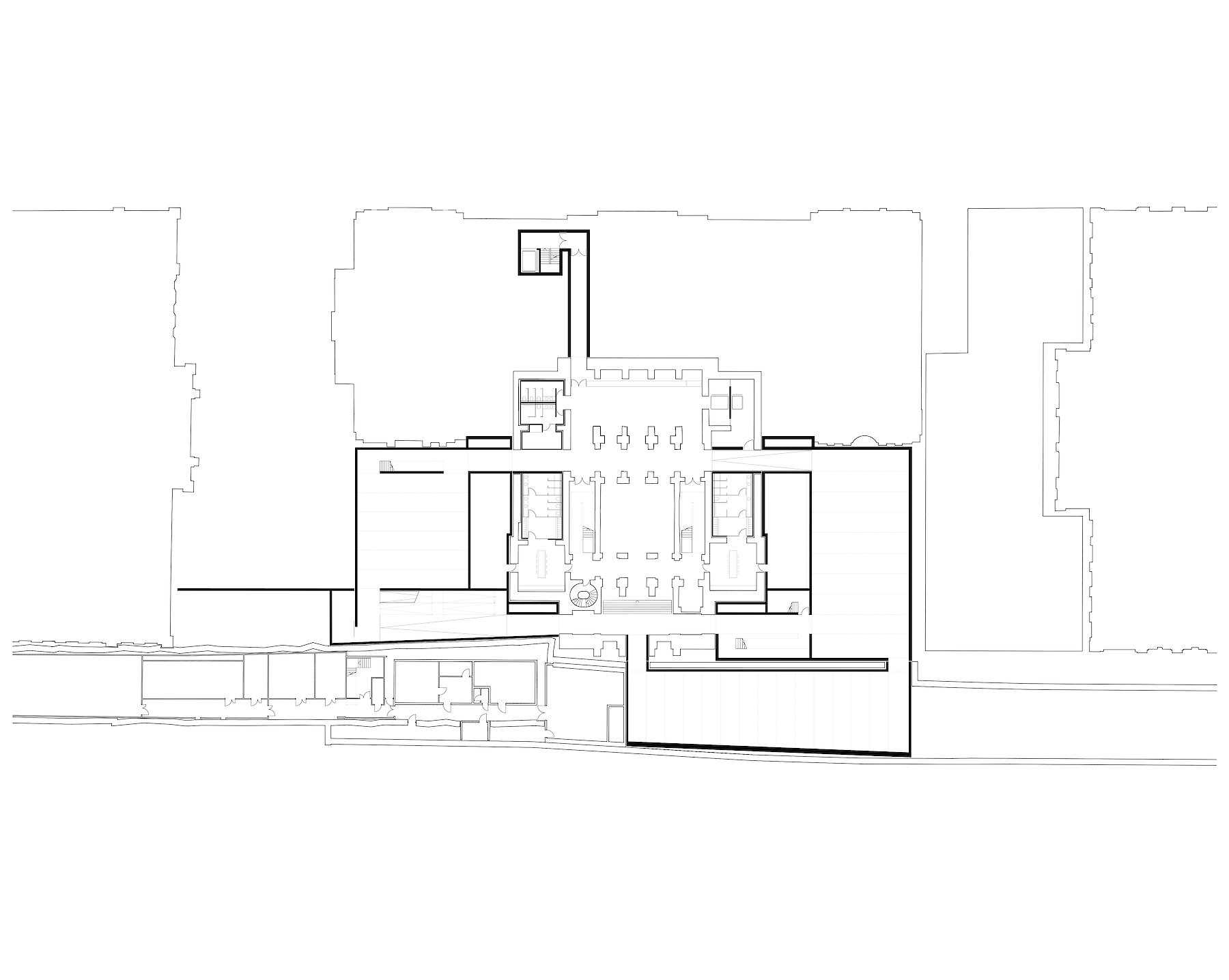 The new exhibition rooms above the turning facility are arranged along a linear access area. This area can be accessed via a new staircase from the Künstlerhaus or directly from the underground passage. This form of central routing gives visitors an immediate overview of the arrangement and extent of all exhibition rooms as well as the location of the vertical connections.