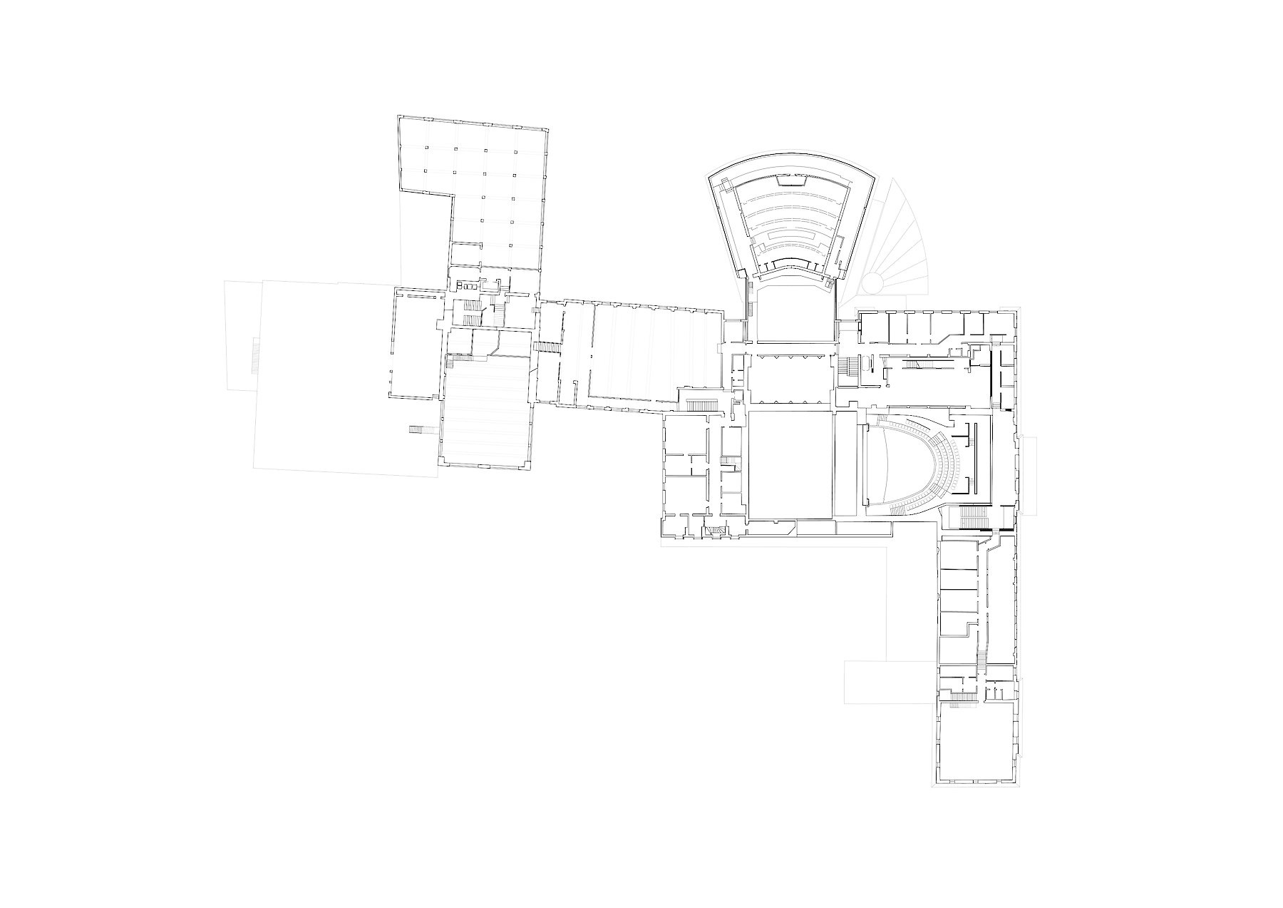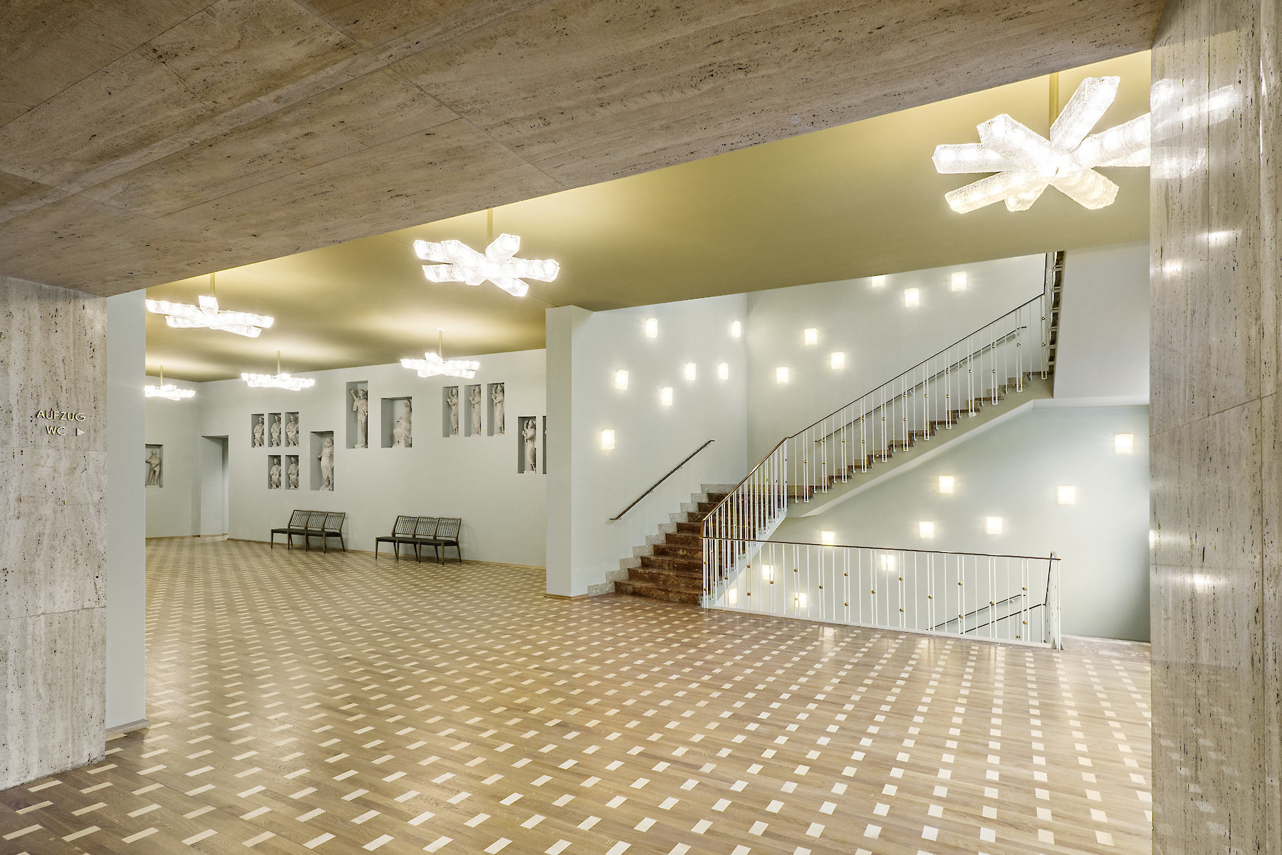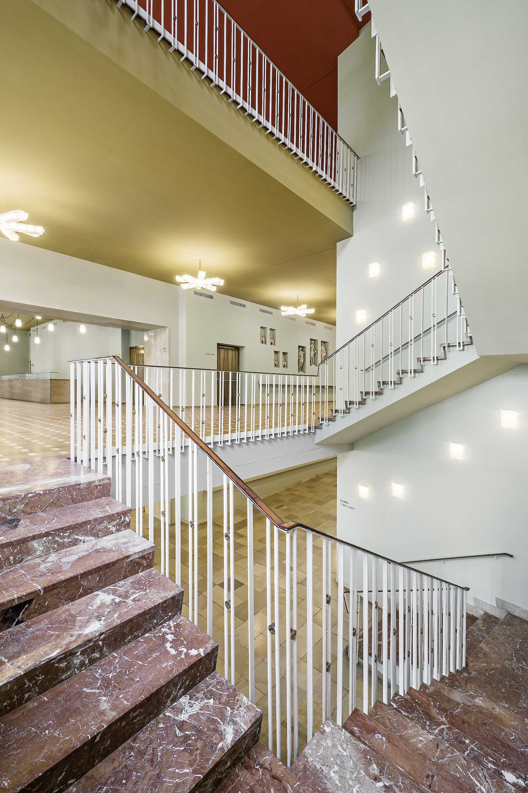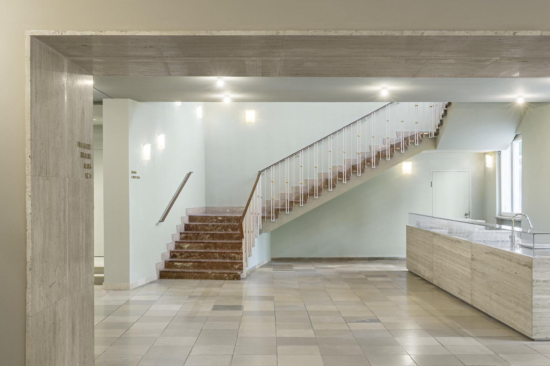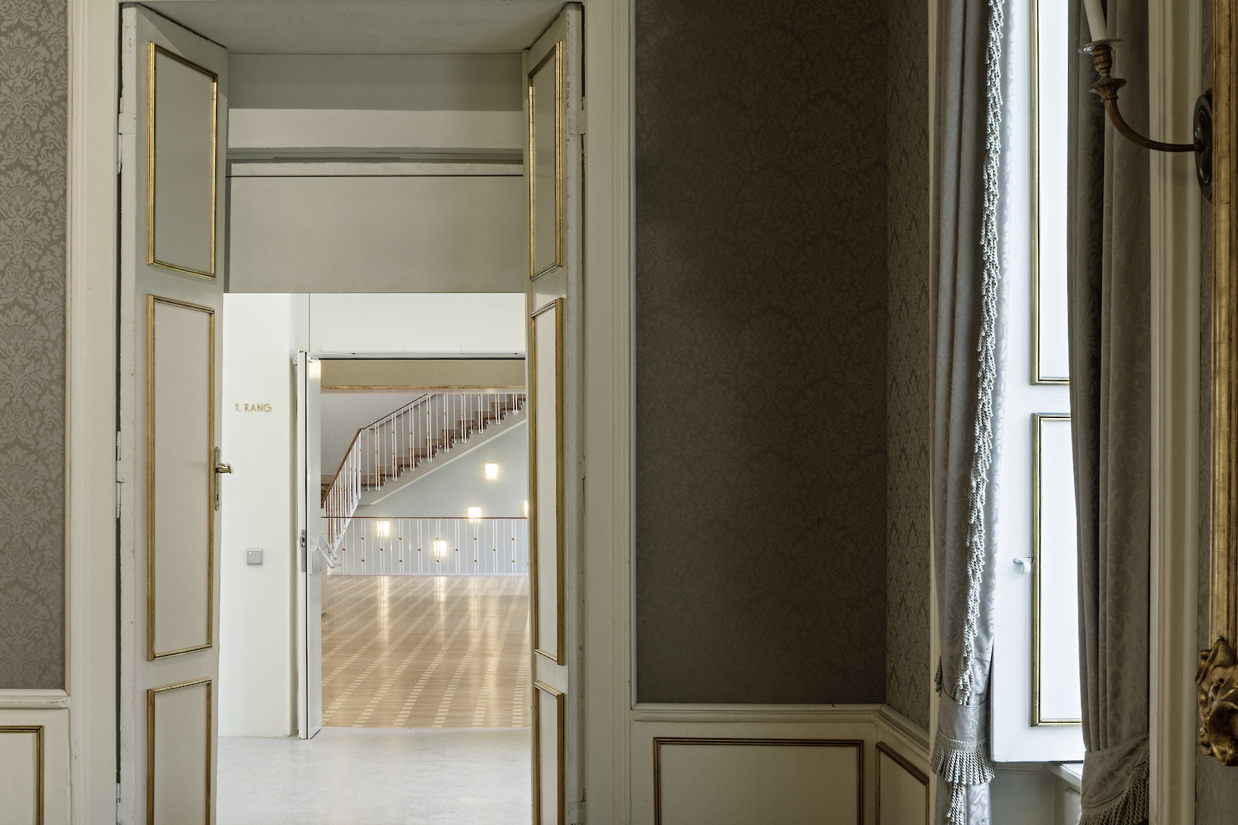 The three-storey public foyer and intermission areas in front of the auditorium are connected by an open staircase. They were adapted to the newly defined size of the auditorium by removing later additions, were equipped with cash desks, a shop, bar and lounge areas as well as the necessary ancillary spaces, and were designed to be free of barriers.