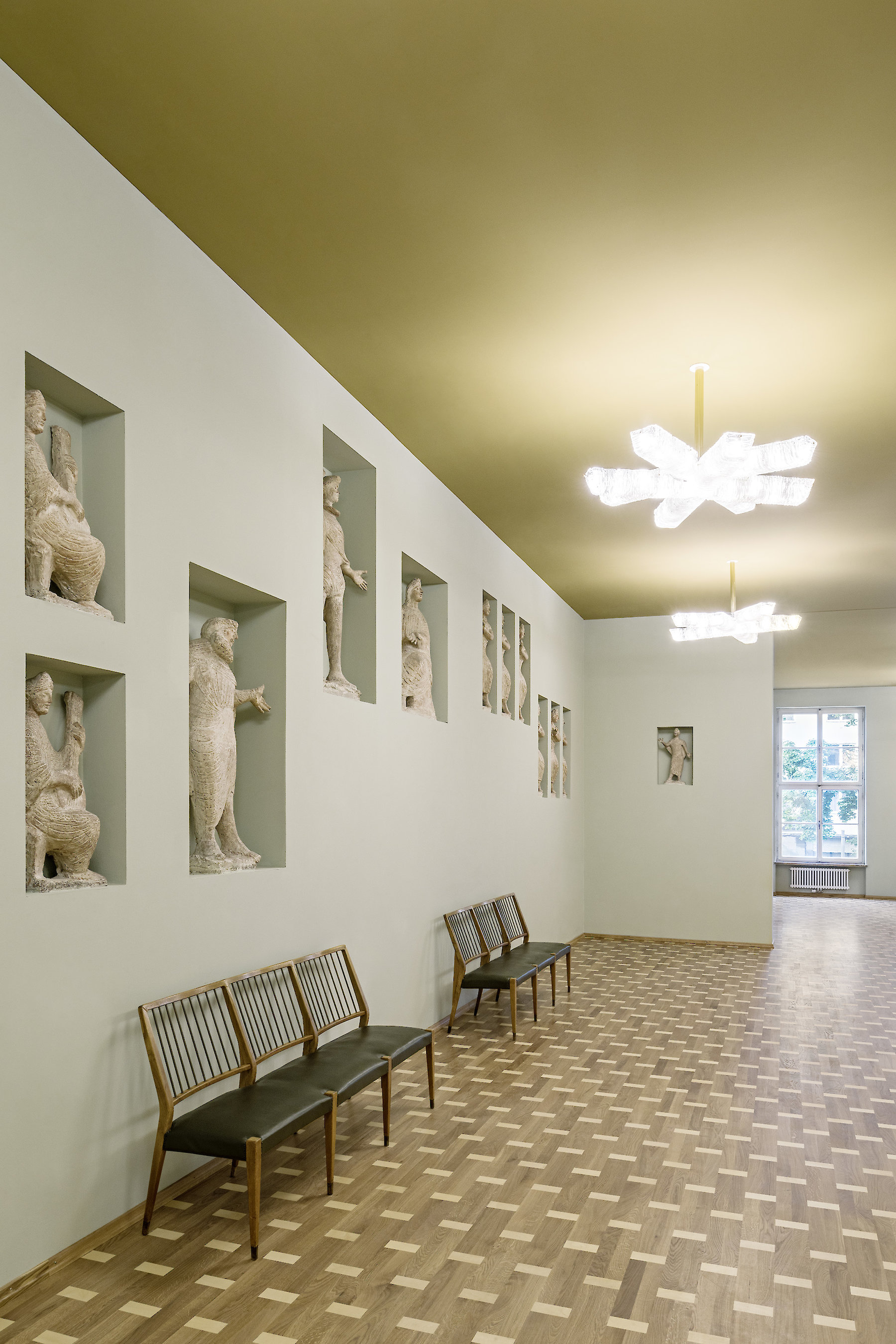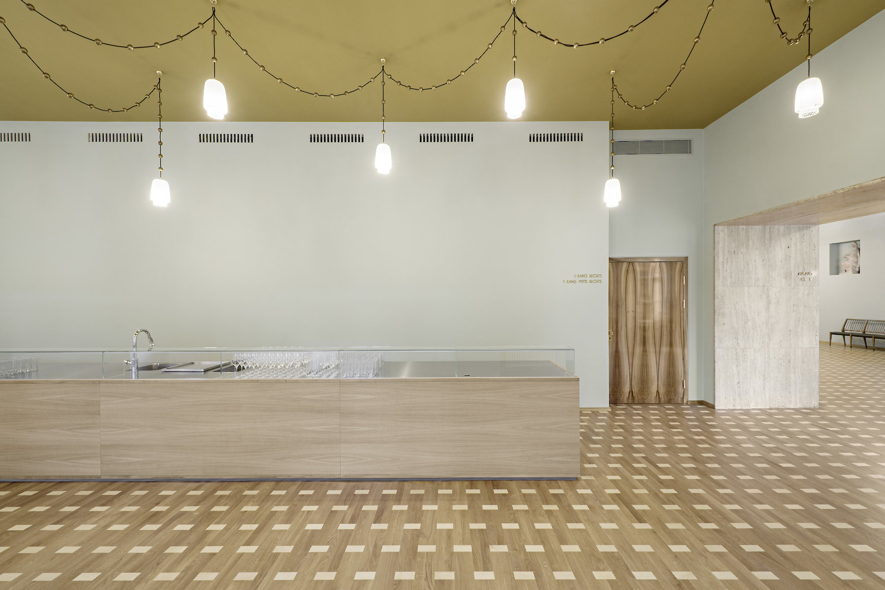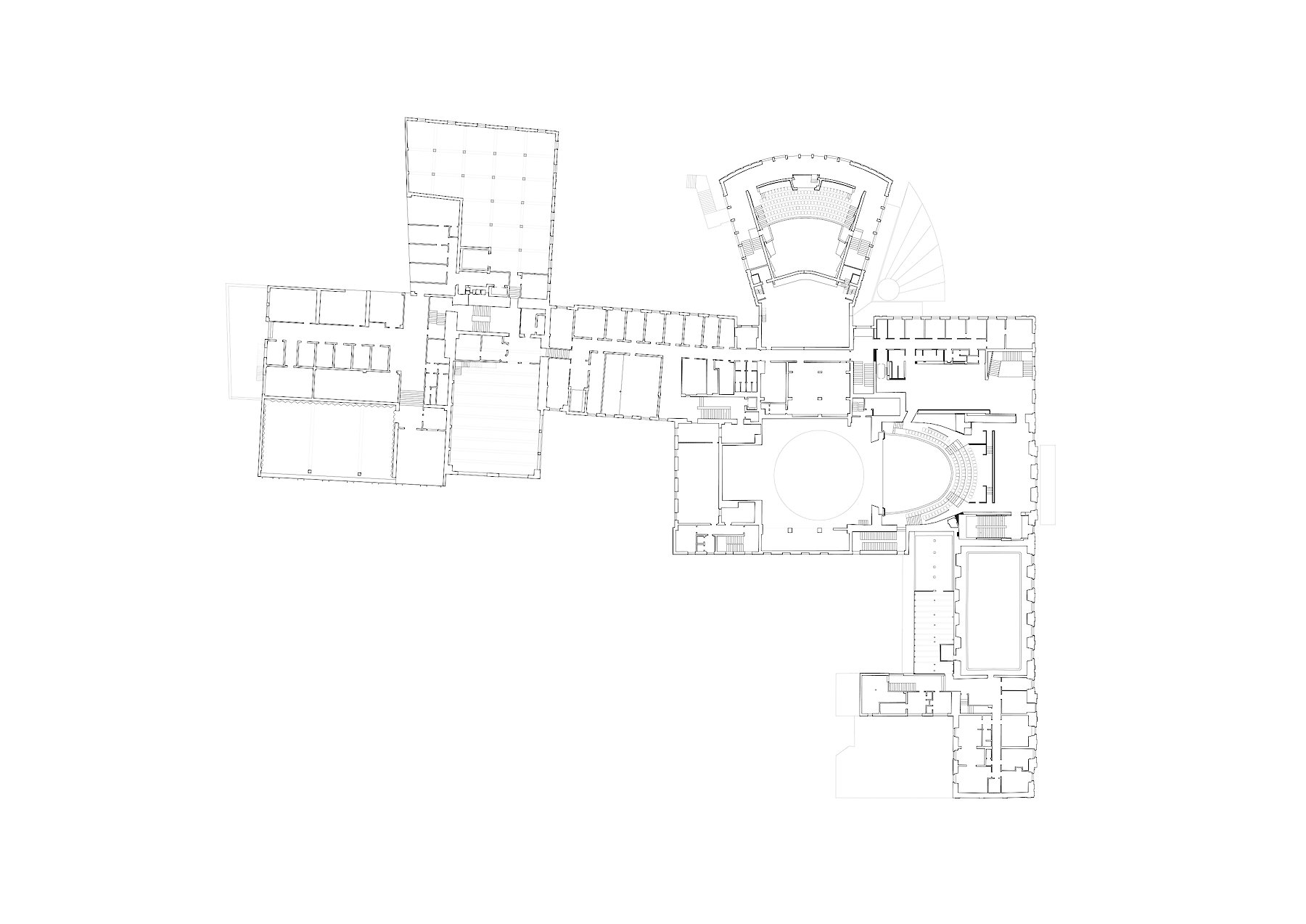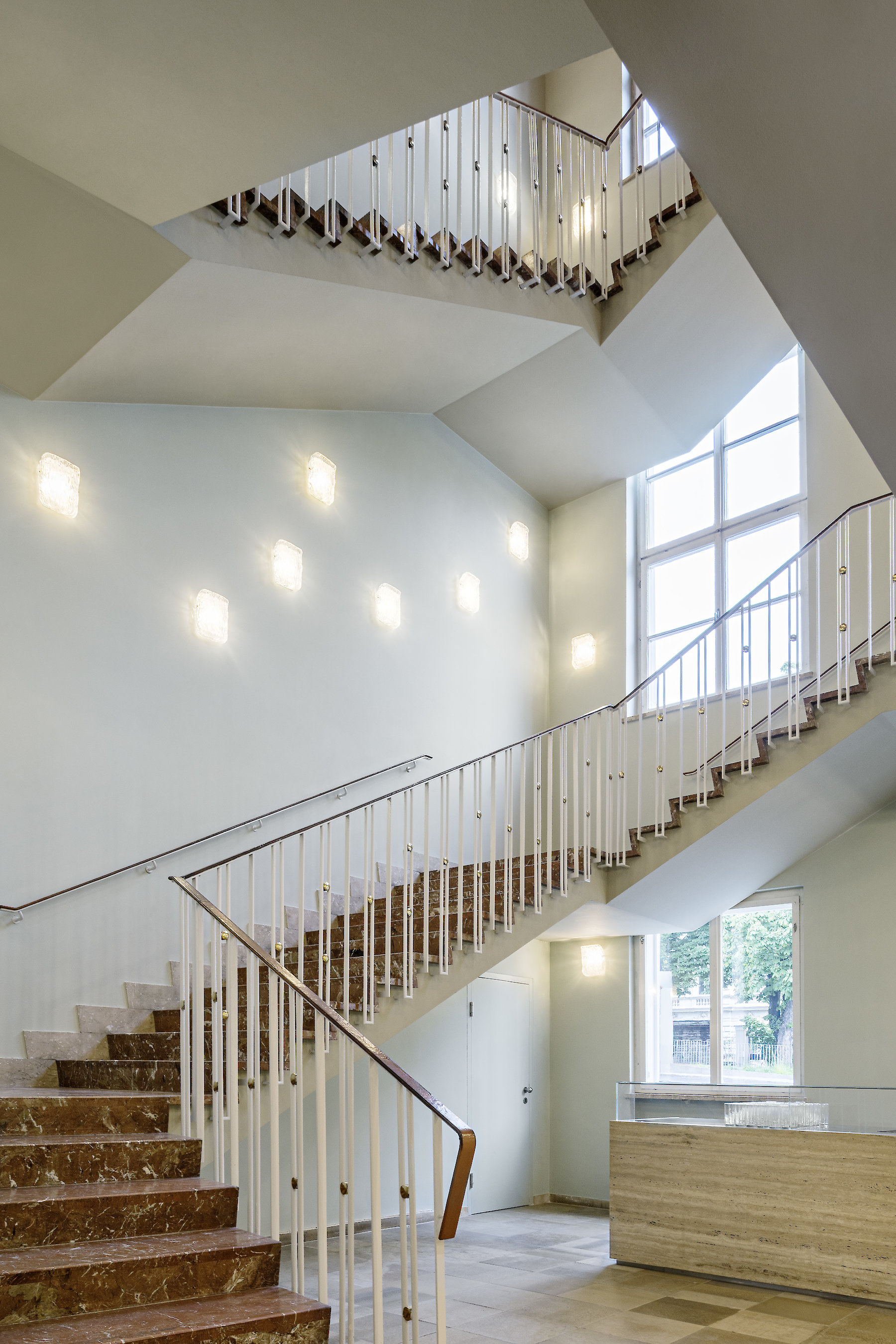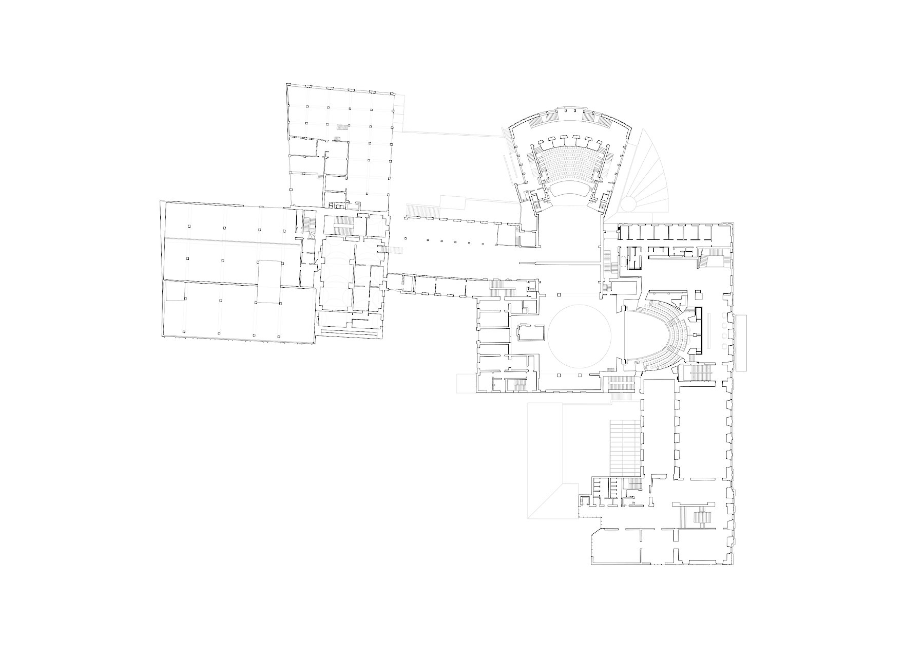 The three-storey public foyer and intermission areas in front of the auditorium are connected by an open staircase. They were adapted to the newly defined size of the auditorium by removing later additions, were equipped with cash desks, a shop, bar and lounge areas as well as the necessary ancillary spaces, and were designed to be free of barriers.