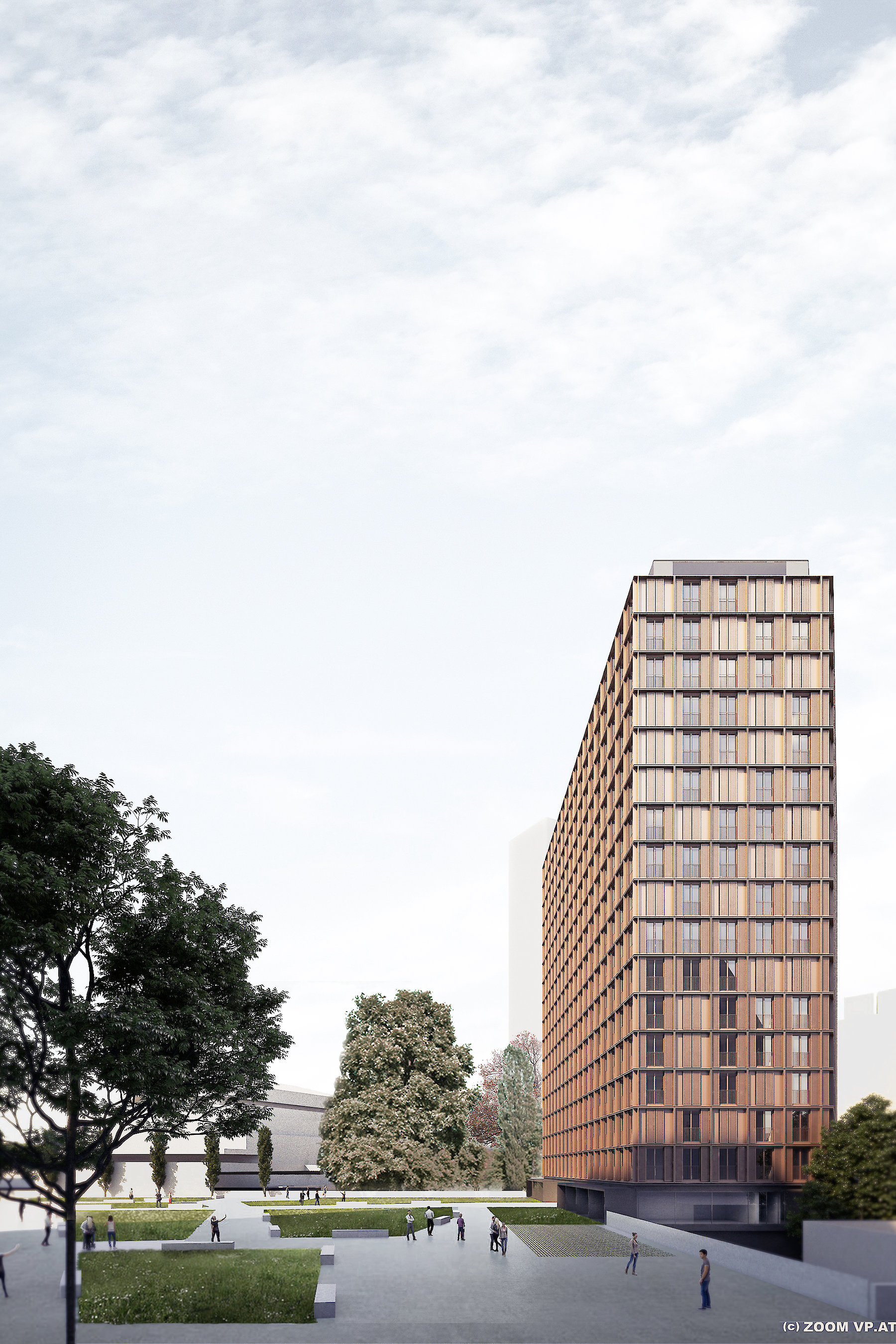 Das Wohnhochhaus auf der Donauplatte in Wien besetzt ein Baufeld, dessen Zuschnitt das Ergebnis eines 24h Stunden Schattenwurfes der benachbarten Hochhäuser darstellt.