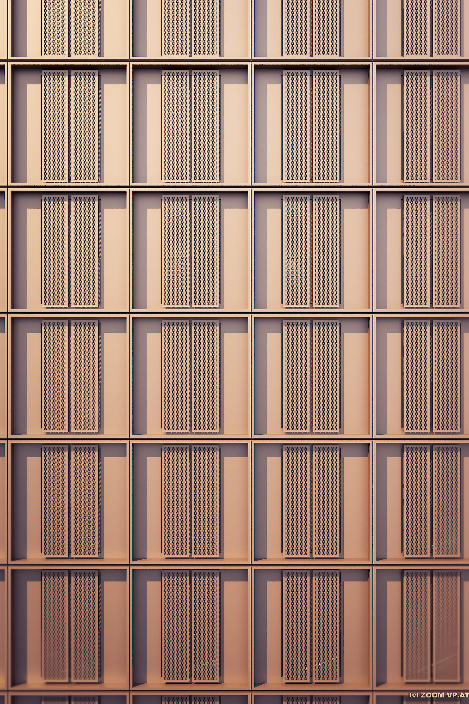 Die modulare Struktur der Fassade wird von einem Fassadenelement bestimmt, das nicht nur die Fensteröffnung, sondern auch Schiebeläden aufnimmt, die jeweils die Funktion des Blend- oder Sonnenschutzes übernehmen. Der individuelle Gebrauch der Schiebeläden zeichnet verantwortlich für ein äußerst differenziertes Fassadenbild innerhalb einer sehr regelmäßigen Fassadengliederung.