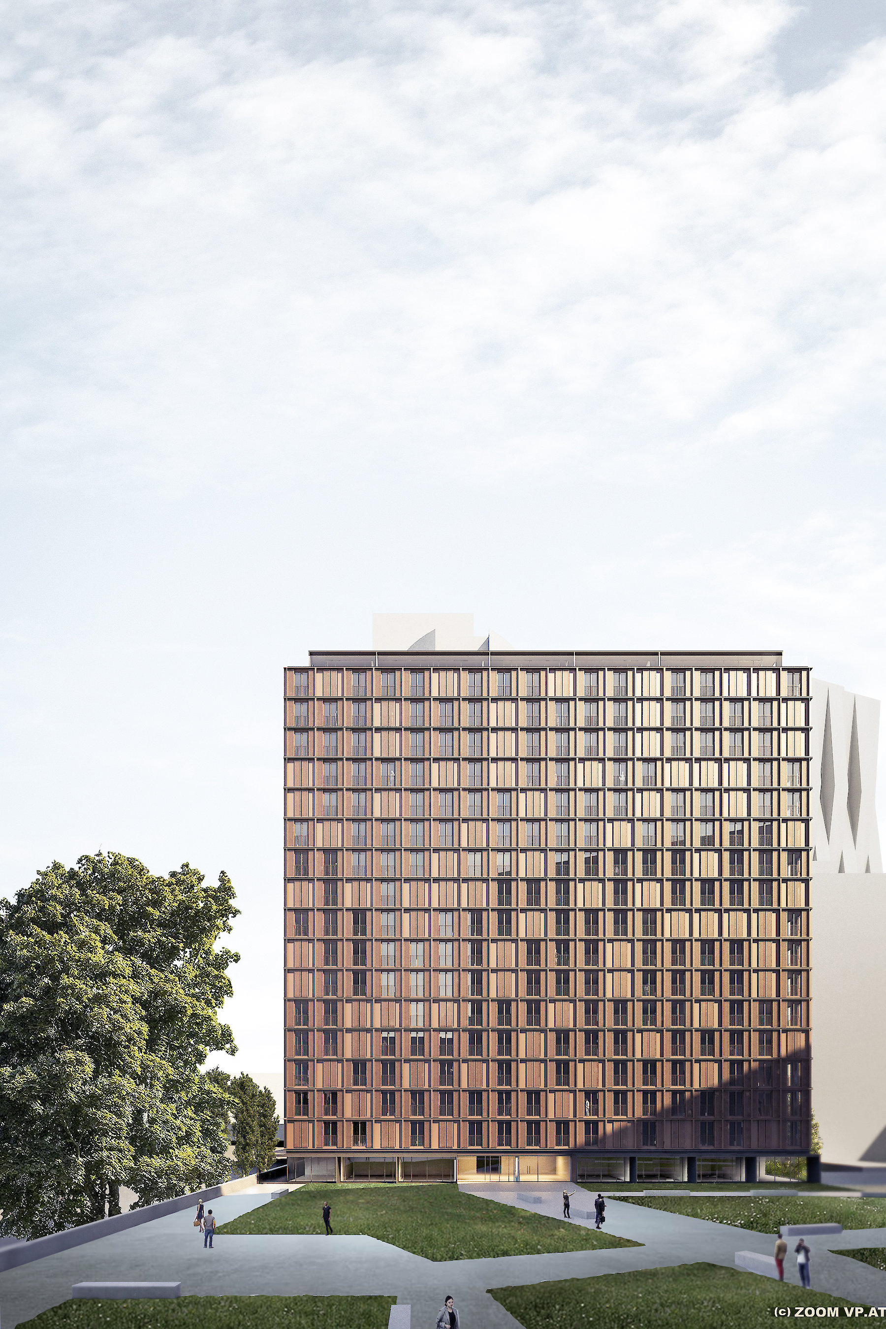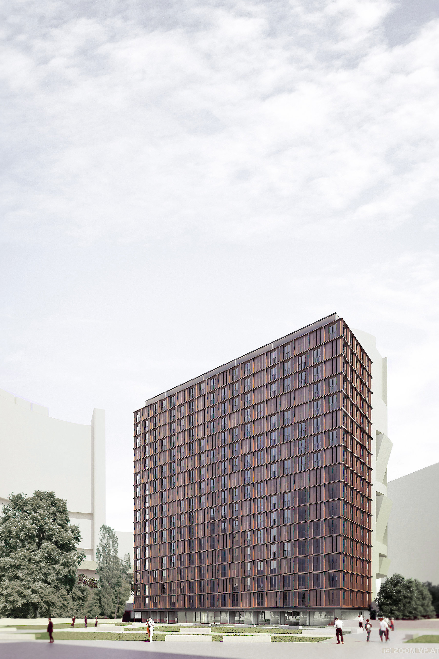 Das Wohnhochhaus auf der Donauplatte in Wien besetzt ein Baufeld, dessen Zuschnitt das Ergebnis eines 24h Stunden Schattenwurfes der benachbarten Hochhäuser darstellt.
