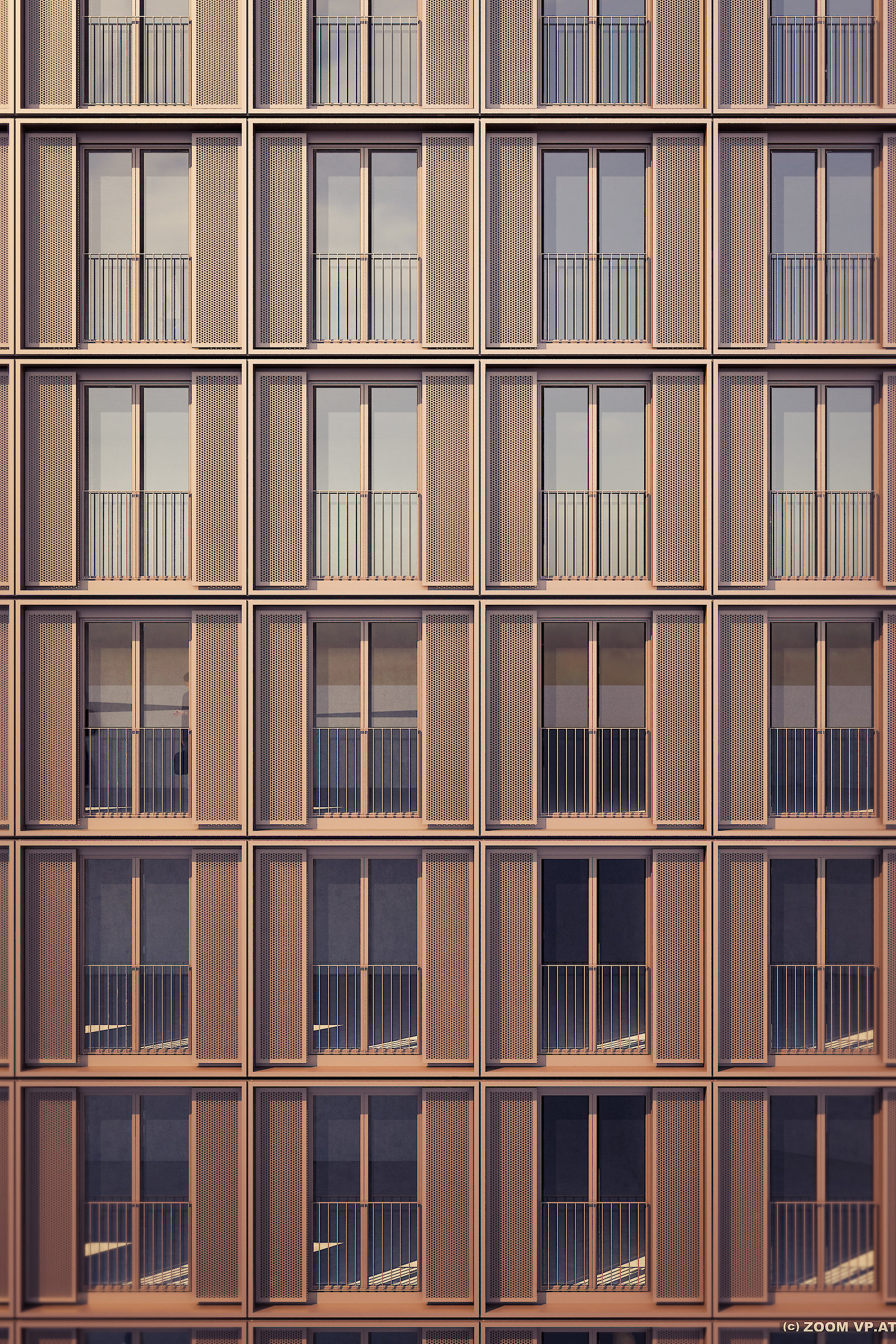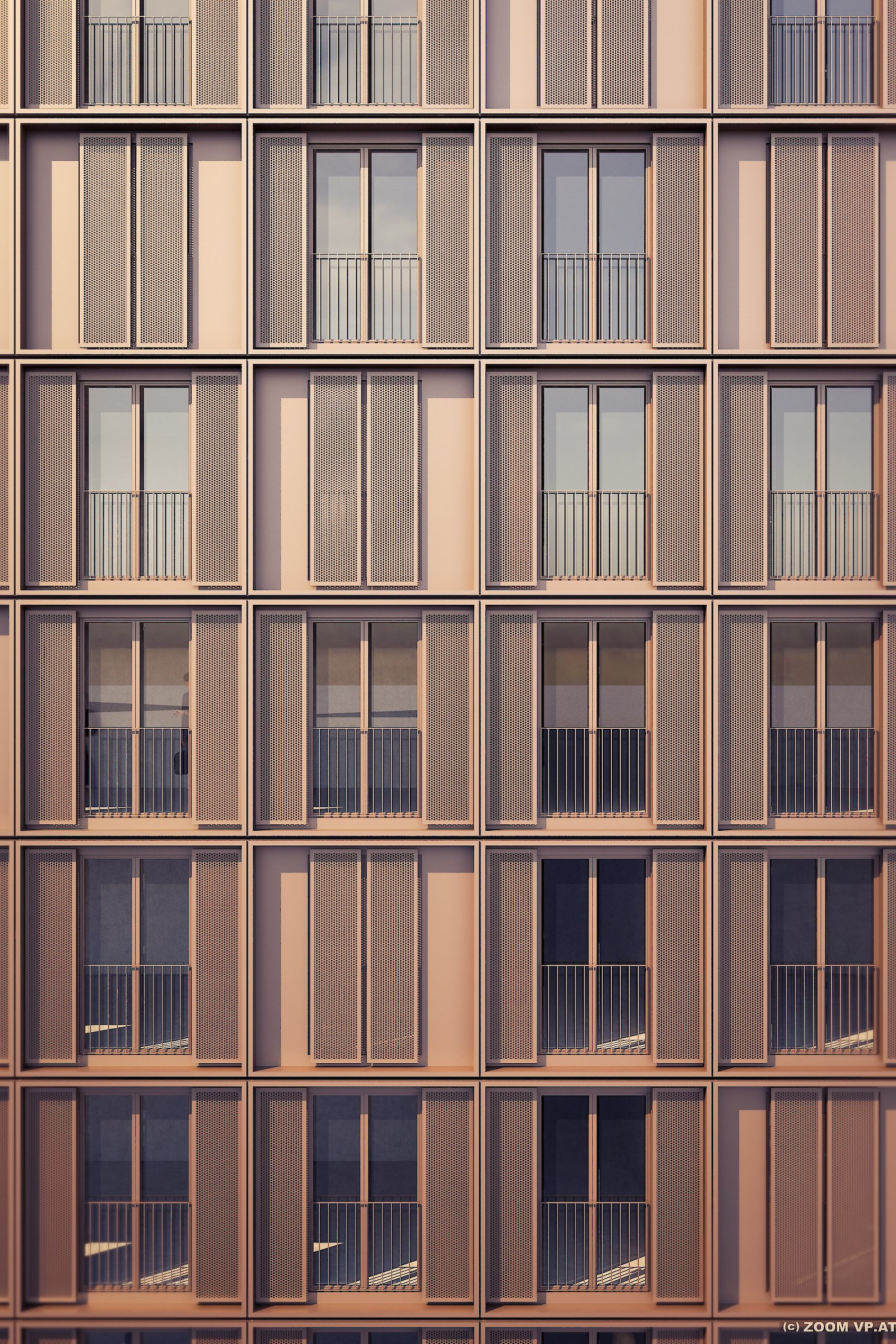 Die modulare Struktur der Fassade wird von einem Fassadenelement bestimmt, das nicht nur die Fensteröffnung, sondern auch Schiebeläden aufnimmt, die jeweils die Funktion des Blend- oder Sonnenschutzes übernehmen. Der individuelle Gebrauch der Schiebeläden zeichnet verantwortlich für ein äußerst differenziertes Fassadenbild innerhalb einer sehr regelmäßigen Fassadengliederung.