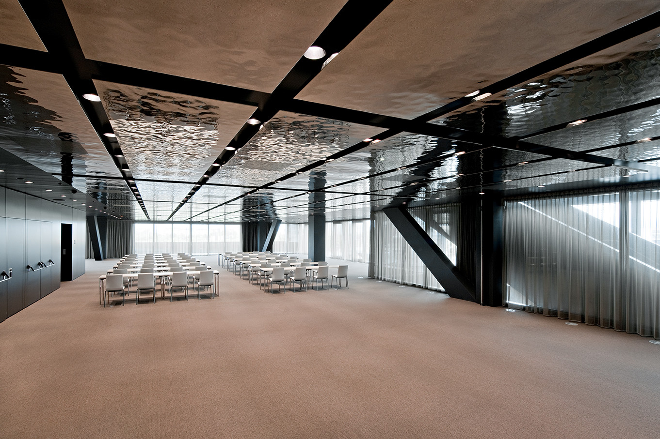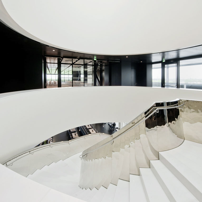 Wesentliches Gestaltungselement im Hoteleingangsbereich ist ein sich über vier Ebenen erstreckender Treppenkonus. Grundlegende Aspekte, um die räumlichen und skulpturalen Qualitäten der konusförmigen Treppe hervorzuheben, liegen in ihrer Material- und Oberflächenwahl sowie der Ausführung mit einer nicht transparenten Brüstung. Weiße Marmorstufen sind von champagnerfarbenen, gewellten Edelstahlblechtafeln gefasst.