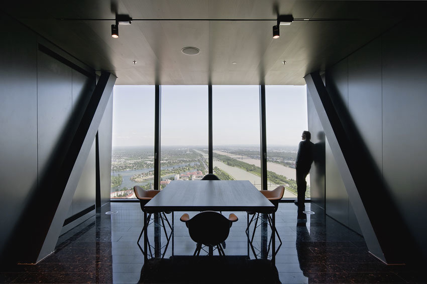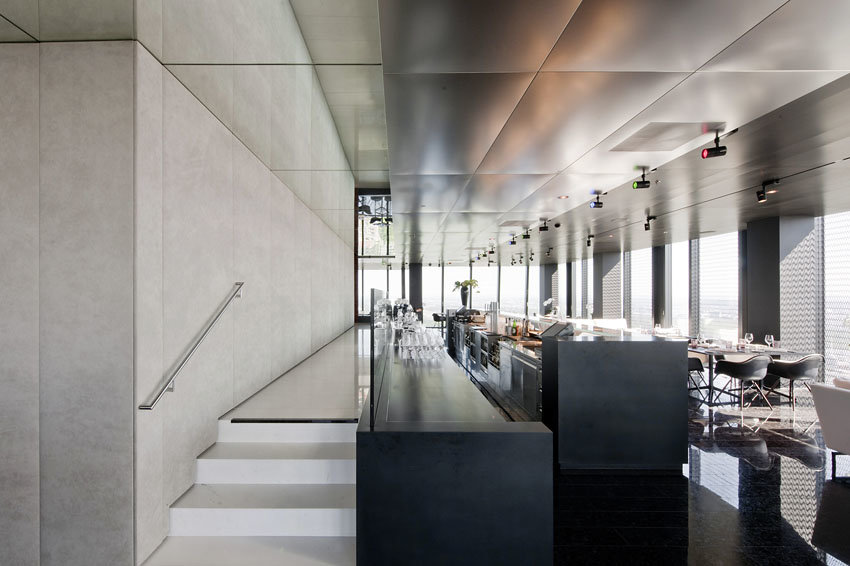 Die Innenraumgestaltung orientiert sich am vorgegebenen architektonischen Material- und Farbkonzept des DC-Towers. Dunkle Farben im Innenraum reflektieren sich kaum in den Glasflächen der Fassade und überblenden daher nicht die Aussicht. Spiegelflächen entlang des Kernes an der Decke der Ebene +57 und den Wänden der Ebene +58 verbinden optisch die beiden Geschoße und erweitern im Terrassengeschoß die beengten räumlichen Verhältnisse. Die mit grauem Alkantara bespannten Paneelverkleidungen der Gebäudekernwände bilden einen neutralen und auch akustisch wirksamen Hintergrund für den Blick über Wien.