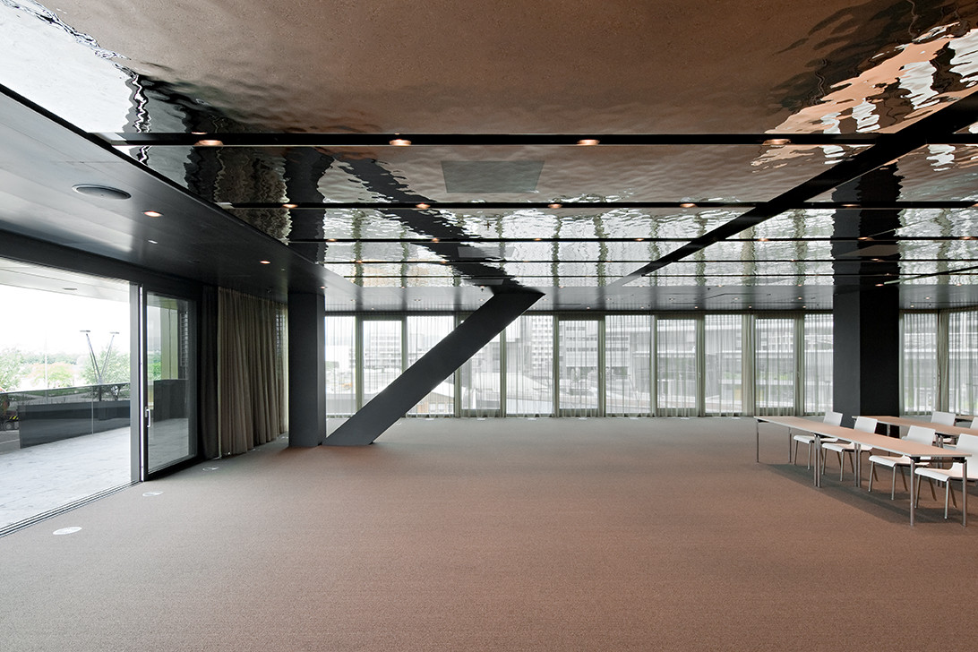 Ergänzend dazu ermöglicht im Erdgeschoß ein 40 m langes und 2 m hohes transluzentes Folienband in Kombination mit einer wellenförmigen Lamellenkonstruktion und RGB-Lampen programmierbare Lichtstimmungen und -bewegungen.