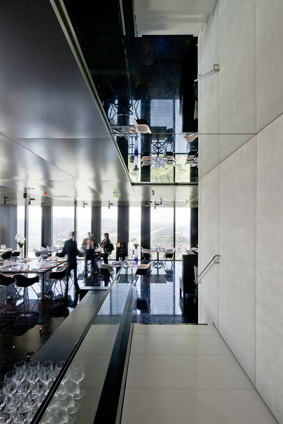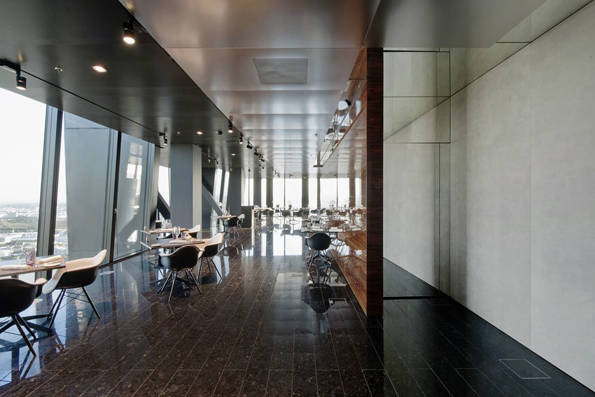 Die Innenraumgestaltung orientiert sich am vorgegebenen architektonischen Material- und Farbkonzept des DC-Towers. Dunkle Farben im Innenraum reflektieren sich kaum in den Glasflächen der Fassade und überblenden daher nicht die Aussicht. Spiegelflächen entlang des Kernes an der Decke der Ebene +57 und den Wänden der Ebene +58 verbinden optisch die beiden Geschoße und erweitern im Terrassengeschoß die beengten räumlichen Verhältnisse. Die mit grauem Alkantara bespannten Paneelverkleidungen der Gebäudekernwände bilden einen neutralen und auch akustisch wirksamen Hintergrund für den Blick über Wien.