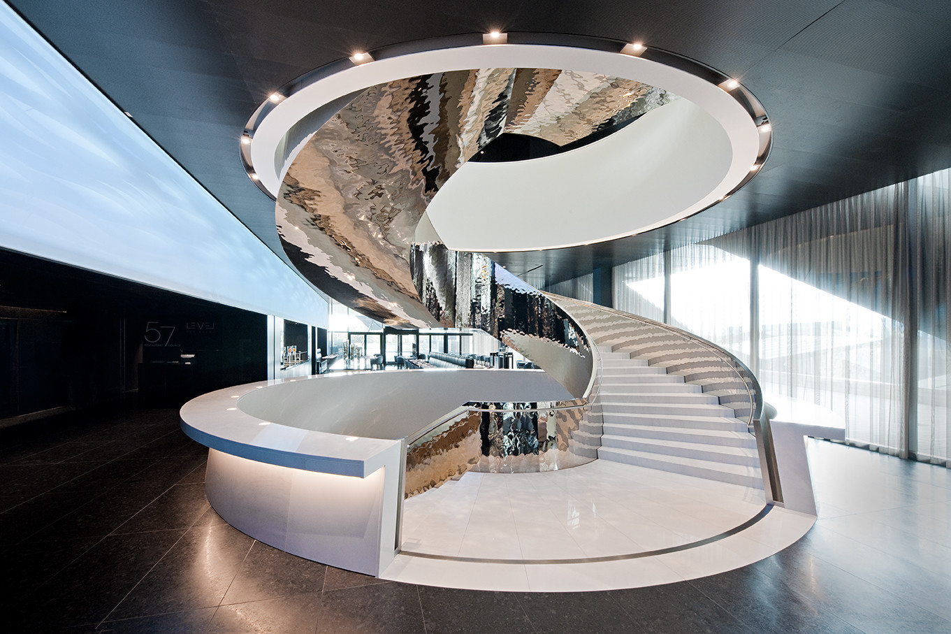 Wesentliches Gestaltungselement im Hoteleingangsbereich ist ein sich über vier Ebenen erstreckender Treppenkonus. Grundlegende Aspekte, um die räumlichen und skulpturalen Qualitäten der konusförmigen Treppe hervorzuheben, liegen in ihrer Material- und Oberflächenwahl sowie der Ausführung mit einer nicht transparenten Brüstung. Weiße Marmorstufen sind von champagnerfarbenen, gewellten Edelstahlblechtafeln gefasst.