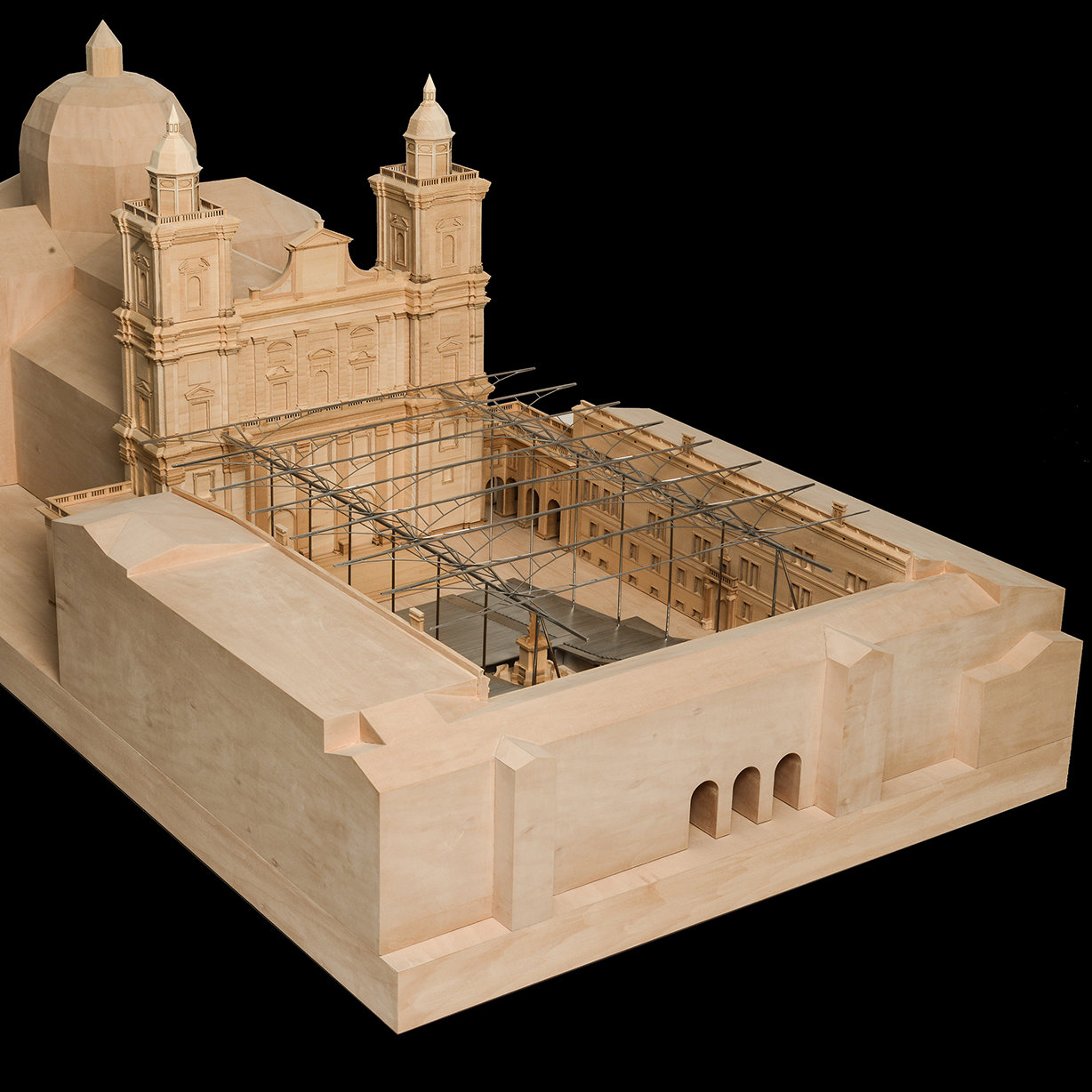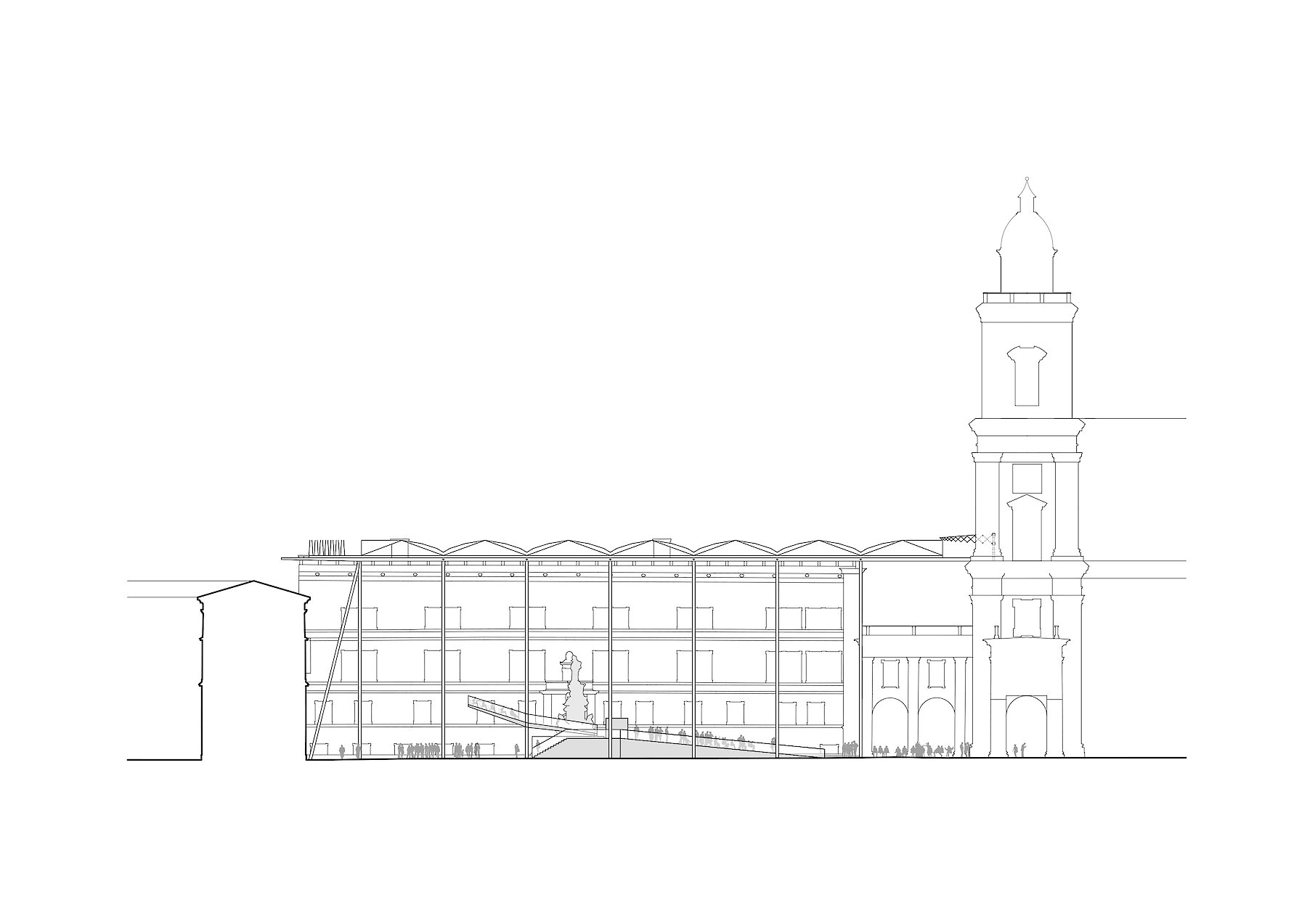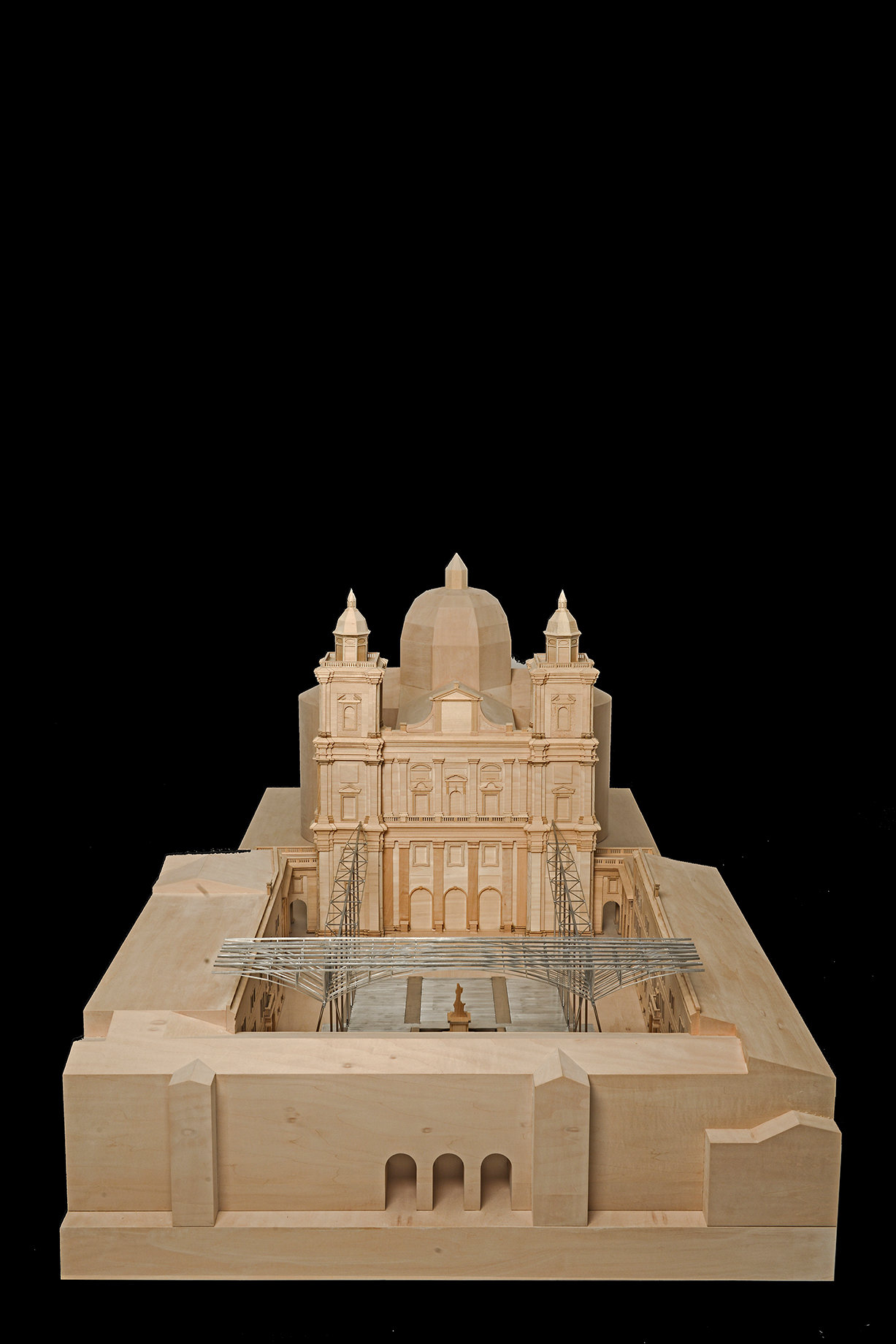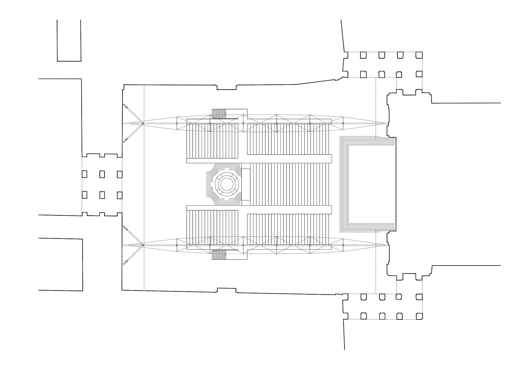 Die vorgesehene Überdachung in Höhe des ersten Hauptgesimses der Domfassade überragt das umliegende Platzensemble und bildet somit einen nicht einengenden Abschluss nach oben.