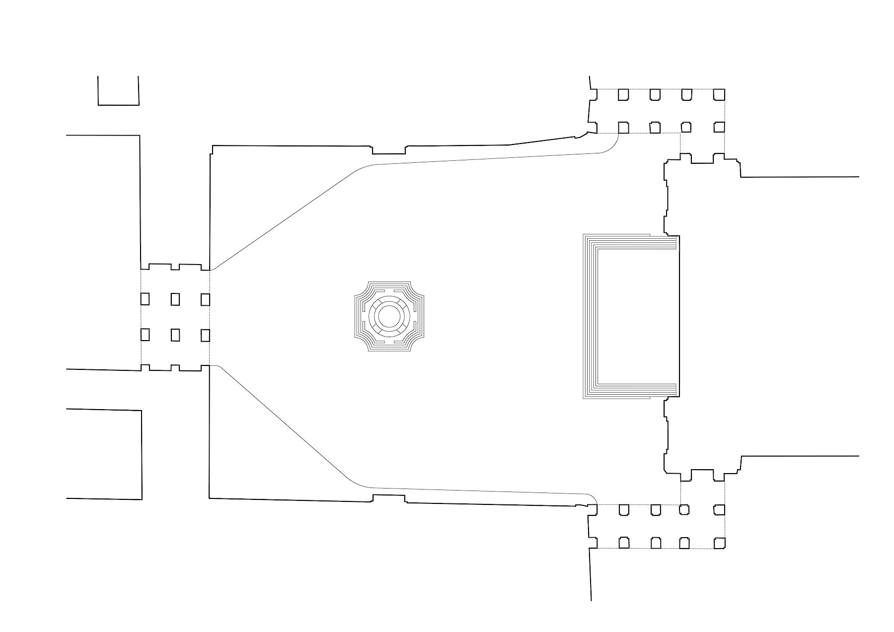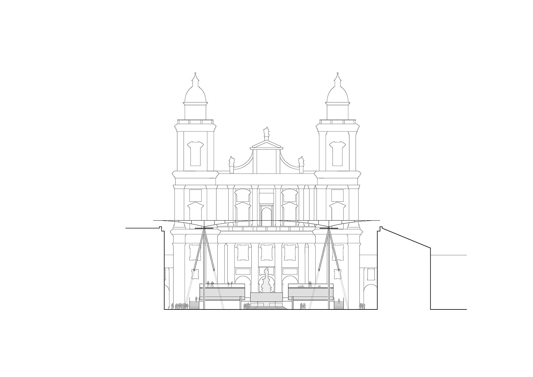 Die vorgesehene Überdachung in Höhe des ersten Hauptgesimses der Domfassade überragt das umliegende Platzensemble und bildet somit einen nicht einengenden Abschluss nach oben.