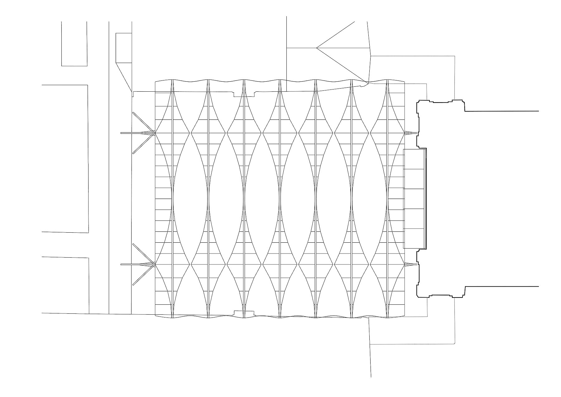 Das aufgespannte Faltwerk entspricht in seiner Grundrissprojektion dem Tribünen- und Bühnenumriss, erhält in diesem Zustand den großzügigen Eindruck des Platzensembles und ermöglicht eine kontrollierte Wasserableitung.