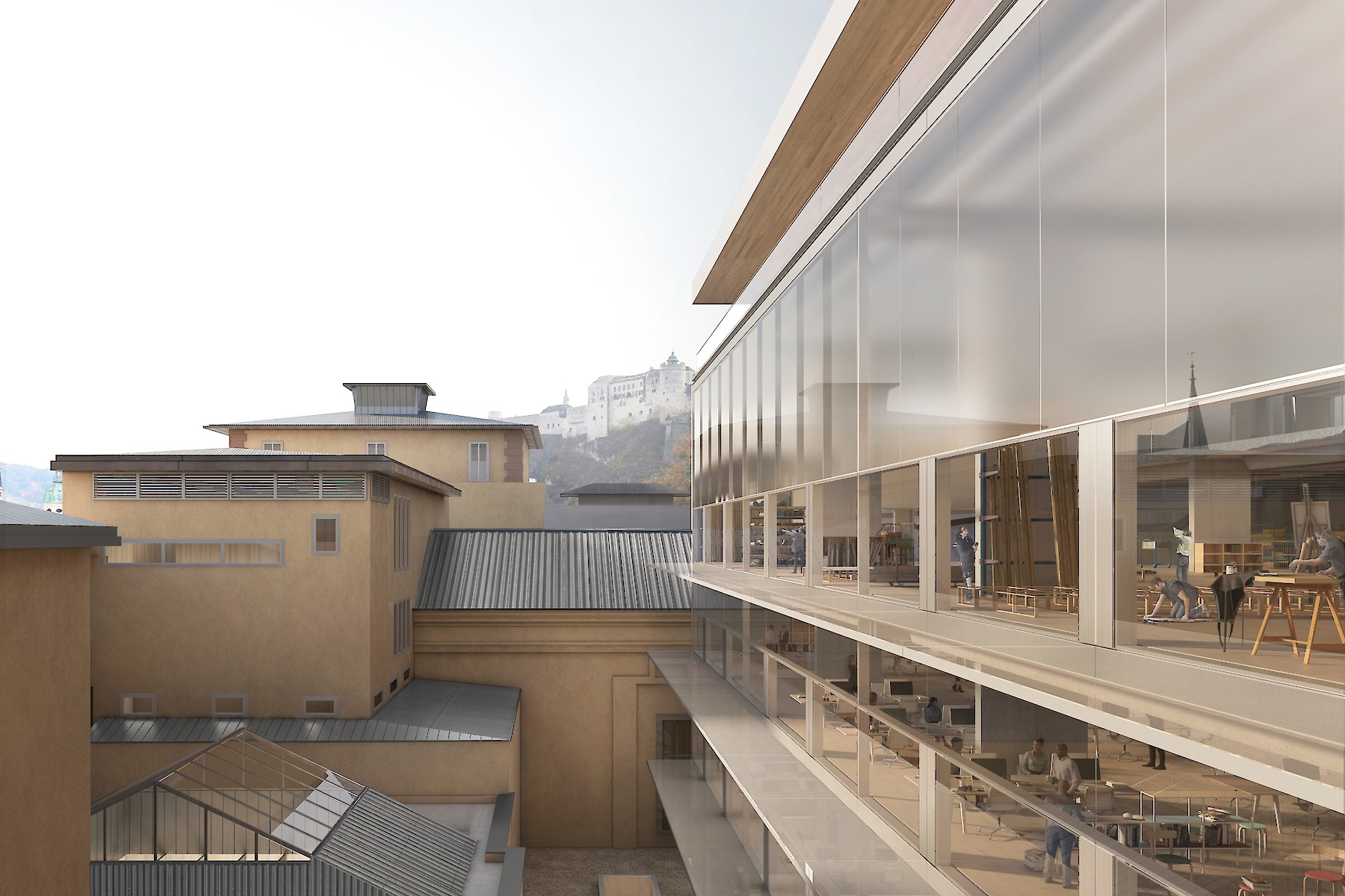 Um innerhalb der äußerst beengten räumlichen Verhältnisse des Innenhofes einen möglichst hohen Tageslichteintrag zu erzielen, sind die Fassadenbereiche umfassend verglast. Diese Tatsache schafft eine konstante Sichtverbindung in den angrenzenden Außenraum und damit auch einen Einblick in die Nachbarschaft, eine blickhafte Wechselbeziehung, die im gleichen Maße aus den Bestandsgebäuden in den regen Produktionsbereich gegeben ist. Nachbarschaftliche Einblicke, wie auch eine allfällige Blendung in den neuen Arbeitsbereichen, können mit einem innenliegenden Rollo je nach Bedarf dosiert werden. In den Malersälen wird im oberen Fassadenbereich eine transluzente Kapillarverglasung angeordnet, welche großflächig für gestreutes Licht im Bereich der Werkstätte sorgt. Unterhalb der mattierten Verglasung wird, wie in den übrigen Geschossen, mit der transparenten Verglasung eine Blickbeziehung in das Umfeld ermöglicht. Die Blickbeziehung im gesamten Neubau ist nicht nur in den Außenraum, sondern auch über die gesamte Raumtiefe gegeben, und reicht damit von der Felswand des Mönchsberges bis über die Dachlandschaft der umliegenden Bauten hinaus.