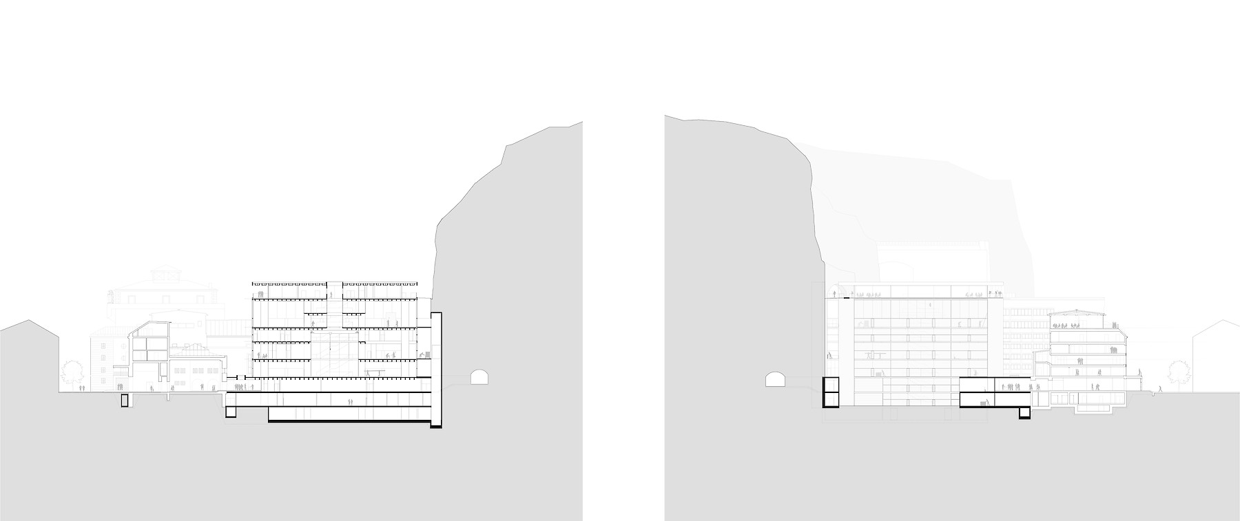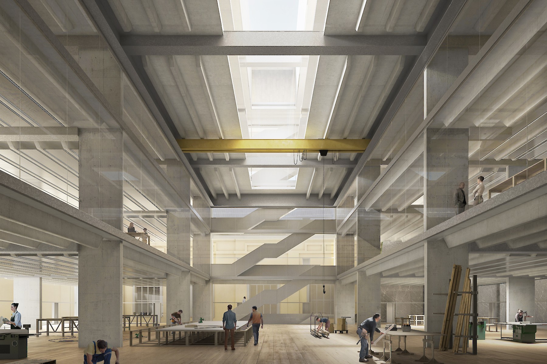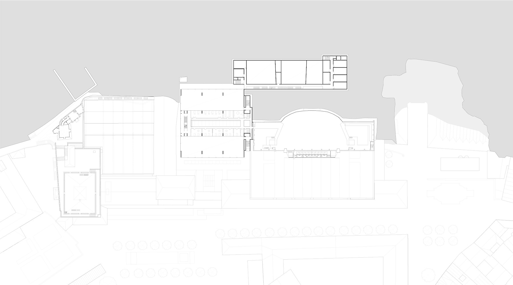 Innerhalb des dichten Baubestands der Festspielhäuser wird mit dem Abbruch des Werkstättentrakts ein Freibereich geschaffen, der nicht nur das Flächenangebot der Werkstätten im Neubau erweitert, sondern mit seiner Anordnung auch eine effiziente Anbindung an die Funktionsbereiche der unmittelbaren Nachbarschaft ermöglichen soll. Der neue logistische Schwerpunkt ist innerhalb des Hofes mit seiner Kontur vom Bestand abgesetzt und mit dieser Form der räumlichen Eigenständigkeit als neuer Eingriff im Bestandsensemble der Festspielhäuser klar ablesbar. Die Kontur des neuen Volumens erweitert sich auch in die Gebäudenische entlang der Feuermauer des großen Festspielhauses, um in dieser Lage zwei Fluchttreppenhäuser zu verorten, die mit ihrer Randlage die Werkstattgrundrisse wesentlich entlasten. Das dritte Treppenhaus verläuft entlang der Fassade zum Karl-Böhm-Saal, verfügt, wie alle Treppenhäuser im Werkstättentrakt, über einen Tageslichteintrag und bietet zugleich zahlreiche Sichtbeziehungen in den Innenhof. Gemeinsam ist allen drei Treppenhäusern die periphere Anordnung in der Grundrissfigur, die wiederum wesentlich von einer weitgespannten, statischen Struktur des Neubaus bestimmt wird. Die Wahl der statischen Mittel ist auch von der Absicht geprägt, weitgehend zusammenhängende, verfügbare Nutzungsbereiche zu schaffen, die nicht nur temporäre Raumzuschnitte, sondern auch weitgehend von Einbauten entlastete Arbeitsbereiche ermöglichen. Entlang der dreigeschossigen zentralen Halle, die für Seitenbühne und Tischlerei genutzt wird, ordnen sich über die darüber liegenden Geschossflächen sämtliche Werkstätten, wie auch die entsprechenden Büroeinheiten an.
