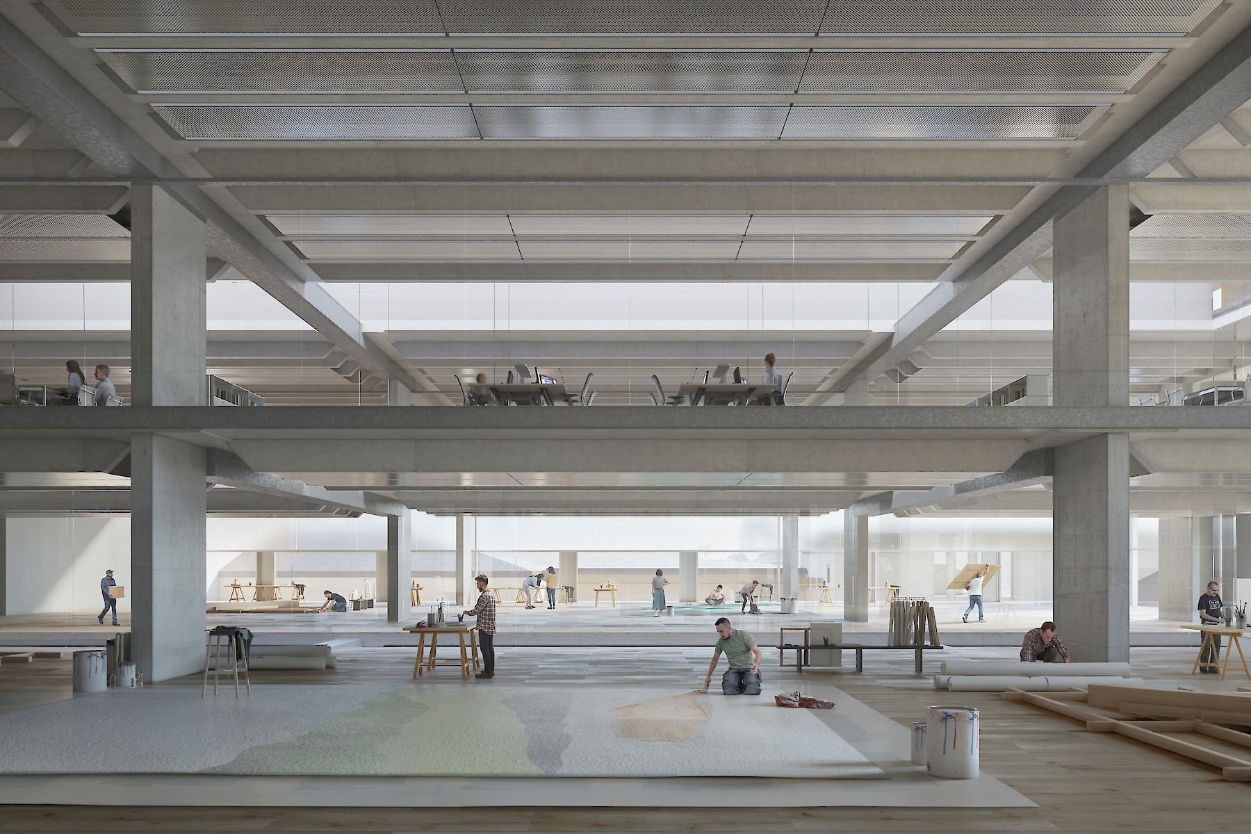 Die Vielzahl der durchgehenden Sichtbeziehungen ist von unterschiedlich intensiven Lichteinträgen differenziert, womit nicht nur die Wahrnehmung geschärft, sondern auch die räumliche Wirkung potenziert wird. Der Hofzuschnitt lässt keinen ausgeprägten Sonnenlichteintrag in die Produktionsbereiche erwarten, für den aber trotzdem ein mobiler Sonnenschutz vorgesehen ist, der bei Bedarf Spitzen eines allfälligen Wärmeeintrages entlang der Fassadehülle abschirmen kann. Das oberste Geschoss nimmt die Gemeinschaftsbereiche von Betriebsrestaurant und Shared Workspaces & Lounge auf, die räumlich durch den zentralen Lichthof voneinander getrennt sind. Beide Funktionsbereiche sind von einer horizontalen Dachfläche überspannt, die für die angrenzenden Terrassenbereiche einen Sonnen-, wie auch Regenschutz dauerhaft anbieten.