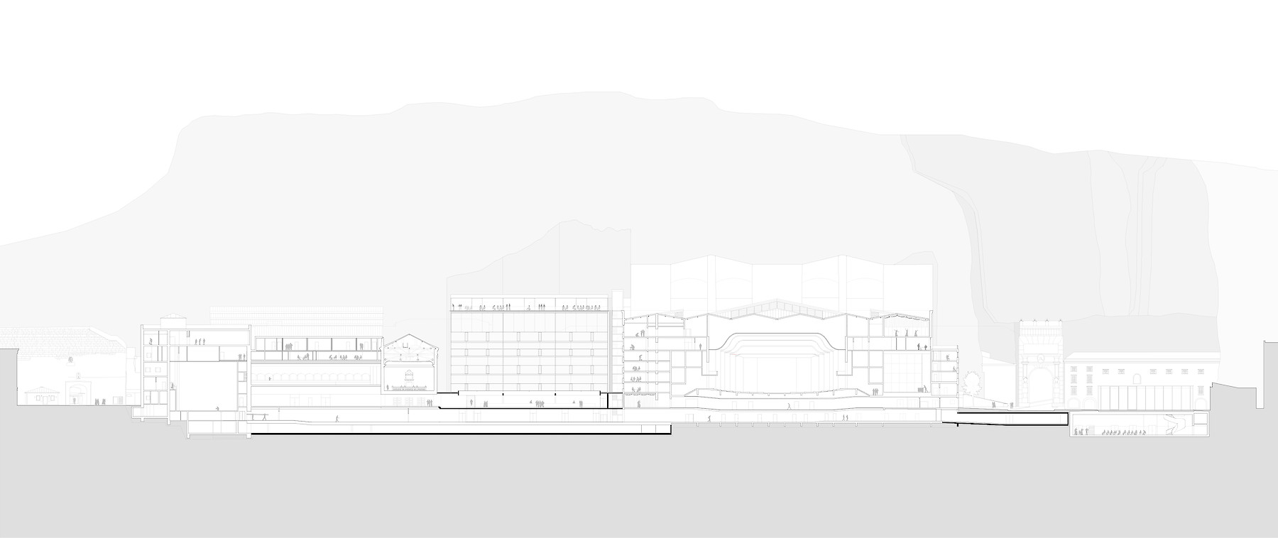 Die Dachfläche selbst ist vom Bühnenturm abgesetzt und schafft lediglich mit ihrer Beschüttung aus geschreddertem Kavernenaushub eine sichtbare Analogie zur Umgebung, die sich über das Material und nicht über eine formale Anleihe erklärt. Die Dachfläche selbst entzieht sich mit ihrer horizontalen Ausrichtung der bereits sehr ausgeprägten tektonischen Anmutung der angrenzenden Dachlandschaft und damit auch einer Überfrachtung der bestehenden Dachtopographie des Festspielbezirkes.