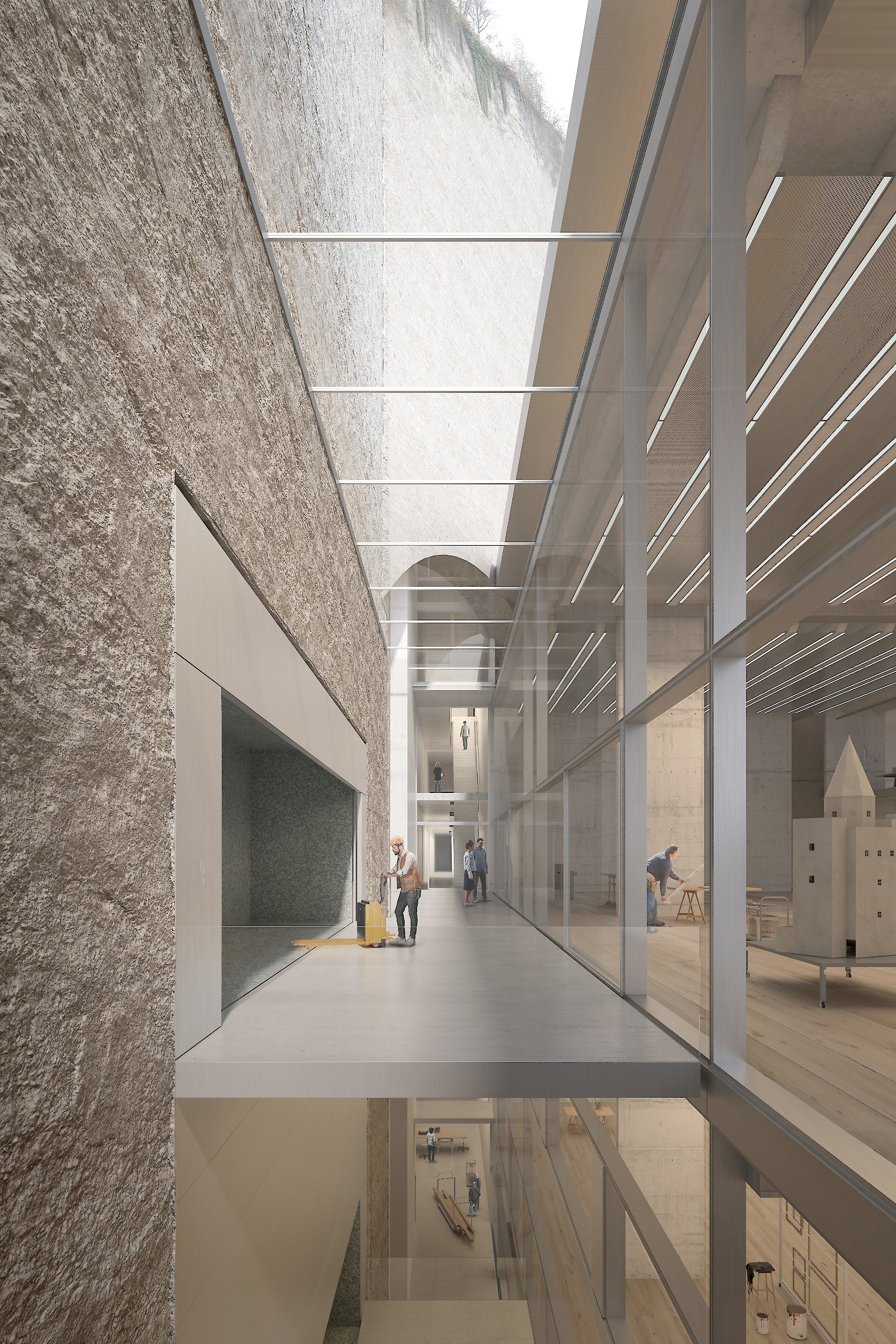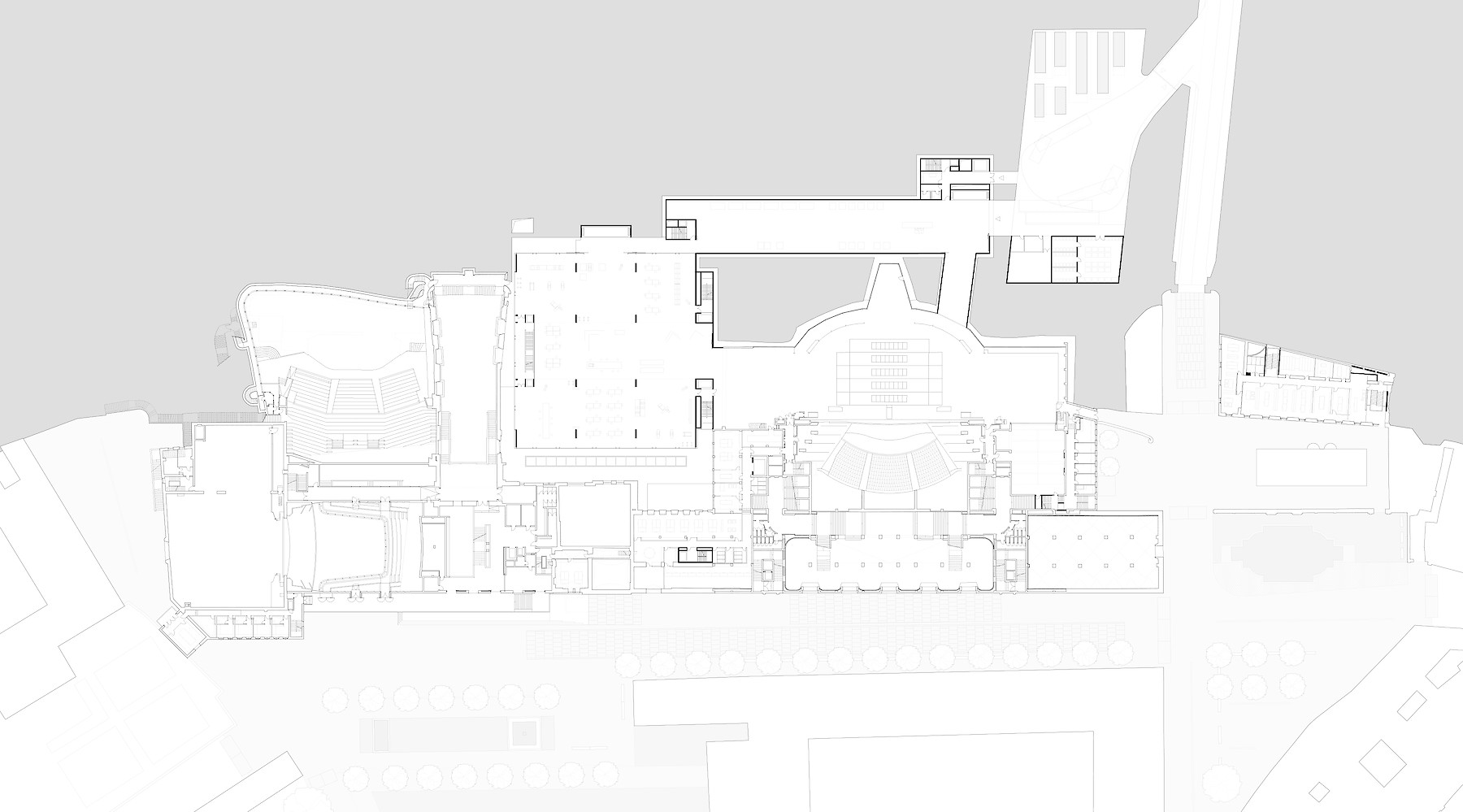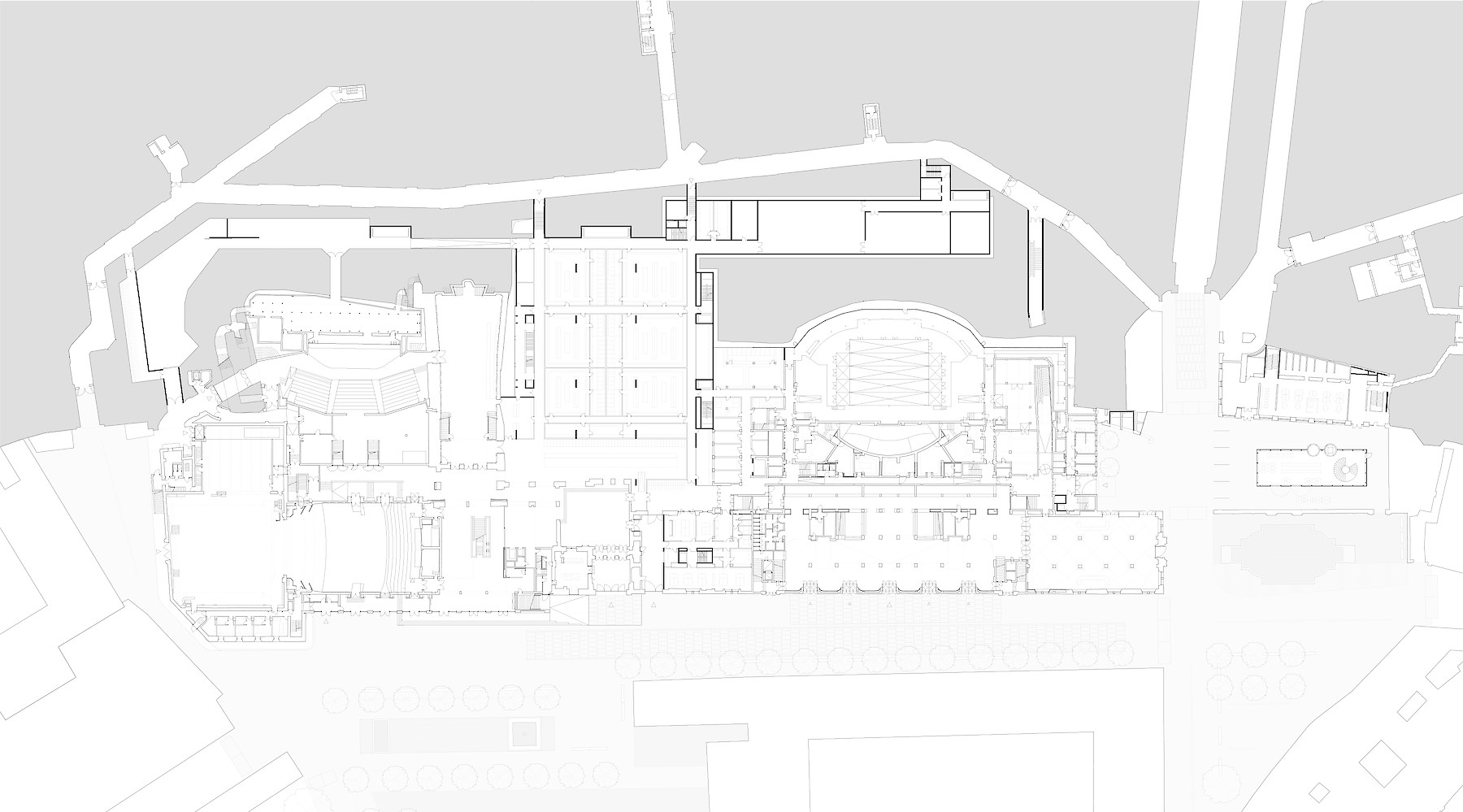 Innerhalb des dichten Baubestands der Festspielhäuser wird mit dem Abbruch des Werkstättentrakts ein Freibereich geschaffen, der nicht nur das Flächenangebot der Werkstätten im Neubau erweitert, sondern mit seiner Anordnung auch eine effiziente Anbindung an die Funktionsbereiche der unmittelbaren Nachbarschaft ermöglichen soll. Der neue logistische Schwerpunkt ist innerhalb des Hofes mit seiner Kontur vom Bestand abgesetzt und mit dieser Form der räumlichen Eigenständigkeit als neuer Eingriff im Bestandsensemble der Festspielhäuser klar ablesbar. Die Kontur des neuen Volumens erweitert sich auch in die Gebäudenische entlang der Feuermauer des großen Festspielhauses, um in dieser Lage zwei Fluchttreppenhäuser zu verorten, die mit ihrer Randlage die Werkstattgrundrisse wesentlich entlasten. Das dritte Treppenhaus verläuft entlang der Fassade zum Karl-Böhm-Saal, verfügt, wie alle Treppenhäuser im Werkstättentrakt, über einen Tageslichteintrag und bietet zugleich zahlreiche Sichtbeziehungen in den Innenhof. Gemeinsam ist allen drei Treppenhäusern die periphere Anordnung in der Grundrissfigur, die wiederum wesentlich von einer weitgespannten, statischen Struktur des Neubaus bestimmt wird. Die Wahl der statischen Mittel ist auch von der Absicht geprägt, weitgehend zusammenhängende, verfügbare Nutzungsbereiche zu schaffen, die nicht nur temporäre Raumzuschnitte, sondern auch weitgehend von Einbauten entlastete Arbeitsbereiche ermöglichen. Entlang der dreigeschossigen zentralen Halle, die für Seitenbühne und Tischlerei genutzt wird, ordnen sich über die darüber liegenden Geschossflächen sämtliche Werkstätten, wie auch die entsprechenden Büroeinheiten an.