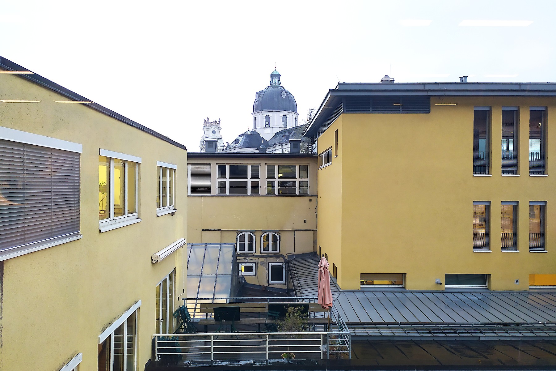 Um innerhalb der äußerst beengten räumlichen Verhältnisse des Innenhofes einen möglichst hohen Tageslichteintrag zu erzielen, sind die Fassadenbereiche umfassend verglast. Diese Tatsache schafft eine konstante Sichtverbindung in den angrenzenden Außenraum und damit auch einen Einblick in die Nachbarschaft, eine blickhafte Wechselbeziehung, die im gleichen Maße aus den Bestandsgebäuden in den regen Produktionsbereich gegeben ist. Nachbarschaftliche Einblicke, wie auch eine allfällige Blendung in den neuen Arbeitsbereichen, können mit einem innenliegenden Rollo je nach Bedarf dosiert werden. In den Malersälen wird im oberen Fassadenbereich eine transluzente Kapillarverglasung angeordnet, welche großflächig für gestreutes Licht im Bereich der Werkstätte sorgt. Unterhalb der mattierten Verglasung wird, wie in den übrigen Geschossen, mit der transparenten Verglasung eine Blickbeziehung in das Umfeld ermöglicht. Die Blickbeziehung im gesamten Neubau ist nicht nur in den Außenraum, sondern auch über die gesamte Raumtiefe gegeben, und reicht damit von der Felswand des Mönchsberges bis über die Dachlandschaft der umliegenden Bauten hinaus.