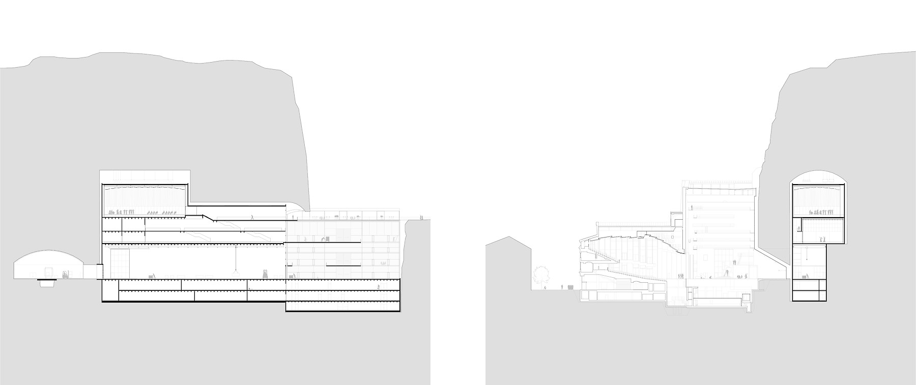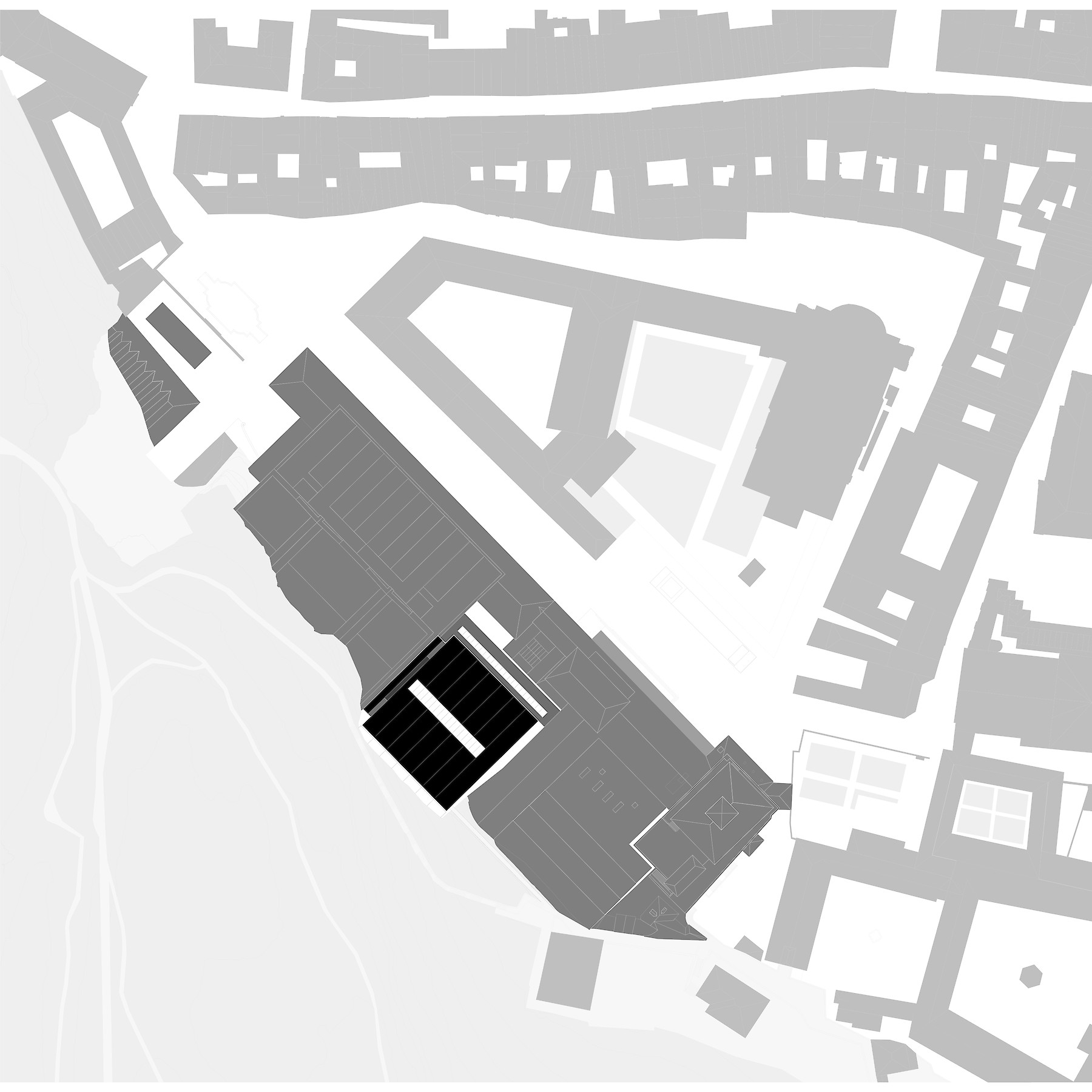 Die Dachfläche selbst ist vom Bühnenturm abgesetzt und schafft lediglich mit ihrer Beschüttung aus geschreddertem Kavernenaushub eine sichtbare Analogie zur Umgebung, die sich über das Material und nicht über eine formale Anleihe erklärt. Die Dachfläche selbst entzieht sich mit ihrer horizontalen Ausrichtung der bereits sehr ausgeprägten tektonischen Anmutung der angrenzenden Dachlandschaft und damit auch einer Überfrachtung der bestehenden Dachtopographie des Festspielbezirkes.