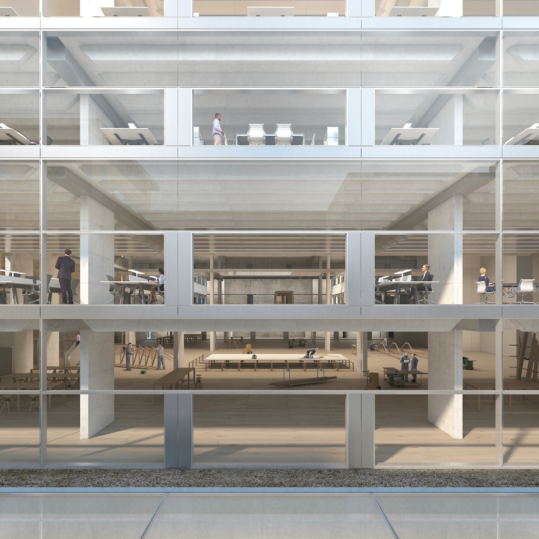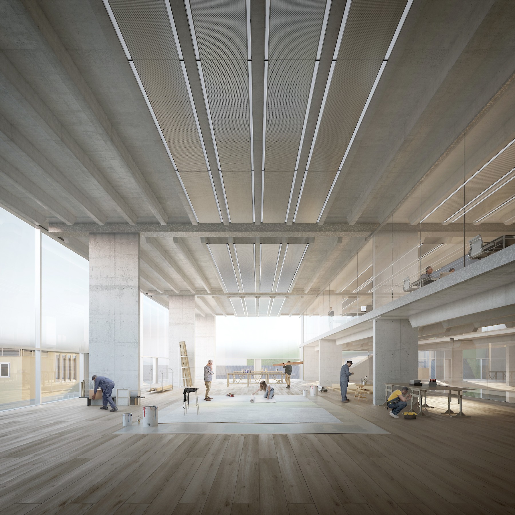 Die Vielzahl der durchgehenden Sichtbeziehungen ist von unterschiedlich intensiven Lichteinträgen differenziert, womit nicht nur die Wahrnehmung geschärft, sondern auch die räumliche Wirkung potenziert wird. Der Hofzuschnitt lässt keinen ausgeprägten Sonnenlichteintrag in die Produktionsbereiche erwarten, für den aber trotzdem ein mobiler Sonnenschutz vorgesehen ist, der bei Bedarf Spitzen eines allfälligen Wärmeeintrages entlang der Fassadehülle abschirmen kann. Das oberste Geschoss nimmt die Gemeinschaftsbereiche von Betriebsrestaurant und Shared Workspaces & Lounge auf, die räumlich durch den zentralen Lichthof voneinander getrennt sind. Beide Funktionsbereiche sind von einer horizontalen Dachfläche überspannt, die für die angrenzenden Terrassenbereiche einen Sonnen-, wie auch Regenschutz dauerhaft anbieten.