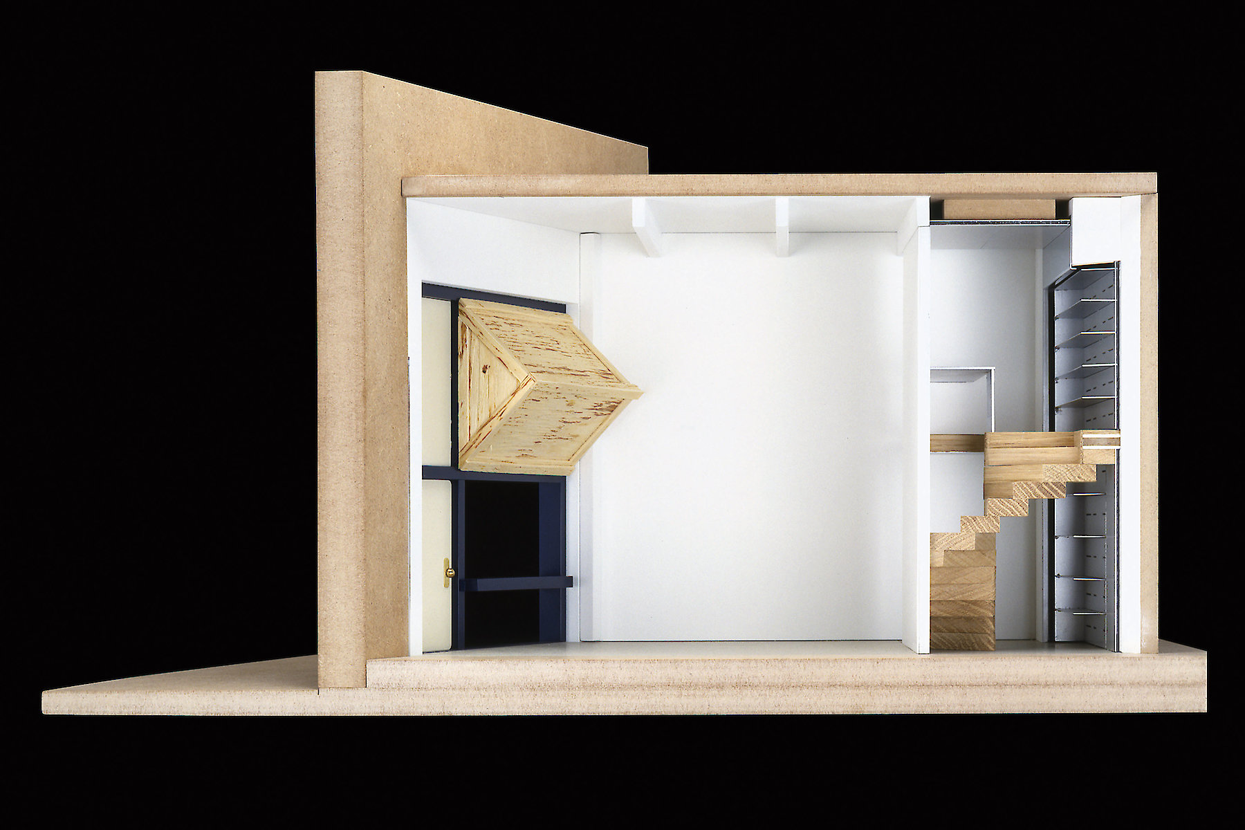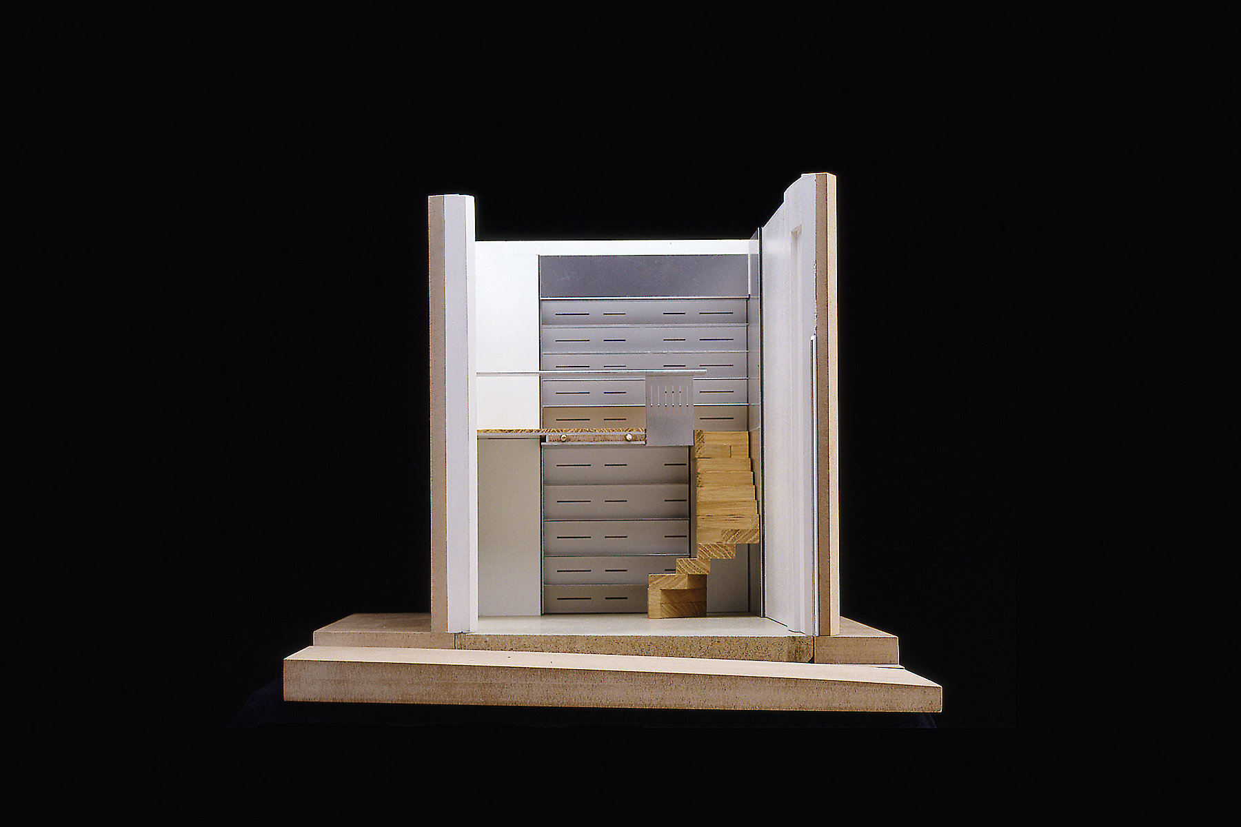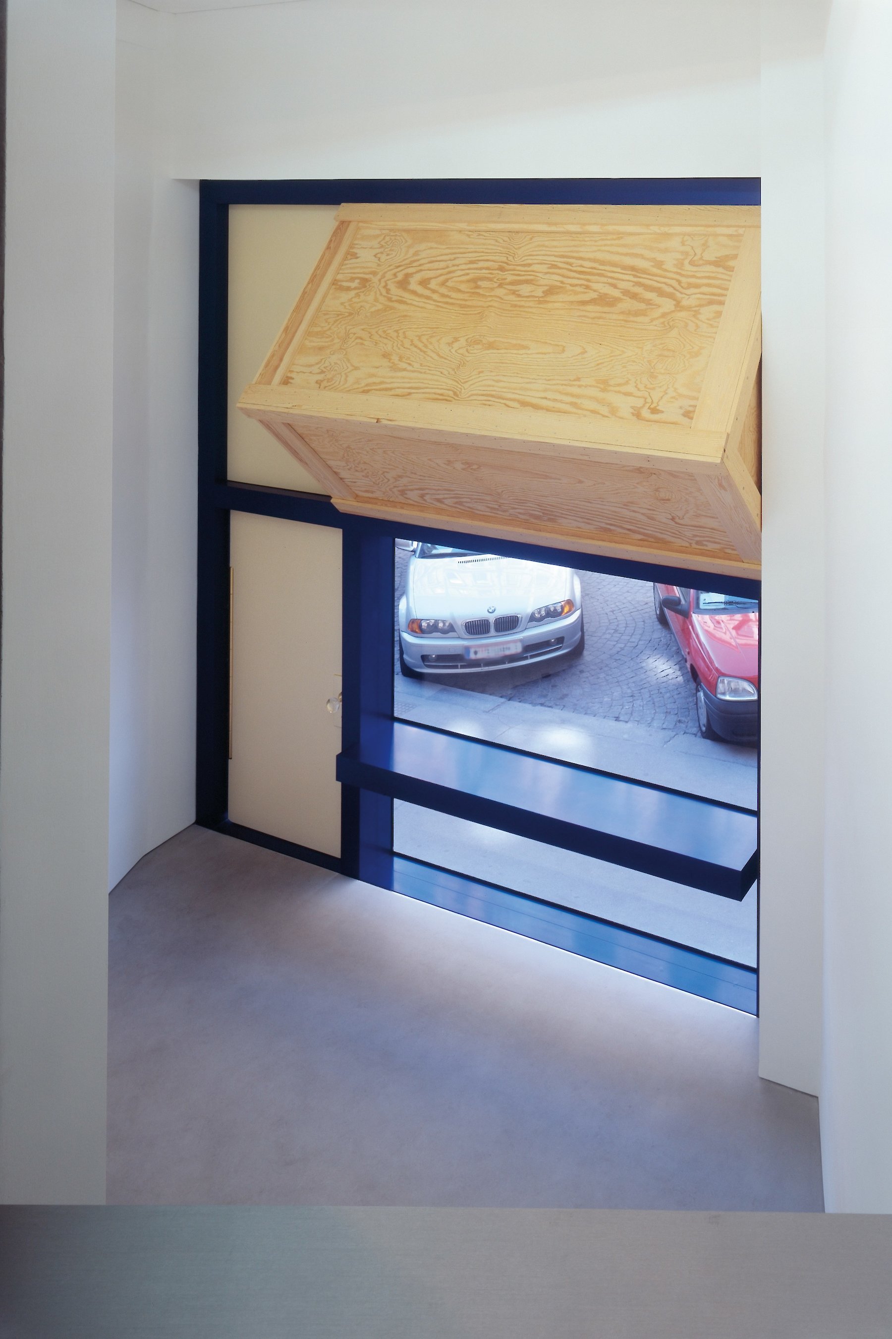 Der Reiz der Aufgabe bestand nicht nur in der Zusammenarbeit mit dem Galeristen und dem Künstler, sondern auch in der Tatsache, dass ein isoliert wirksames künstlerisches Objekt zu einem Teil der architektonischen Hülle mutiert. Auf engstem Raum vier funktionelle Anforderungen so zu verhandeln, dass der zweckgebundene Hintergrund nicht zwangsläufig zum Vordergrund wird, der so jegliche künstlerische Aussage überstrahlt, war wesentliches Thema der architektonischen Auseinandersetzung.