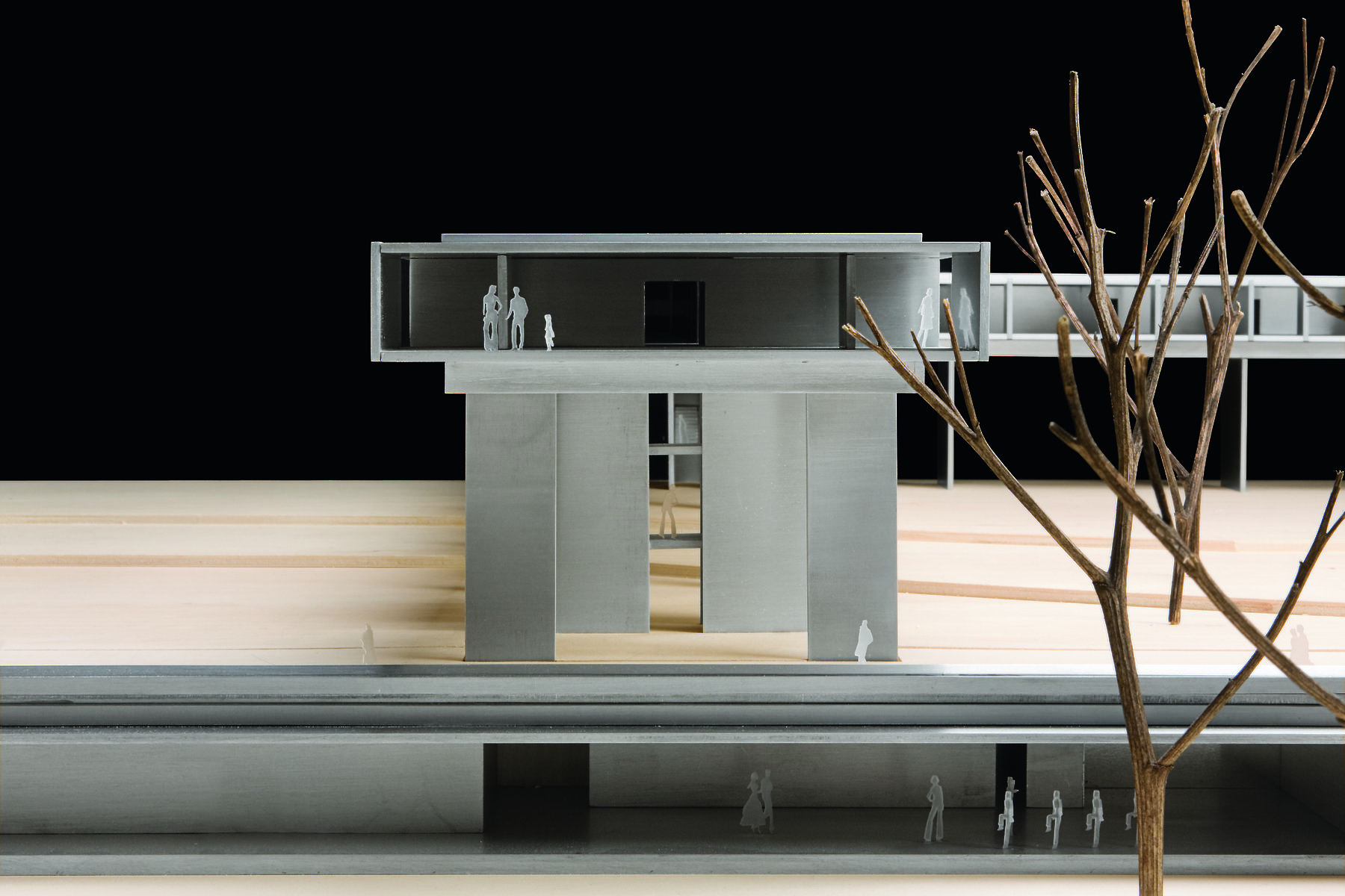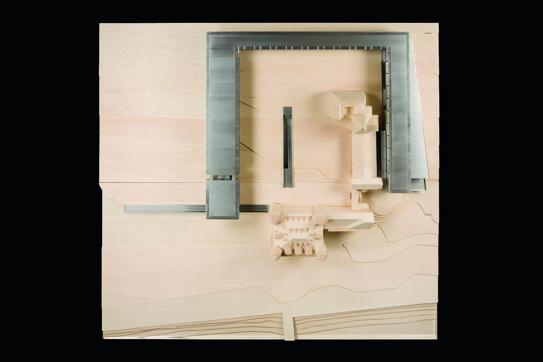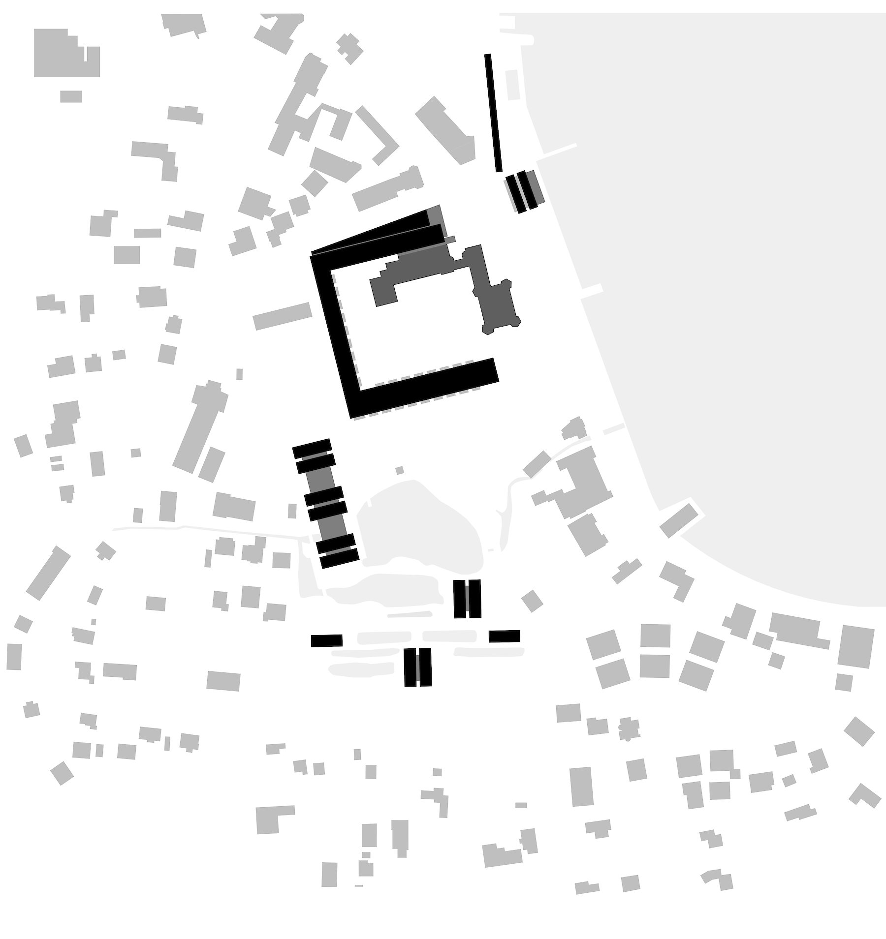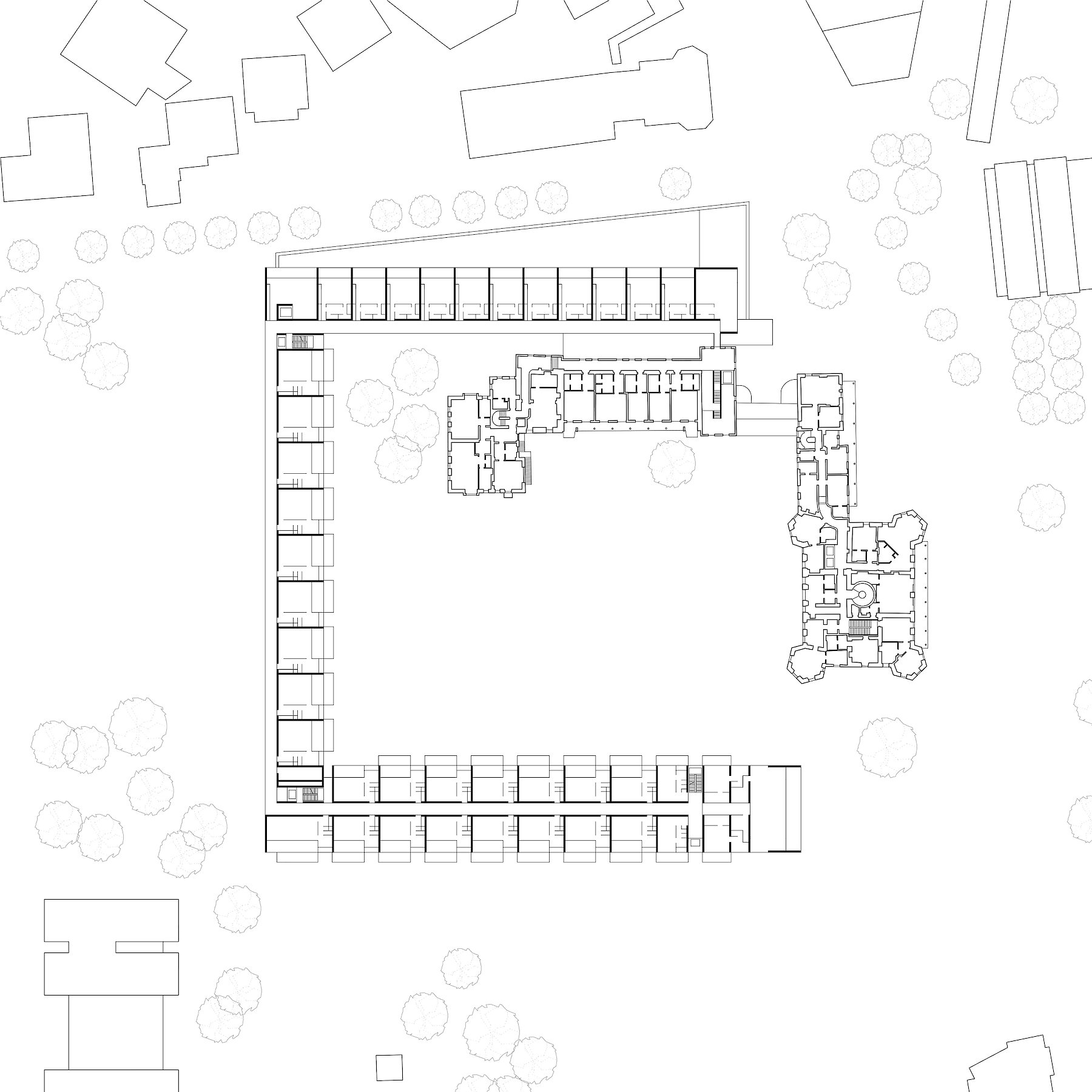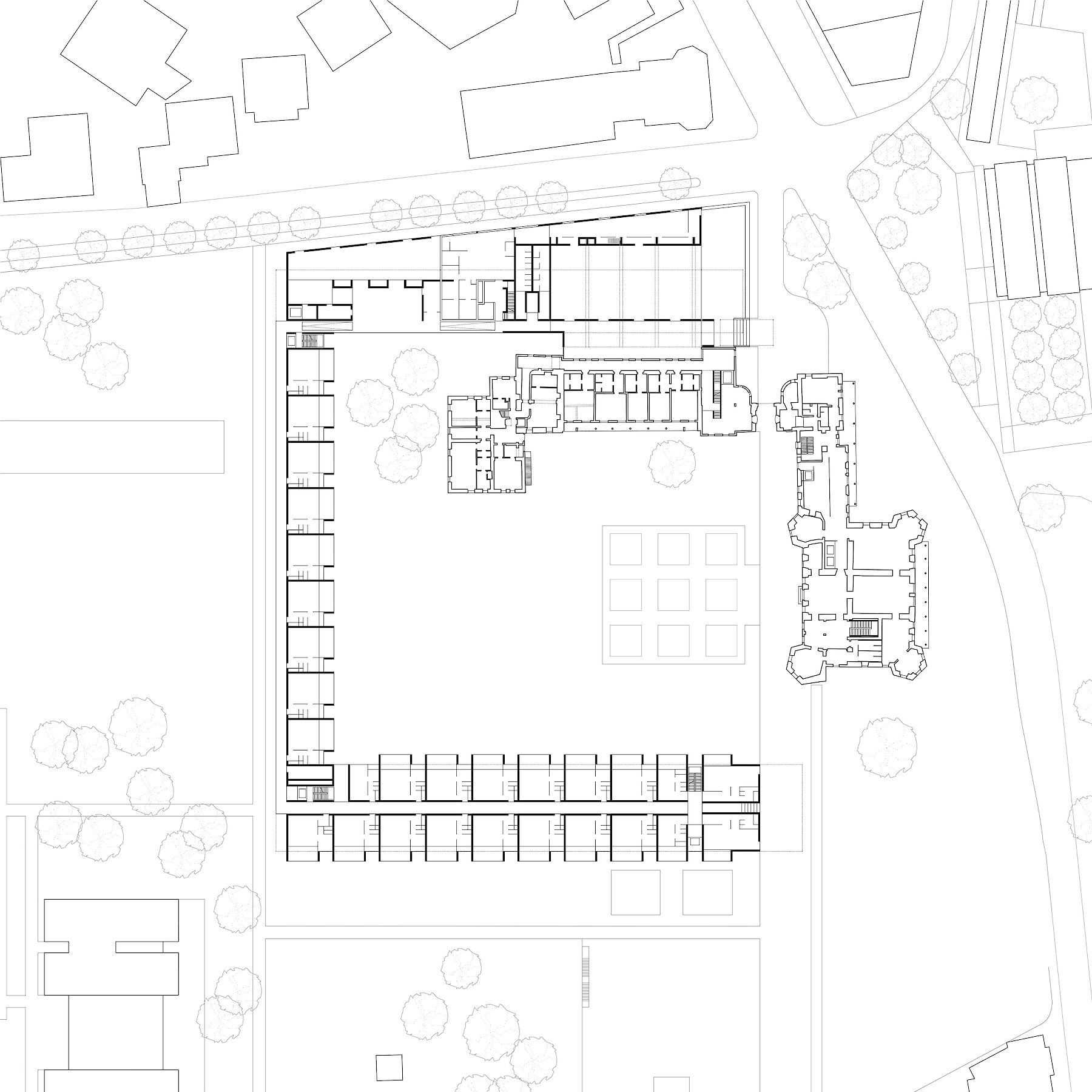 Auf den Wunsch nach einer erweiterten und deutlich sichtbaren Identität des Ortes reagierte der Entwurf mit einem Ensemble von drei Baukörpergruppen, die mit ihrer gemeinsamen Formensprache eine Einheit bilden, auch wenn sie nicht immer in unmittelbarer Nachbarschaft zueinander angeordnet sind.