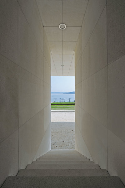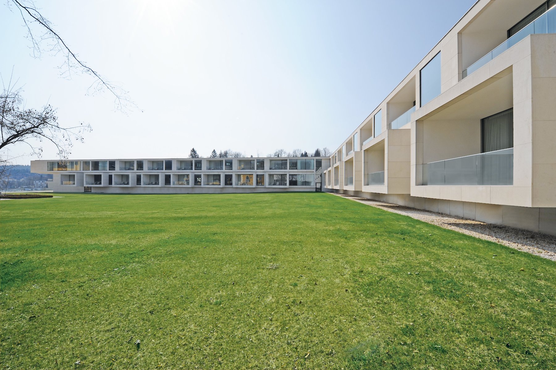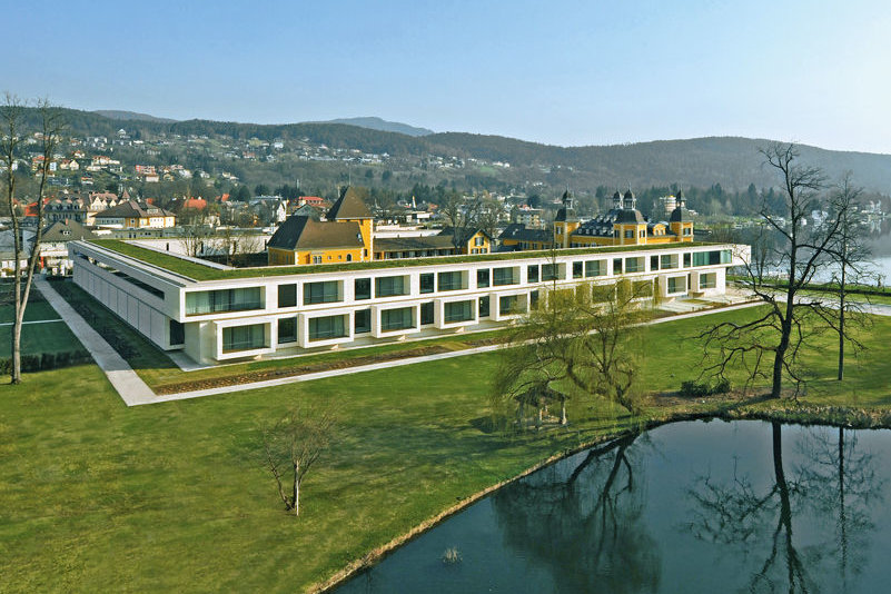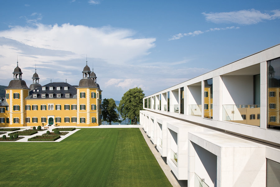 Der Mittel- oder Ausgangspunkt für die Erschließung der Gesamtanlage ist im Übergang zwischen Hotelerweiterung und Schloss angeordnet. Entlang einer linearen Verkehrsfläche sind die Haupttreppen des Neubaus sowie die wesentlichen Funktionsbereiche der Hotelanlage angeordnet. Der Promenadencharakter dieser Erschließungszone wird auch in der Ebene oberhalb wiederholt, doch ist er in dieser Lage nicht Funktionsbereichen, sondern möglichen Sichtbeziehungen zur Parklandschaft und dem See zugeordnet. Zum Straßenraum hin werden beide Flächen der Erschließung markant durch den Kurbereich getrennt, der auf diese Weise zur klaren Zäsur zwischen dem Parkareal und dem angrenzenden öffentlichen Raum wird. Die im Straßenbild sehr präsente Fassadenfläche des Kurbereiches wird zur Gänze in Glas aufgelöst und verliert damit nicht nur an Präsenz, sondern ermöglicht auch eine großzügige Sichtbeziehung zum See. Diese klar definierte Geländekante verändert die bestehende Geländetopografie und bewirkt im Parkareal einen neuen ebenen Flächenanteil.
