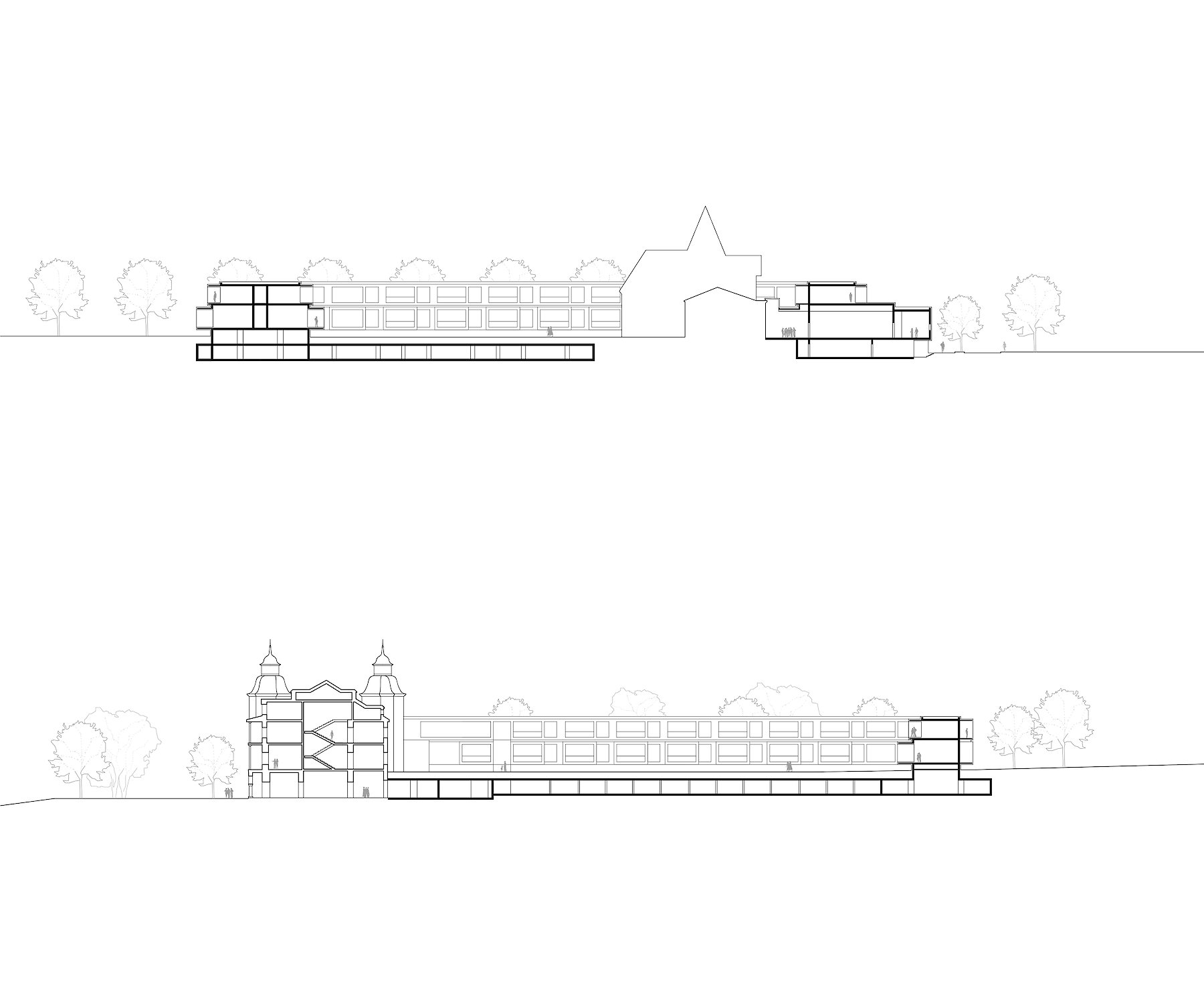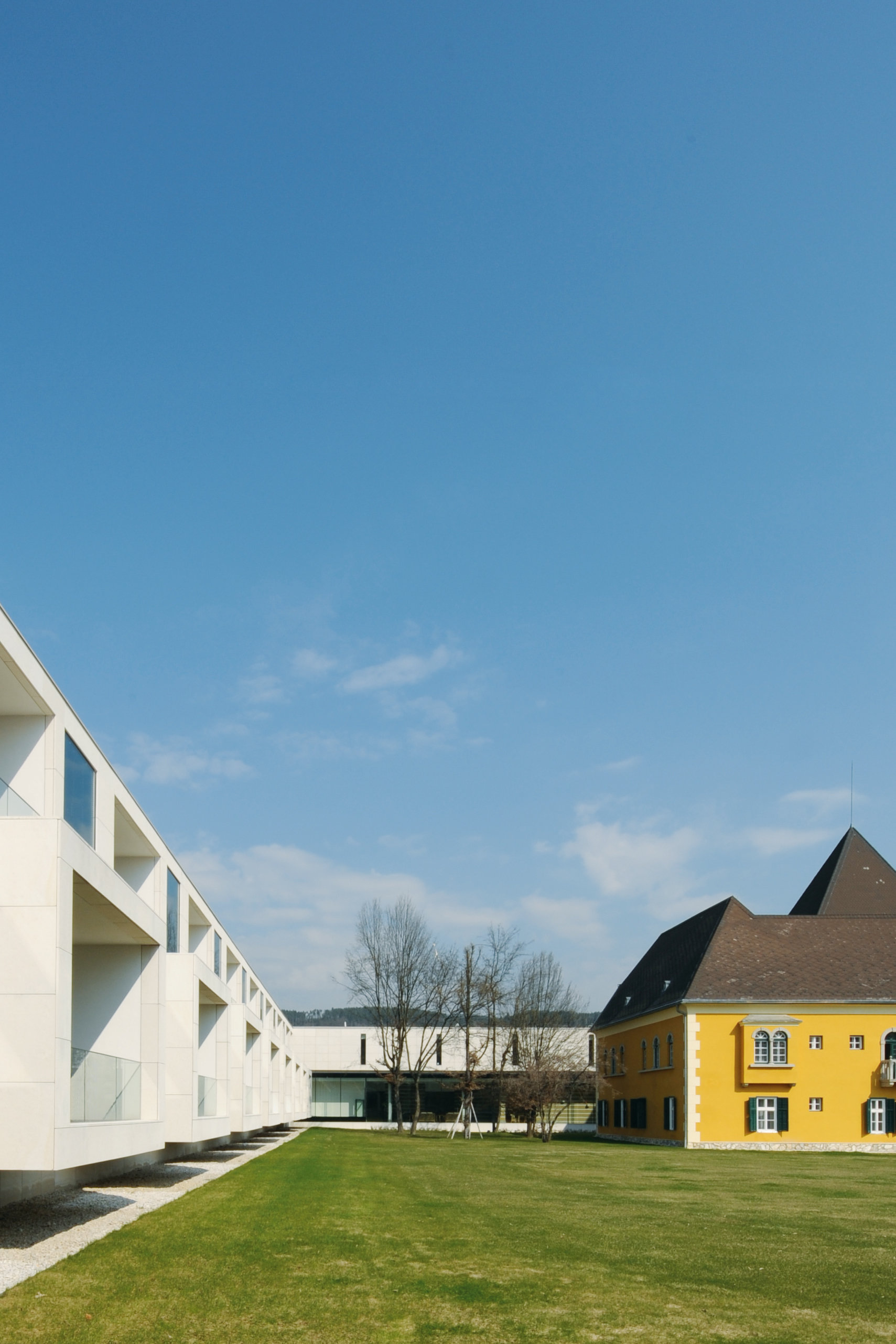 Der Mittel- oder Ausgangspunkt für die Erschließung der Gesamtanlage ist im Übergang zwischen Hotelerweiterung und Schloss angeordnet. Entlang einer linearen Verkehrsfläche sind die Haupttreppen des Neubaus sowie die wesentlichen Funktionsbereiche der Hotelanlage angeordnet. Der Promenadencharakter dieser Erschließungszone wird auch in der Ebene oberhalb wiederholt, doch ist er in dieser Lage nicht Funktionsbereichen, sondern möglichen Sichtbeziehungen zur Parklandschaft und dem See zugeordnet. Zum Straßenraum hin werden beide Flächen der Erschließung markant durch den Kurbereich getrennt, der auf diese Weise zur klaren Zäsur zwischen dem Parkareal und dem angrenzenden öffentlichen Raum wird. Die im Straßenbild sehr präsente Fassadenfläche des Kurbereiches wird zur Gänze in Glas aufgelöst und verliert damit nicht nur an Präsenz, sondern ermöglicht auch eine großzügige Sichtbeziehung zum See. Diese klar definierte Geländekante verändert die bestehende Geländetopografie und bewirkt im Parkareal einen neuen ebenen Flächenanteil.