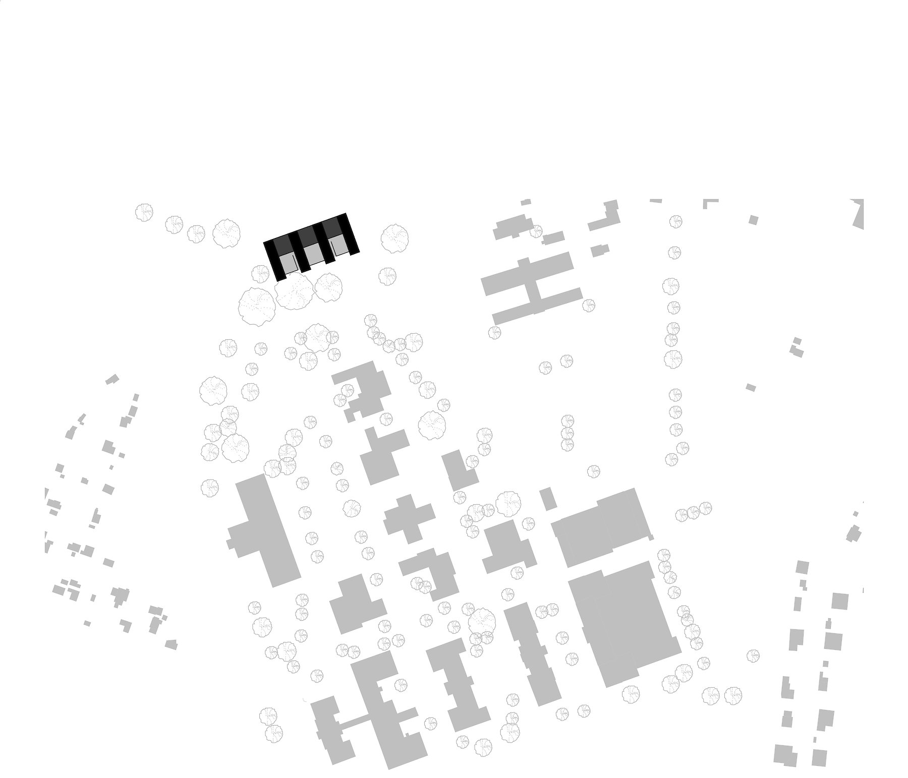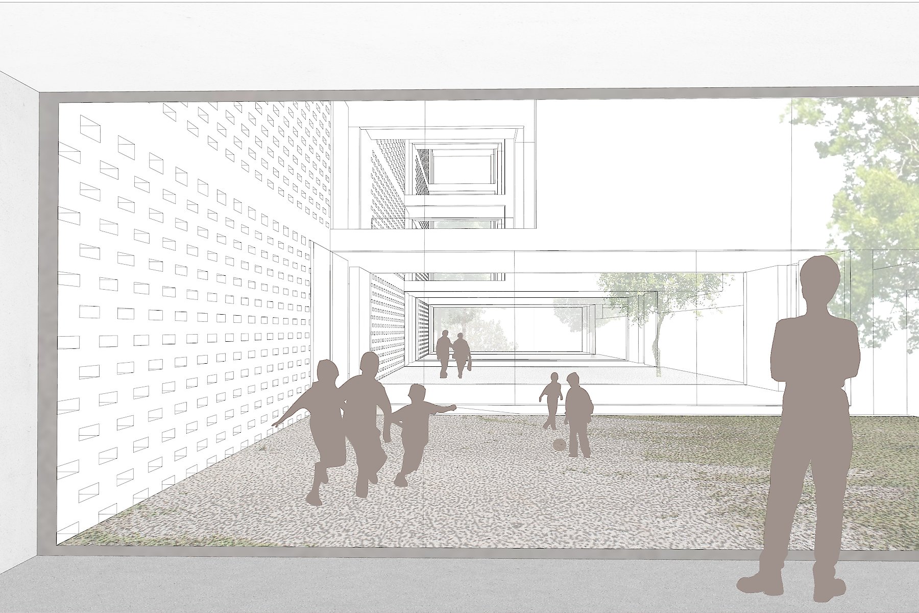 Mit seiner Anordnung bietet der Entwurf nicht nur ein differenziertes Angebot an Außenräumen, sondern ermöglicht auch mit der Ausbildung seiner Volumina eine klare Ablesbarkeit der einzelnen Funktionsbereiche innerhalb der gesamten Gebäudekontur.