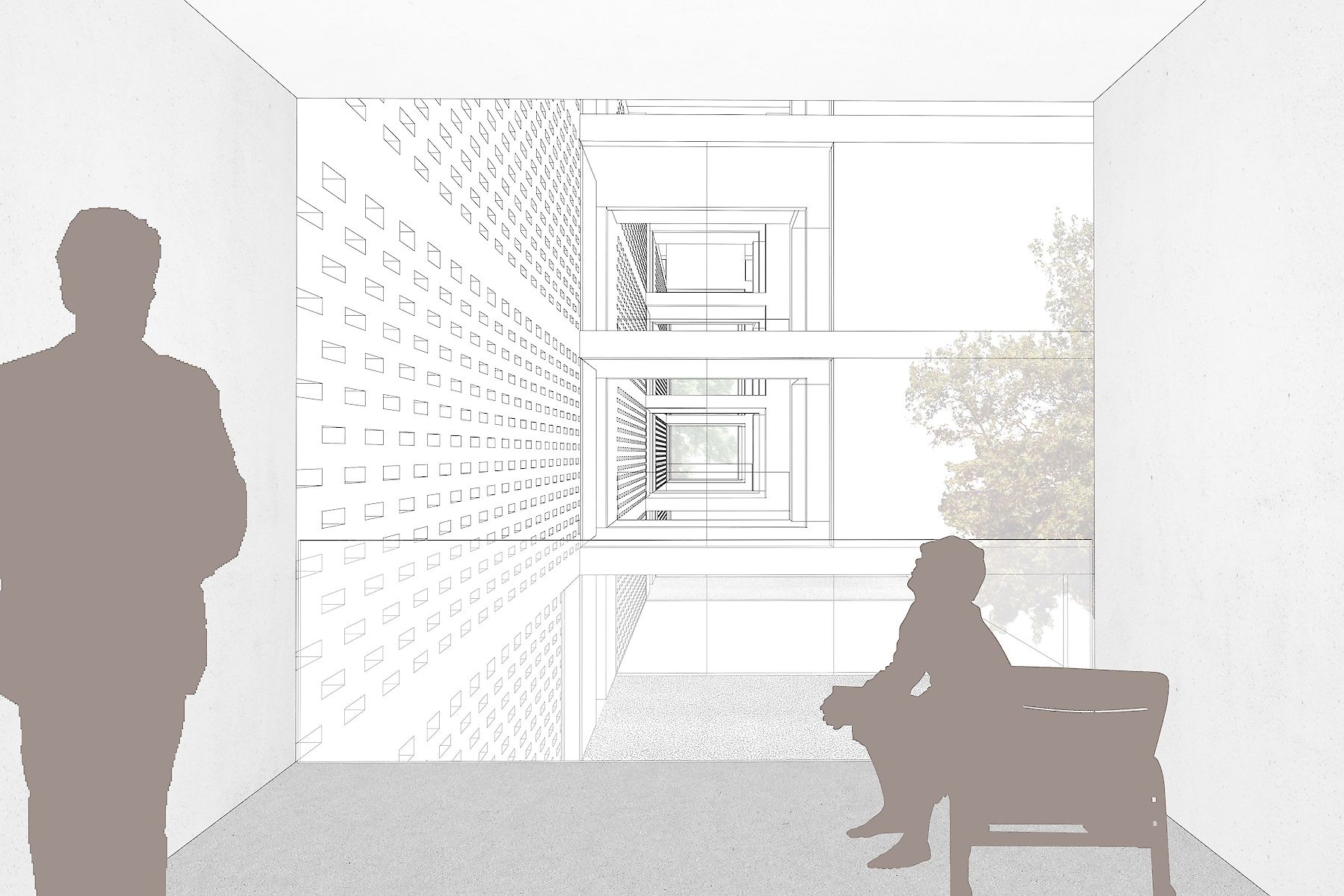 Mit seiner Anordnung bietet der Entwurf nicht nur ein differenziertes Angebot an Außenräumen, sondern ermöglicht auch mit der Ausbildung seiner Volumina eine klare Ablesbarkeit der einzelnen Funktionsbereiche innerhalb der gesamten Gebäudekontur.