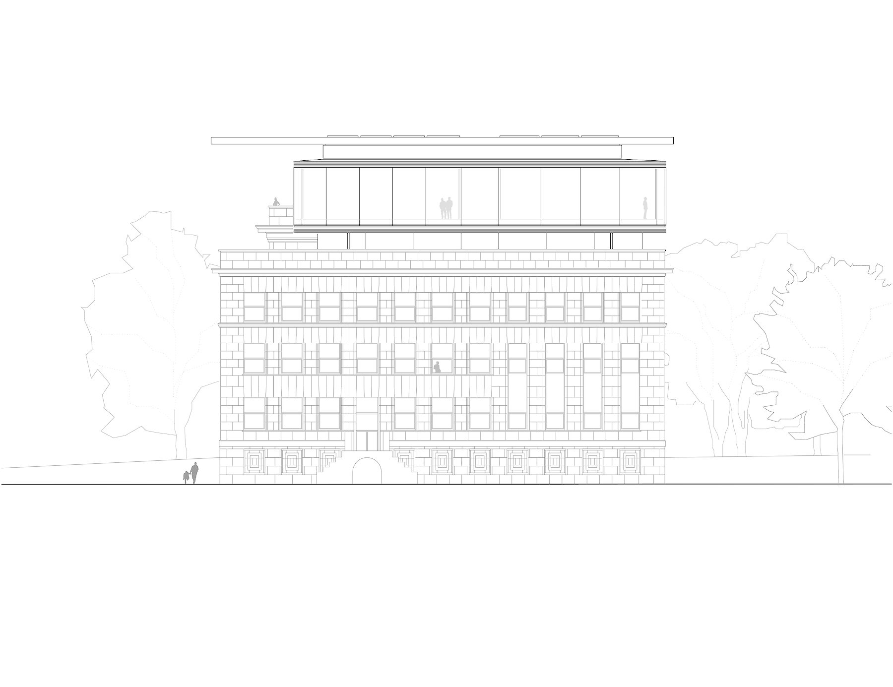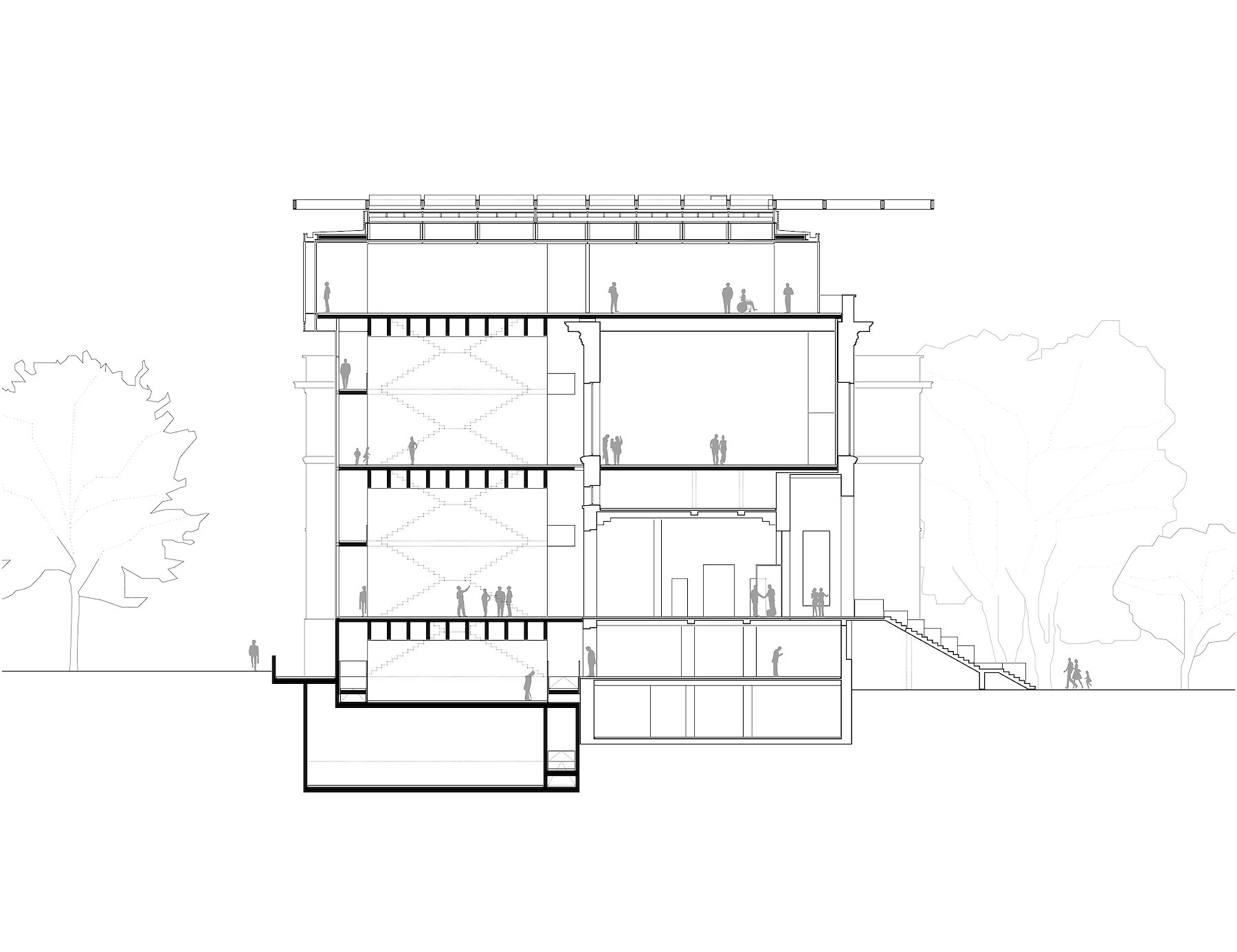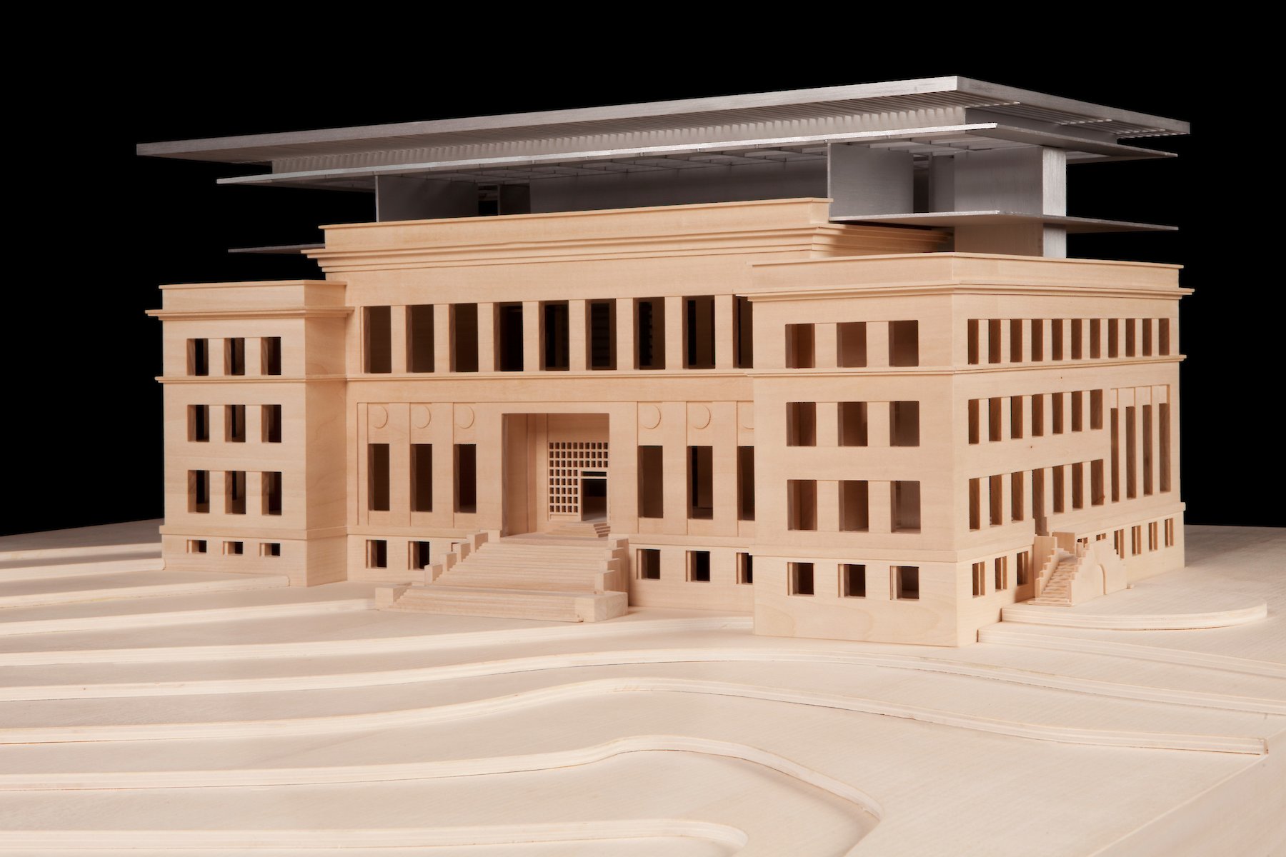 Die im Innenhof praktizierte,  ablesbare Trennung von Altbestand und neuem Eingriff, wird oberhalb der bestehenden Dachflächen ebenfalls mit einem neuen Volumen eingelöst, das den Raumbedarf für zusätzliche Ausstellungsflächen aufnimmt.  Material und Tektonik bilden hier gemeinsam einen Gegensatz, der damit zur offensichtlichen Zäsur zwischen zwei Bauphasen wird.