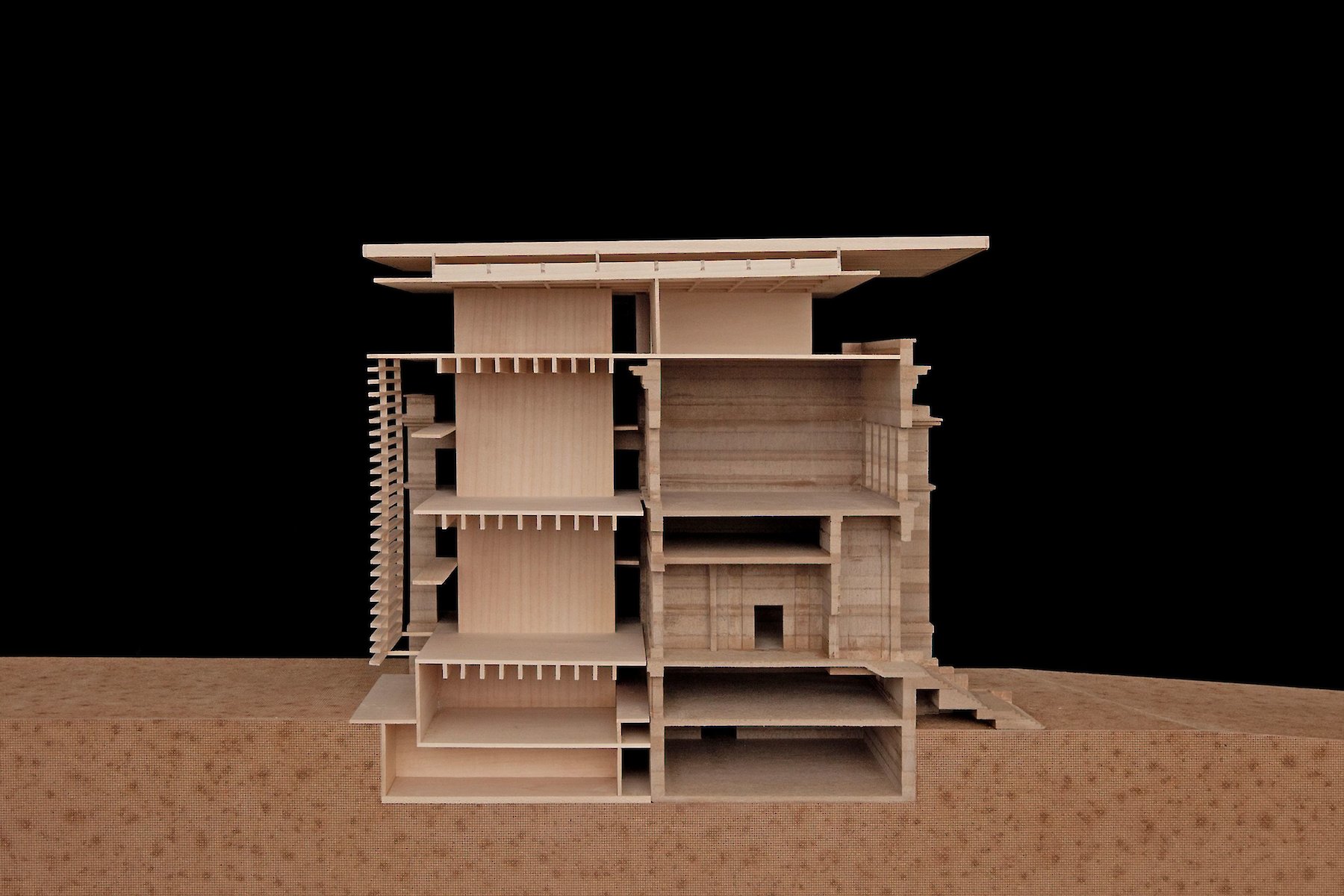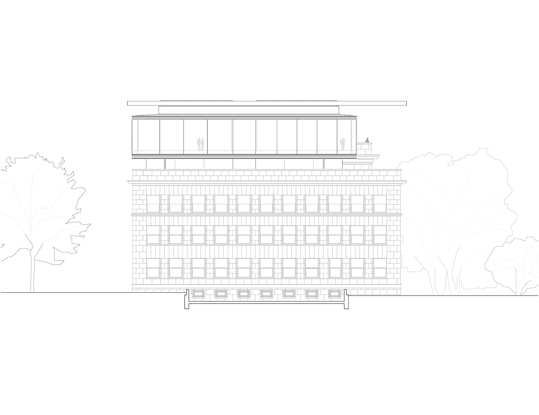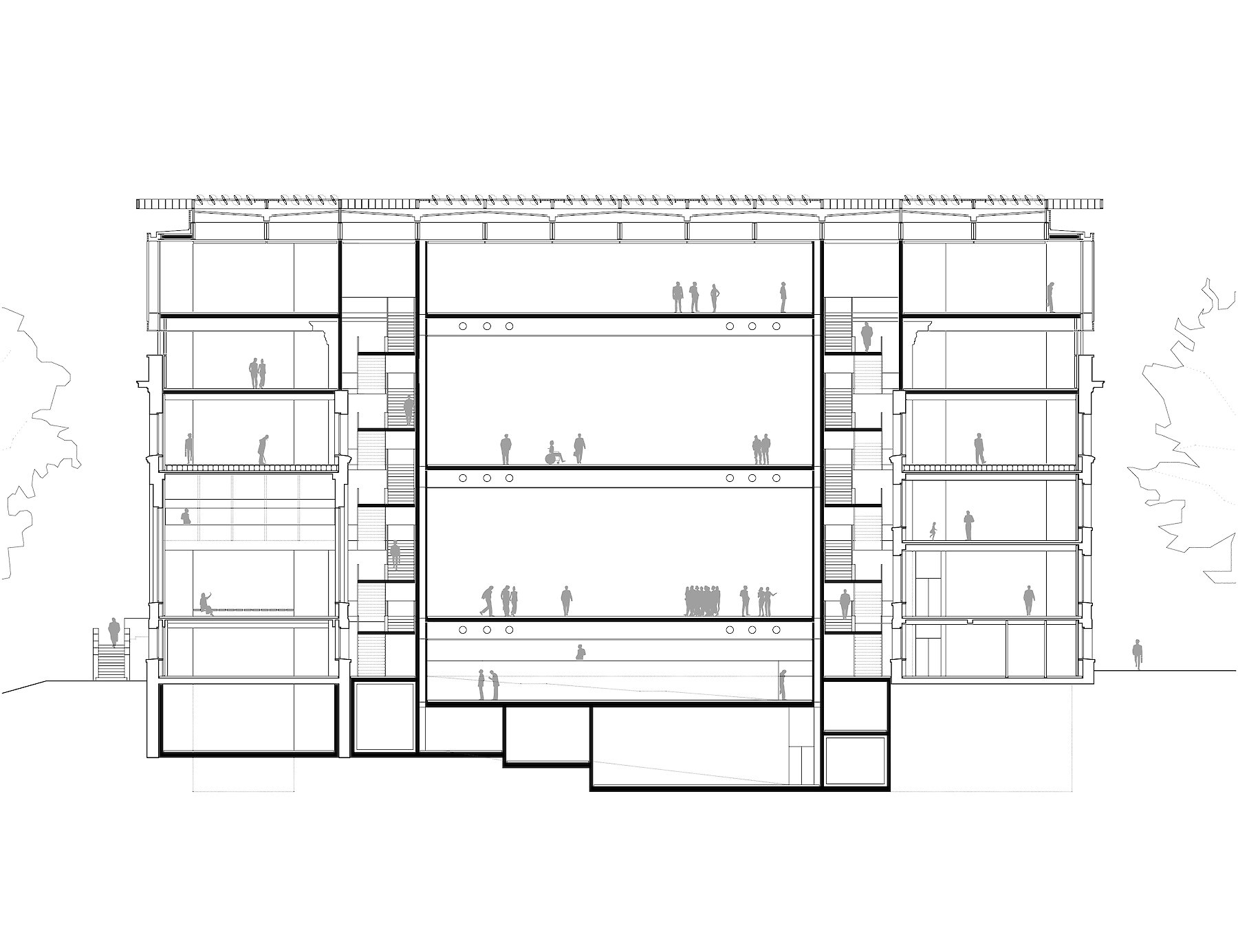Die im Innenhof praktizierte,  ablesbare Trennung von Altbestand und neuem Eingriff, wird oberhalb der bestehenden Dachflächen ebenfalls mit einem neuen Volumen eingelöst, das den Raumbedarf für zusätzliche Ausstellungsflächen aufnimmt.  Material und Tektonik bilden hier gemeinsam einen Gegensatz, der damit zur offensichtlichen Zäsur zwischen zwei Bauphasen wird.