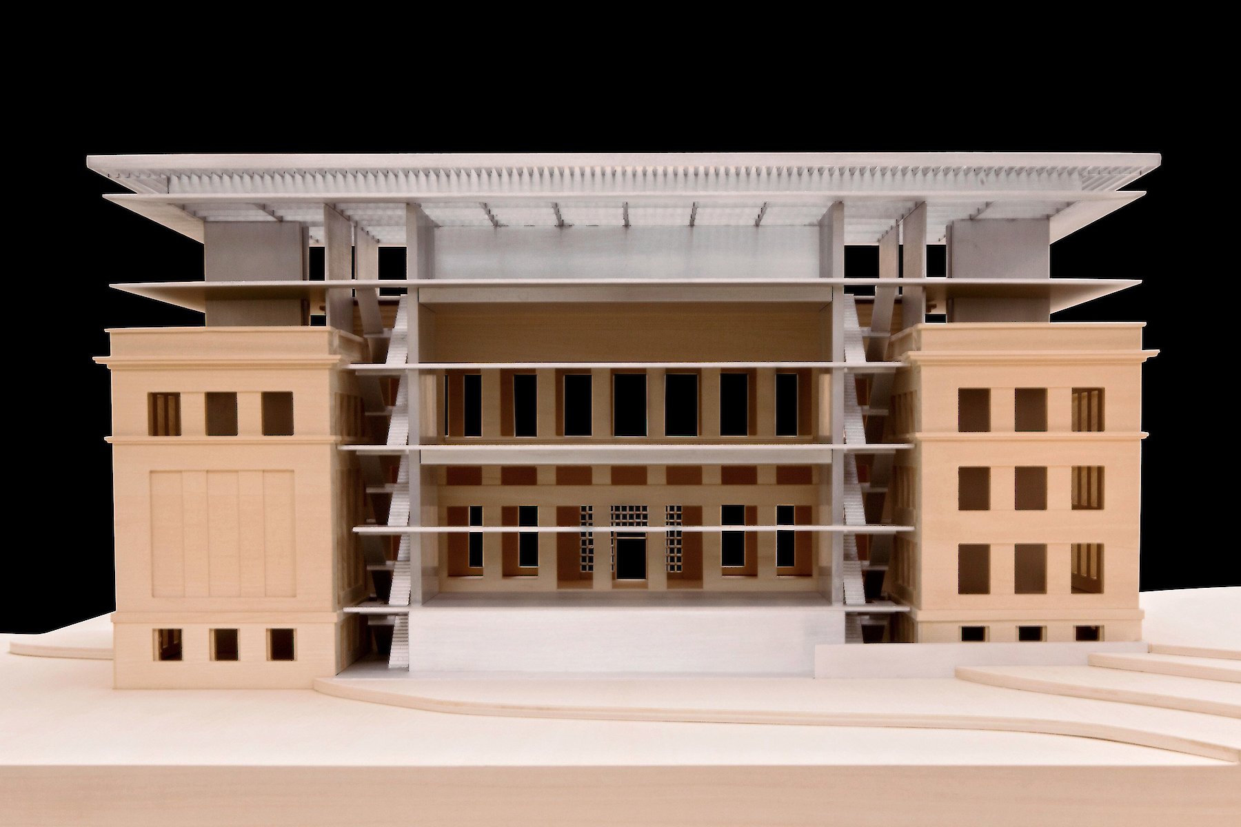 Der Einbau im Innenhof schafft eine großzügige Foyerhalle, Ausstellungsräume und zwei neue Fluchttreppenanlagen die sämtliche Ebenen des Ausstellungsgebäudes miteinander verbinden. Die Lage der Treppenanlagen verschafft den Besuchern nicht nur Orientierung und einen Überblick über die Anordnung der Ausstellungsräume, sondern sie bietet auch die Möglichkeit zu einer vielfältigen räumlichen Wahrnehmung, die von Blickbeziehungen in den Außenraum, in das Raumvolumen der Ausstellungshallen, sowie in die Tektonik der ehemaligen Außenfassaden charakterisiert ist.