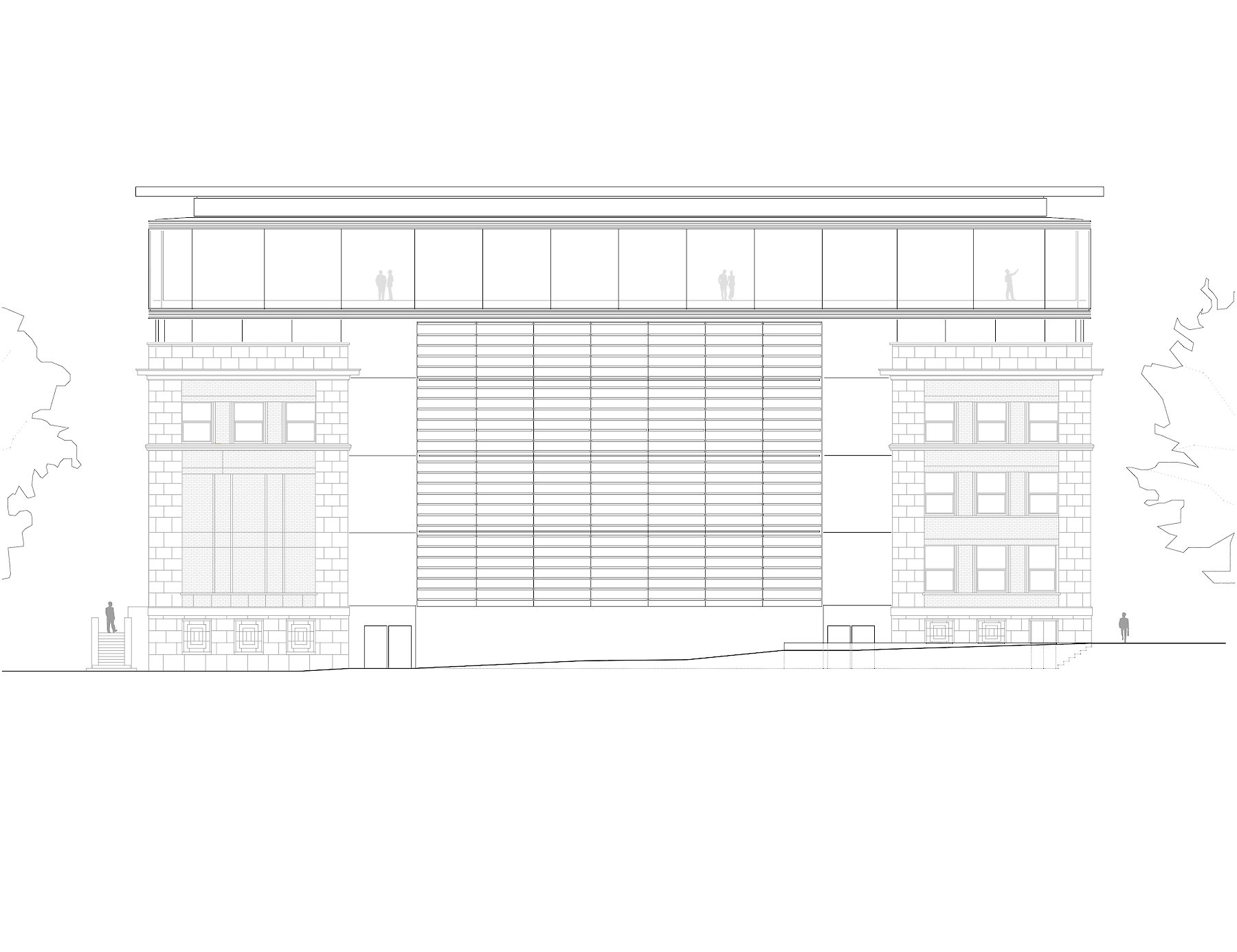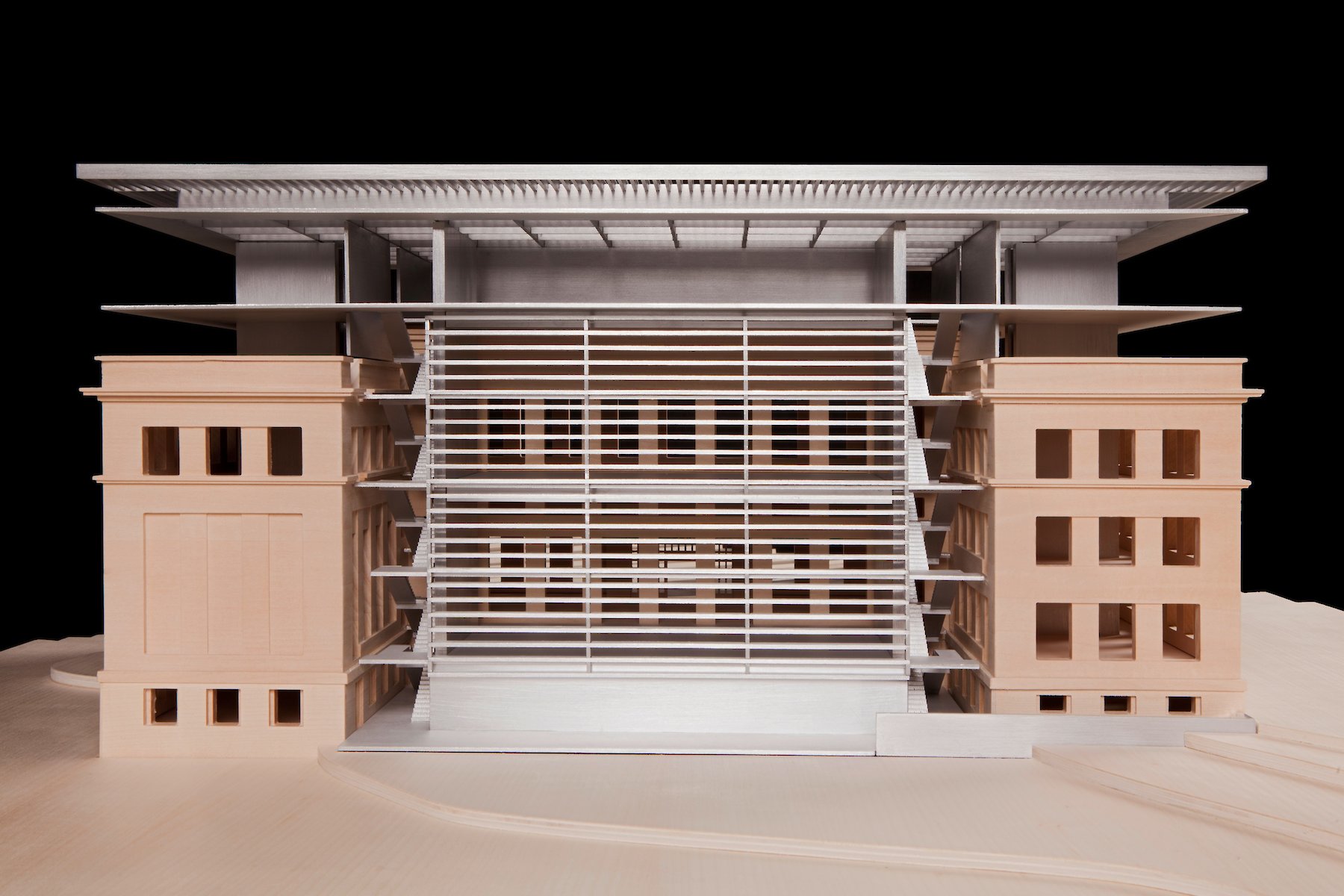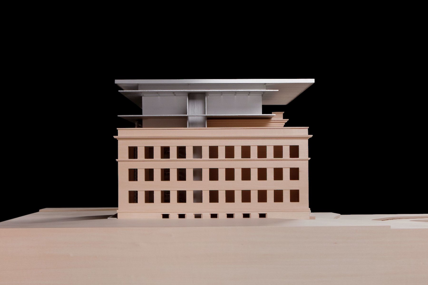 Die im Innenhof praktizierte,  ablesbare Trennung von Altbestand und neuem Eingriff, wird oberhalb der bestehenden Dachflächen ebenfalls mit einem neuen Volumen eingelöst, das den Raumbedarf für zusätzliche Ausstellungsflächen aufnimmt.  Material und Tektonik bilden hier gemeinsam einen Gegensatz, der damit zur offensichtlichen Zäsur zwischen zwei Bauphasen wird.