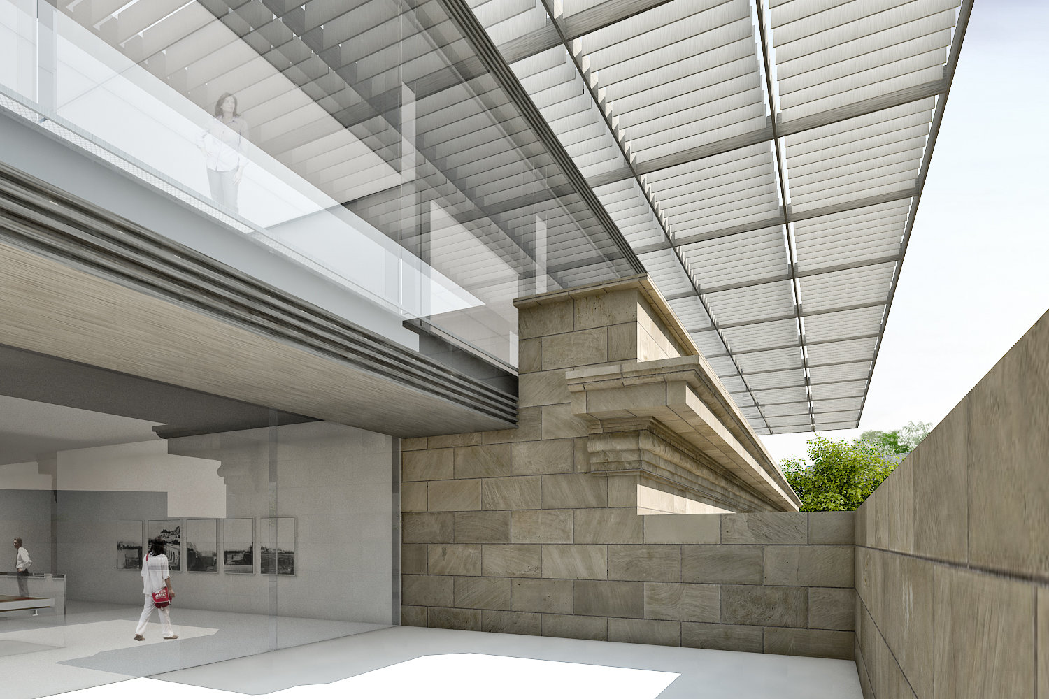 An der höchsten Stelle des Gebäudes wird auf dem gesamten neuen Ausstellungsniveau durch die Glasfassade eine Sichtbeziehung in die Nachbarschaft etabliert. Auf diese Weise ist der Rundblick in den Umgang der Besucher miteinbezogen, wird  selbst zum Exponat aber auch zum ständigen Bezugspunkt der Orientierung.